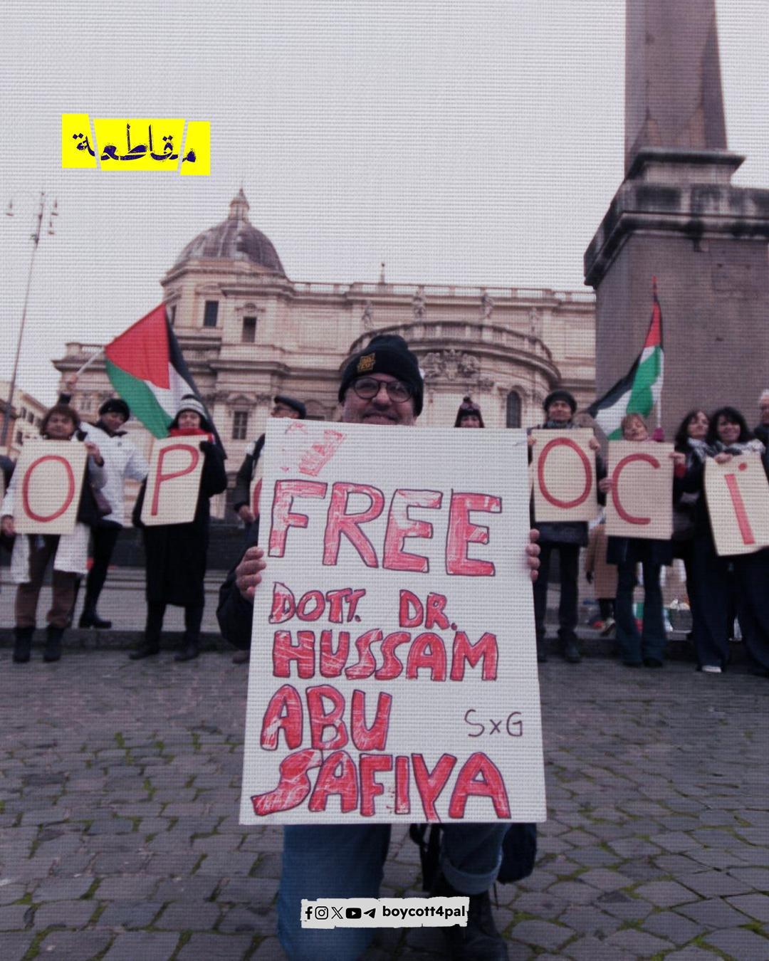نظمت جمعية "سانيتري بير غزة" في روما وقفة احتجاجية من أجل الدكتور حسام أبو صفية، مدير مستشفى كمال عدوان في غزة، الذي اعتقلته القوات الإسرائيلية قبل أيام، ومن أجل جميع العاملين الصحيين الفلسطينيين الذين استهدفهم كيان الاحتلال منذ 15 شهرًا، وندد المتظاهرون بقصف المستشفيات بقطاع غزة وتجريد المرضى والجرحى من ملابسهم على أيدي قوات الاحتلال.