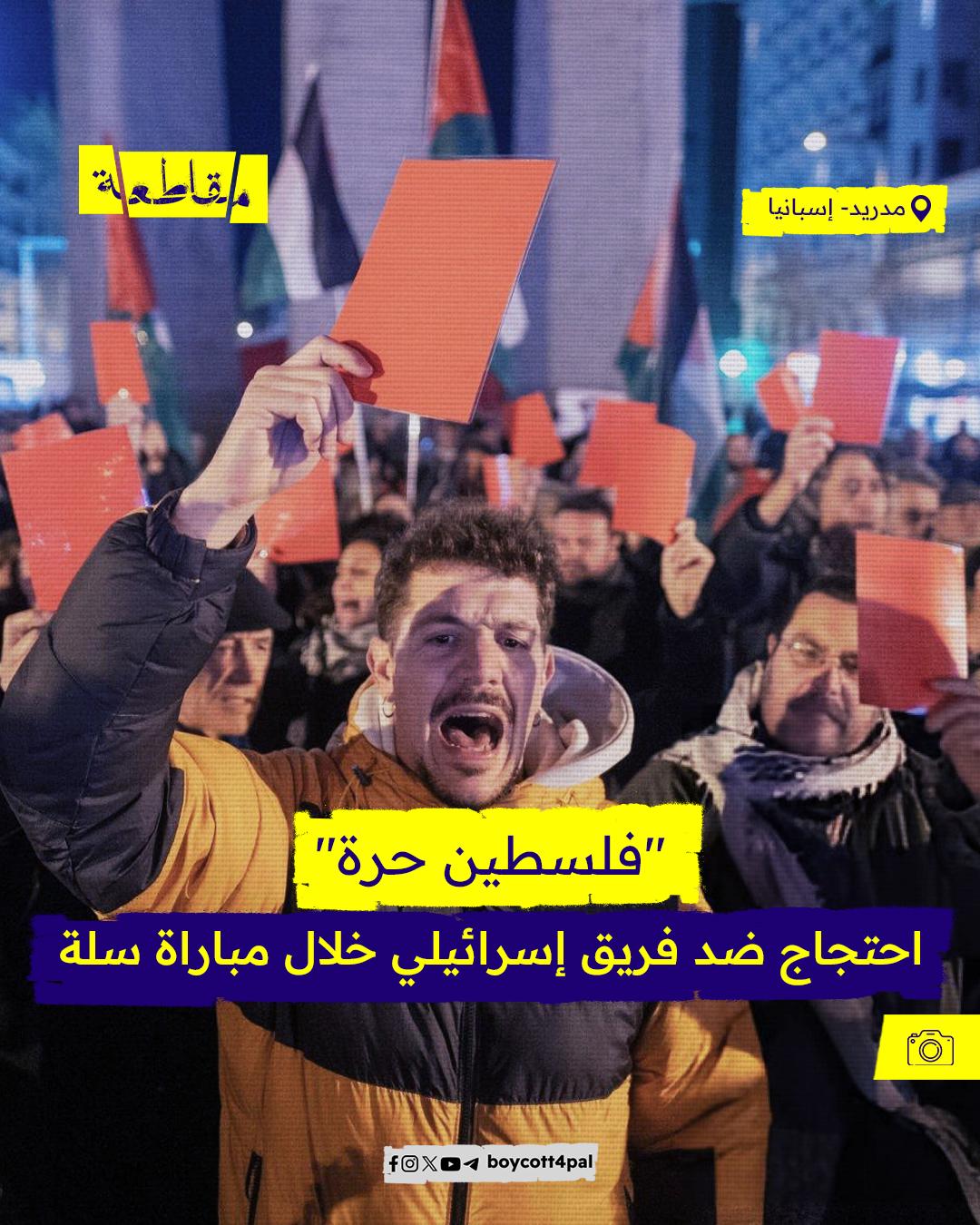 احتج العشرات من الإسبان في العاصمة مدريد ضد كيان الاحتلال قبل مباراة نادي ريال مدريد الإسباني و"مكابي تل أبيب" الإسرائيلي أمس الثلاثاء، في إطار منافسات الدوري الأوروبي لكرة السلة، واحتشد المتظاهرون تلبية لدعوة بعض المنظمات المدنية المتضامنة مع فلسطين وحزب “بوديموس” المعارض، أمام صالة “ويزينك سنتر” التي أقيمت فيها المباراة.