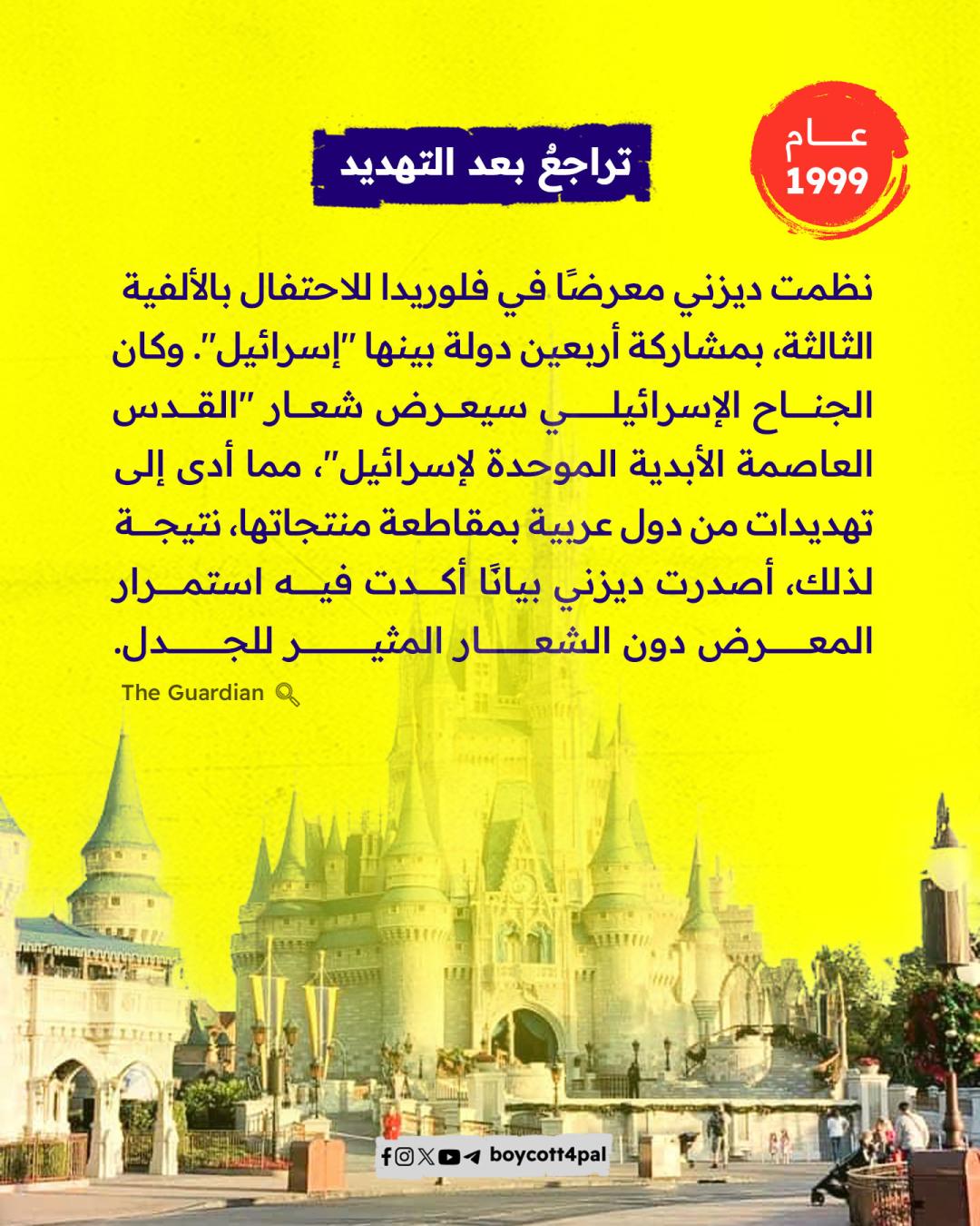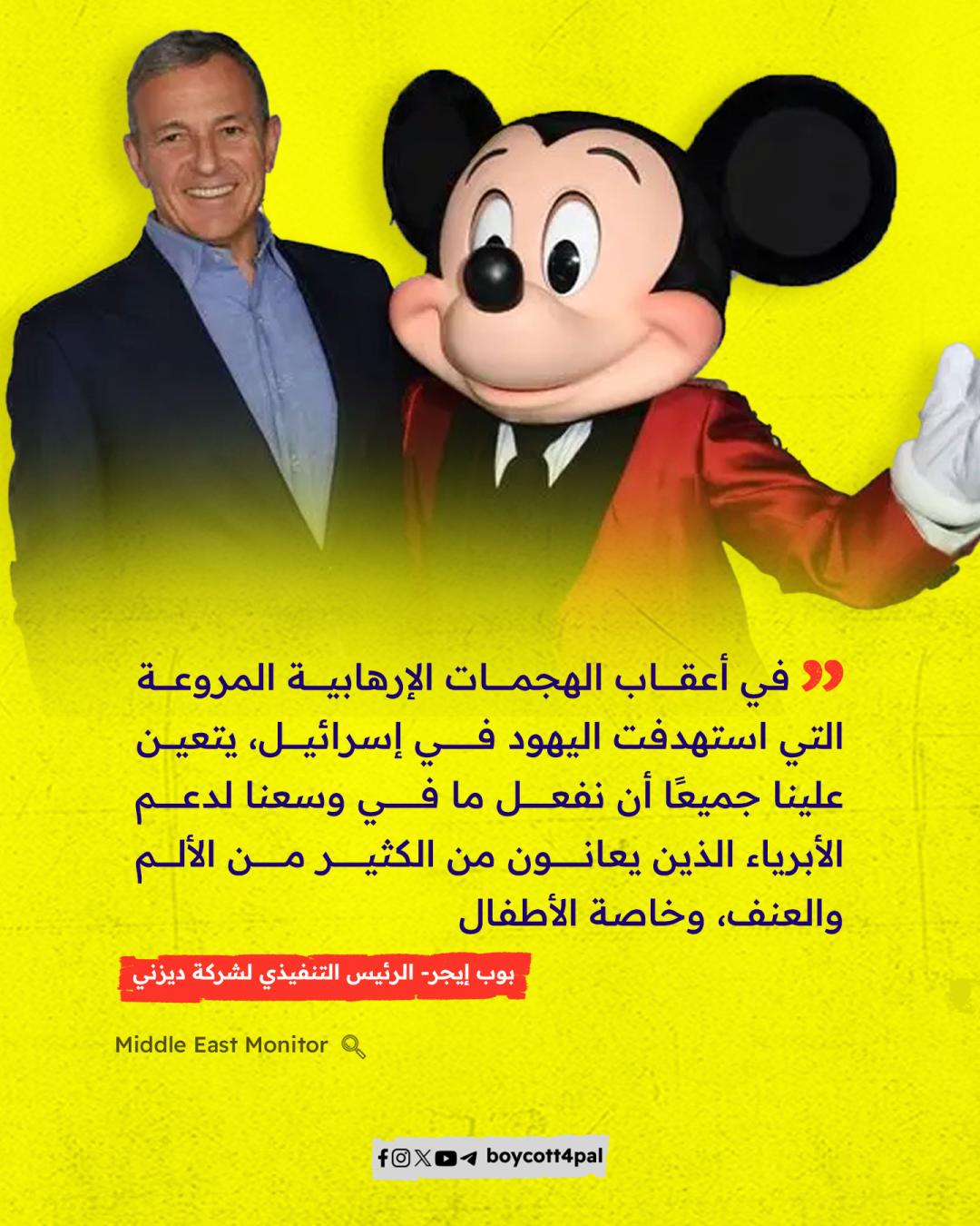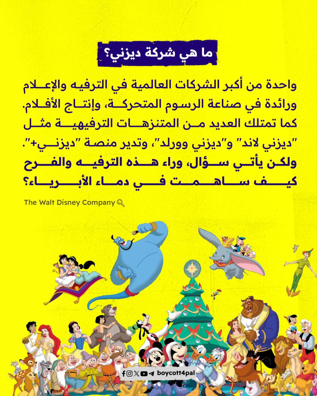 شخصيات ديزني دخلت كل بيت، وأصبح أولادنا يتعلقون بها، يقتنون ملابس شخصياتها ويقلدونها، لكن لا يمكننا أن نغفل حقيقة أنها شريك رئيسي في دعم الاحتلال الإسرائيلي، عبر استثماراتها وشراكاتها مع شركات إسرائيلية، تساهم ديزني بشكل مباشر في تمويل آلة الإبادة التي تقتل وتدمر الشعب الفلسطيني. لذلك، المقاطعة ليست مجرد خيار بل ضرورة، كون ديزني تلعب دورًا محوريًا في توفير غطاء للاحتلال تحت ستار الترفيه.