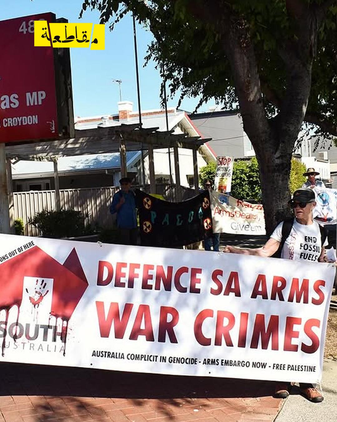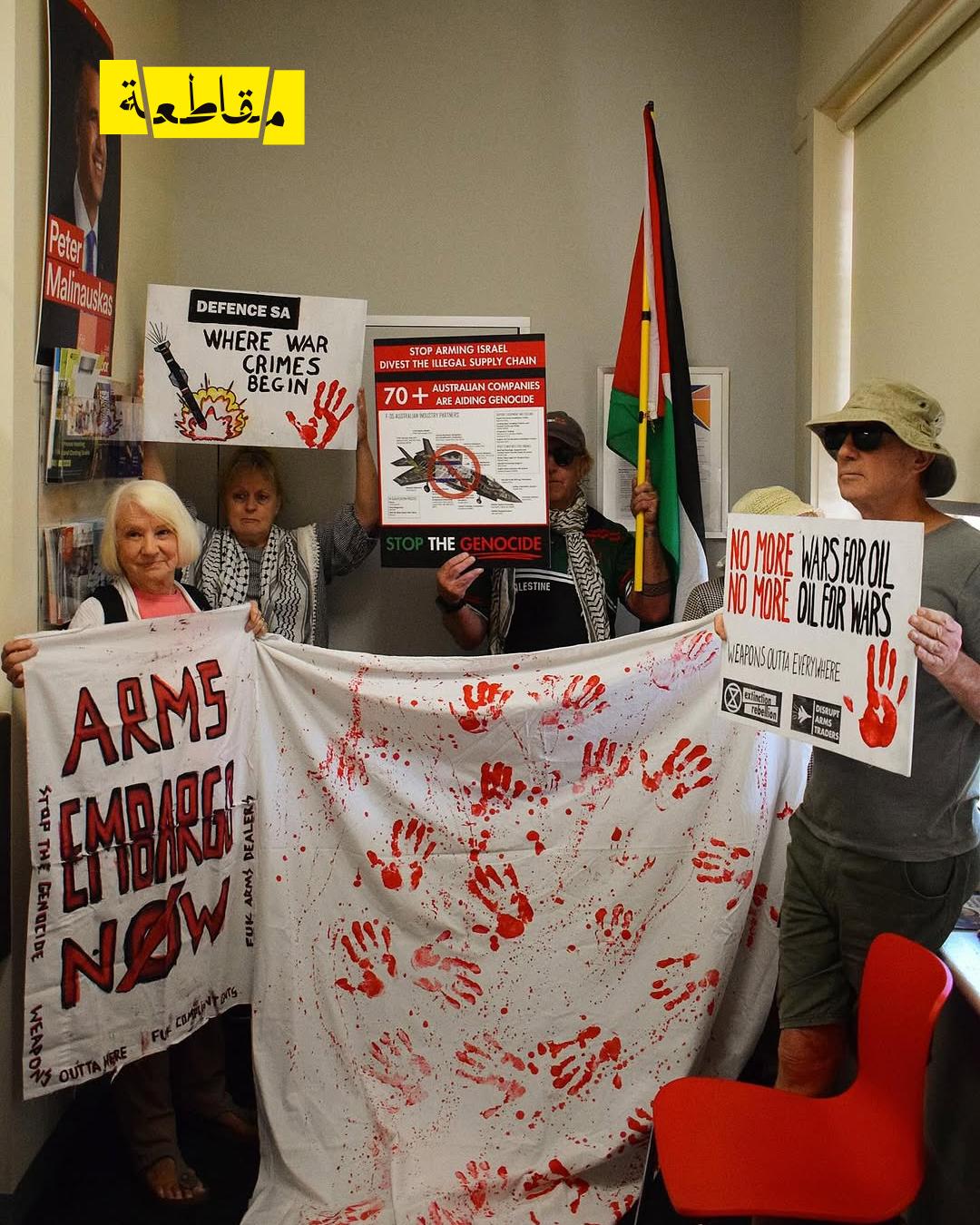 قام نشطاء مجموعة "أوقفوا الحرب" في جنوب أستراليا باحتلال مكتب رئيس الوزراء بيتر مالينوسكاس، وإغلاقه على الموظفين، احتجاجًا على إشرافه على تصدير قطع غيار طائرات إف‑35 والصواريخ الموجهة وتكنولوجيا الحرب السيبرانية، وهو ما يسهم بشكل مباشر في تمكين الحروب التي تضر الشعوب العربية والفلسطينية بشكل خاص.