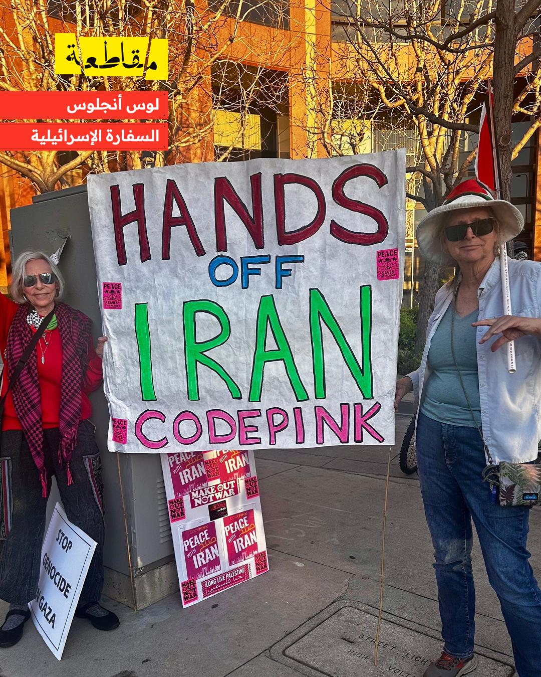 وفي لوس أنجلوس، نظمت حركة "كود بينك" وقفة أمام السفارة الإسرائيلية، مؤكدين على رفض العدوان الإسرائيلي على غزة ودعمًا للحقوق الفلسطينية، إلى جانب التعبير عن التضامن مع إيران في مواجهة ما وصفوه بالحصار والتهديدات الخارجية.