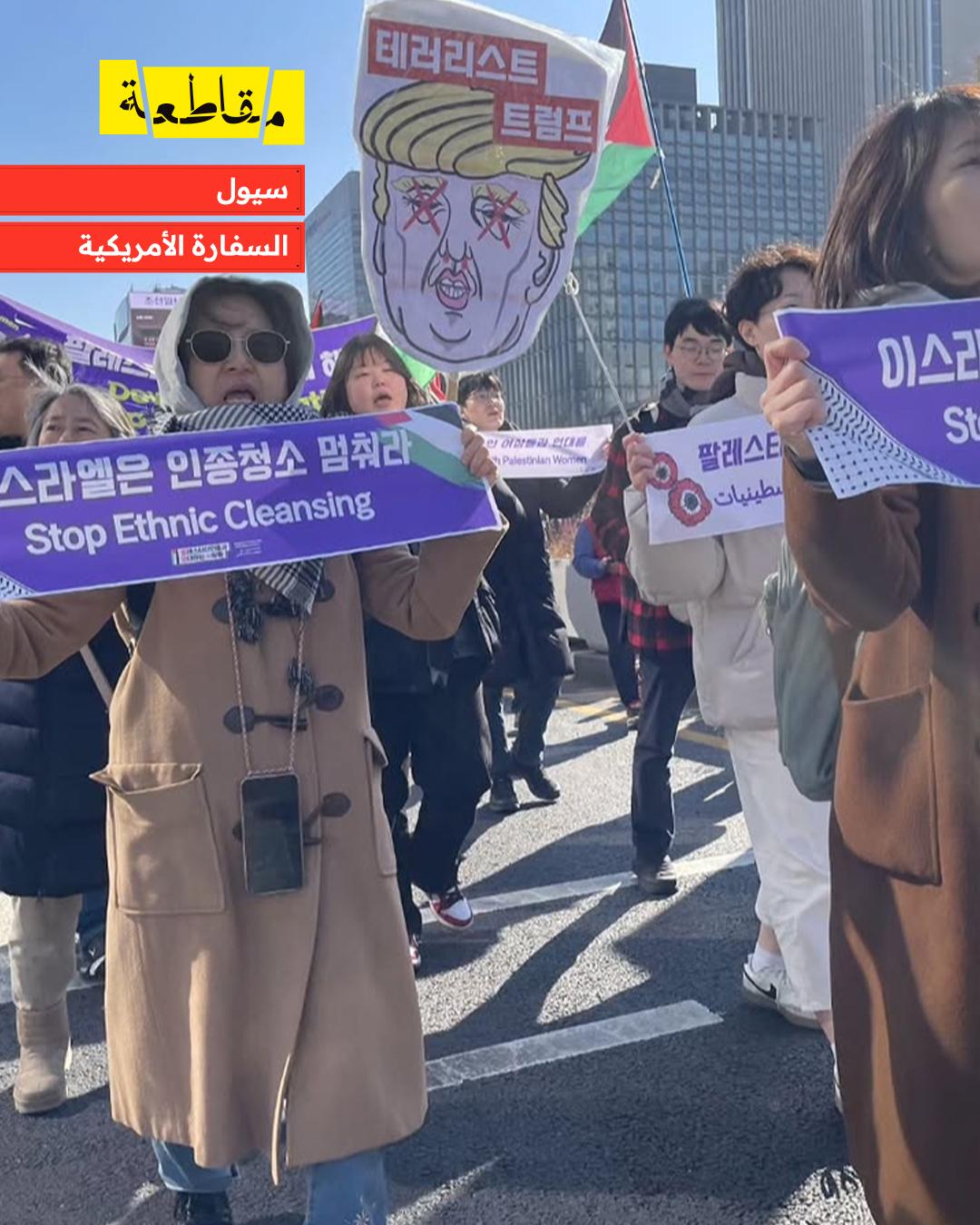 كما شهدت سيول، كوريا الجنوبية احتجاجًا أمام السفارة الأمريكية، حيث رفع المشاركون لافتات وشعارات تطالب بوقف العقوبات والحصار على إيران، وتندد بالدعم الأمريكي للعمليات العسكرية الإسرائيلية في الأراضي الفلسطينية، مؤكدين أن المدنيين هم الضحايا الرئيسيون لهذه السياسات.