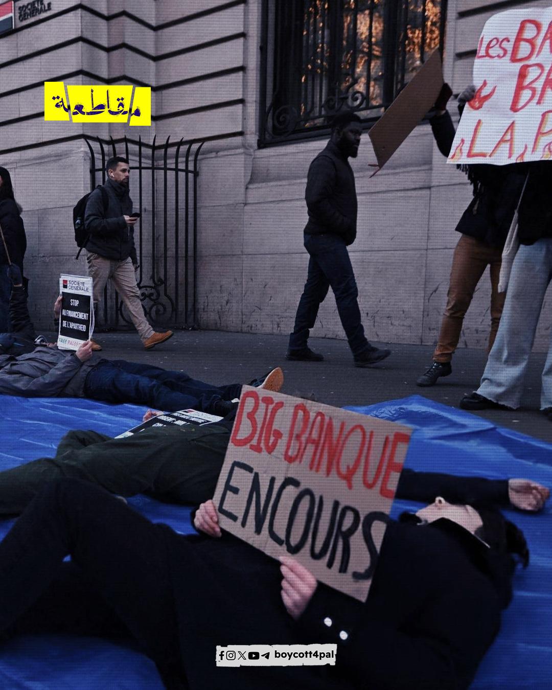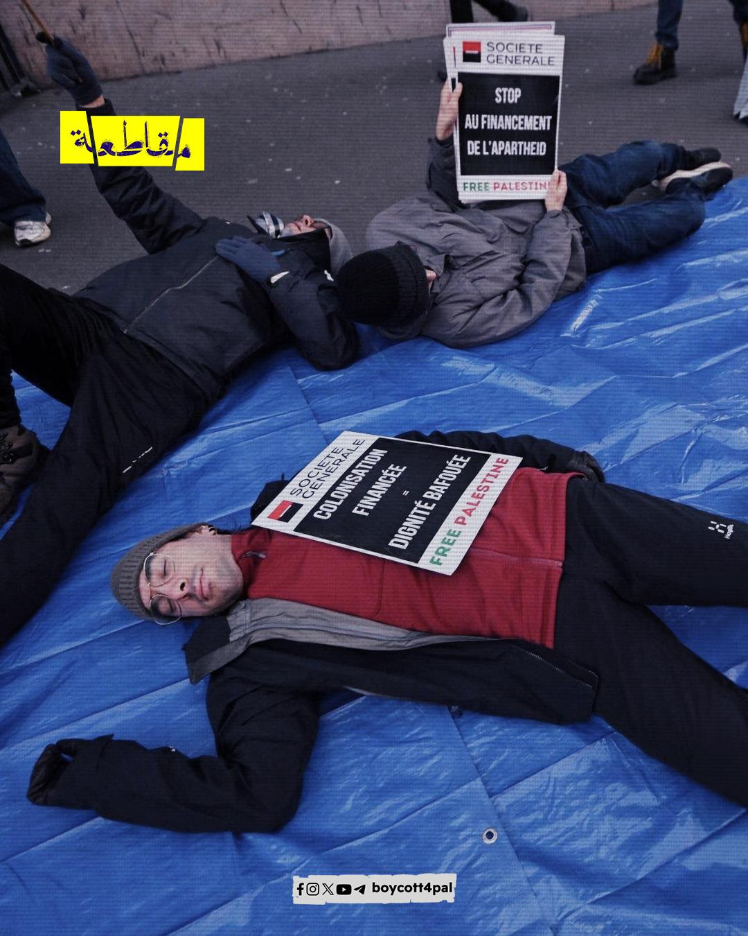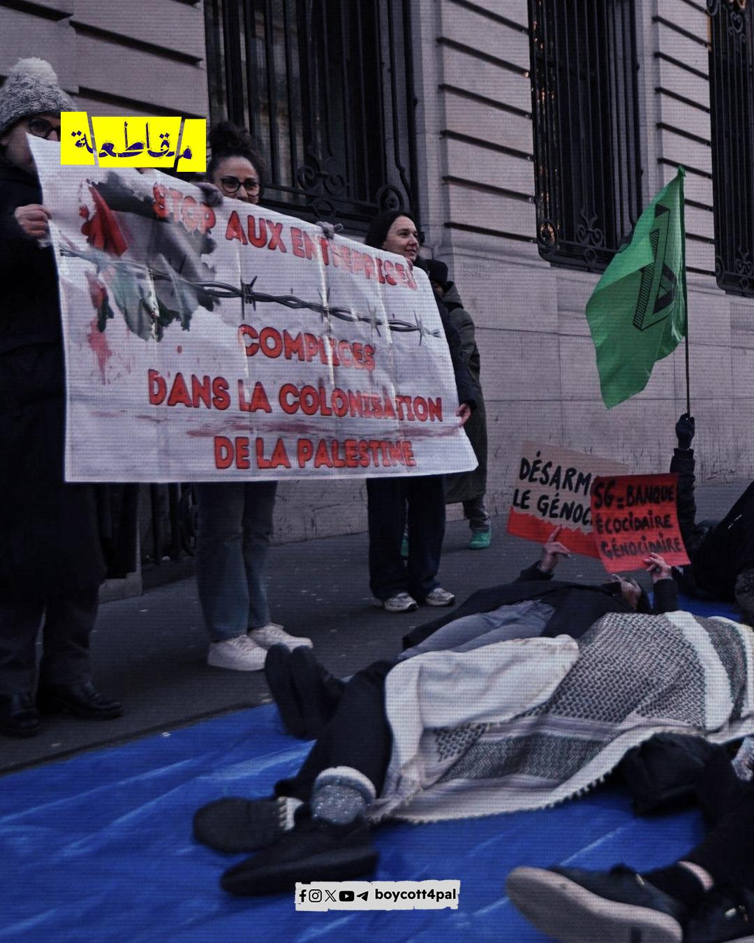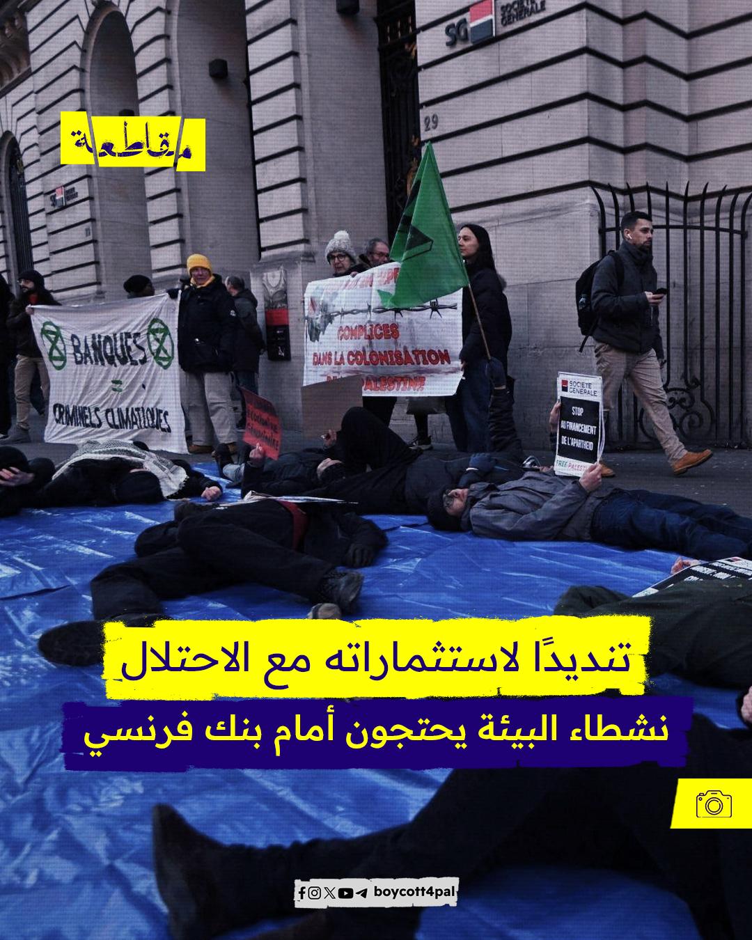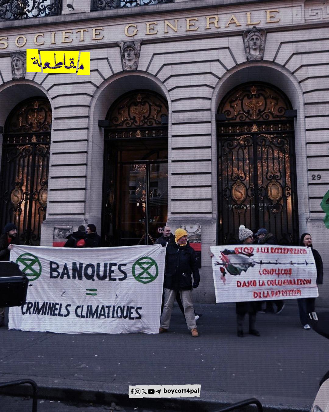 نظم ناشطون بيئيون من حركة تمرد الانقراض (XR) احتجاجًا أمام مكتب بنك "سوسيتيه جنرال" في باريس، تنديدًا باستثماراته في مشاريع تسهل الاستيطان الإسرائيلي في فلسطين. ورفع المشاركون لافتات تنتقد سياسات البنوك الفرنسية التي تدعم جرائم الاحتلال الإسرائيلي بحق أهل فلسطين.