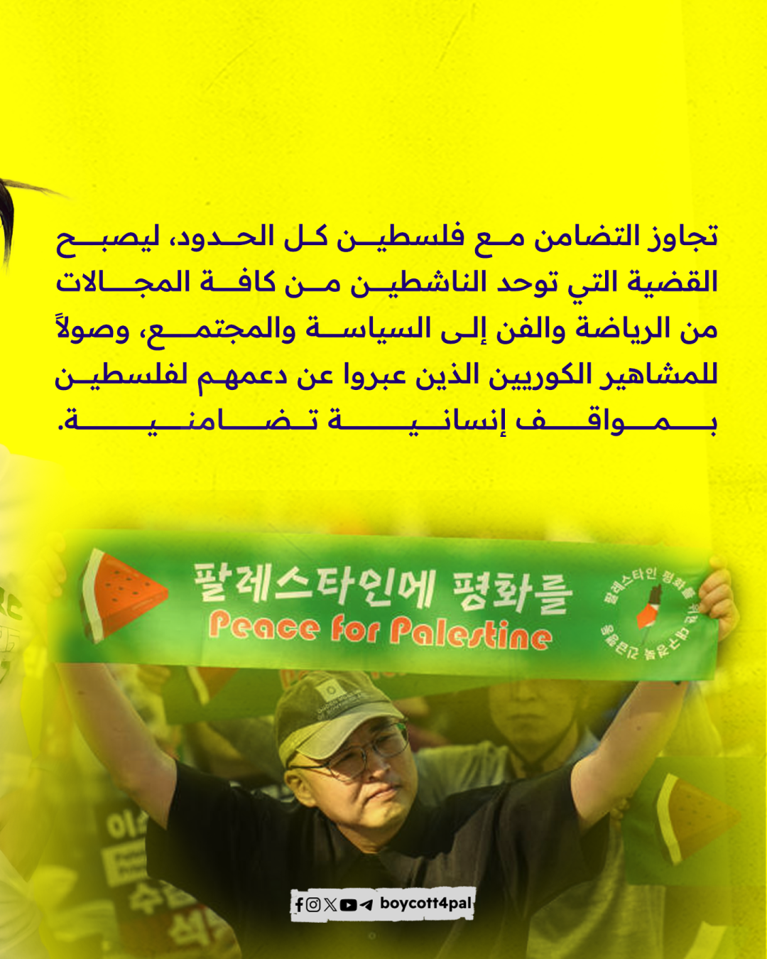 أظهر فنانو كوريا الجنوبية، بشعبيتهم الكبيرة بين الشباب عالميًا، مواقف تضامنية جديرة بالتقدير، سواء عبر التبرعات مثل "لي يونج آي"، أو الحملات التوعوية مثل "ونهو تشونغ"، وحتى التغريدات الجريئة التي تواجه التحيز مثل موقف "جاي بارك”، مثبتين بذلك أن التضامن مع فلسطين يتجاوز الحدود والجغرافيا، ويجمع بين مختلف الجنسيات والمجالات.