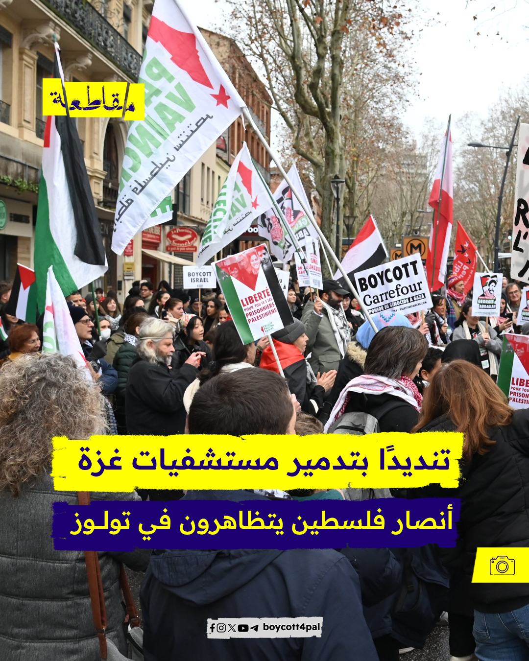 نظم نشطاء مؤيدون لفلسطين وقفة احتجاجية بمدينة تولوز الفرنسية، احتجاجًا على تدمير كيان الاحتلال للنظام الصحي في عموم قطاع غزة، وللمطالبة بالإفراج عن الدكتور حسام أبو صفية وكادره الصحي، وحمل المتظاهرون أعلام فلسطين ورددوا هتافات تطالب بوقف إطلاق النار.