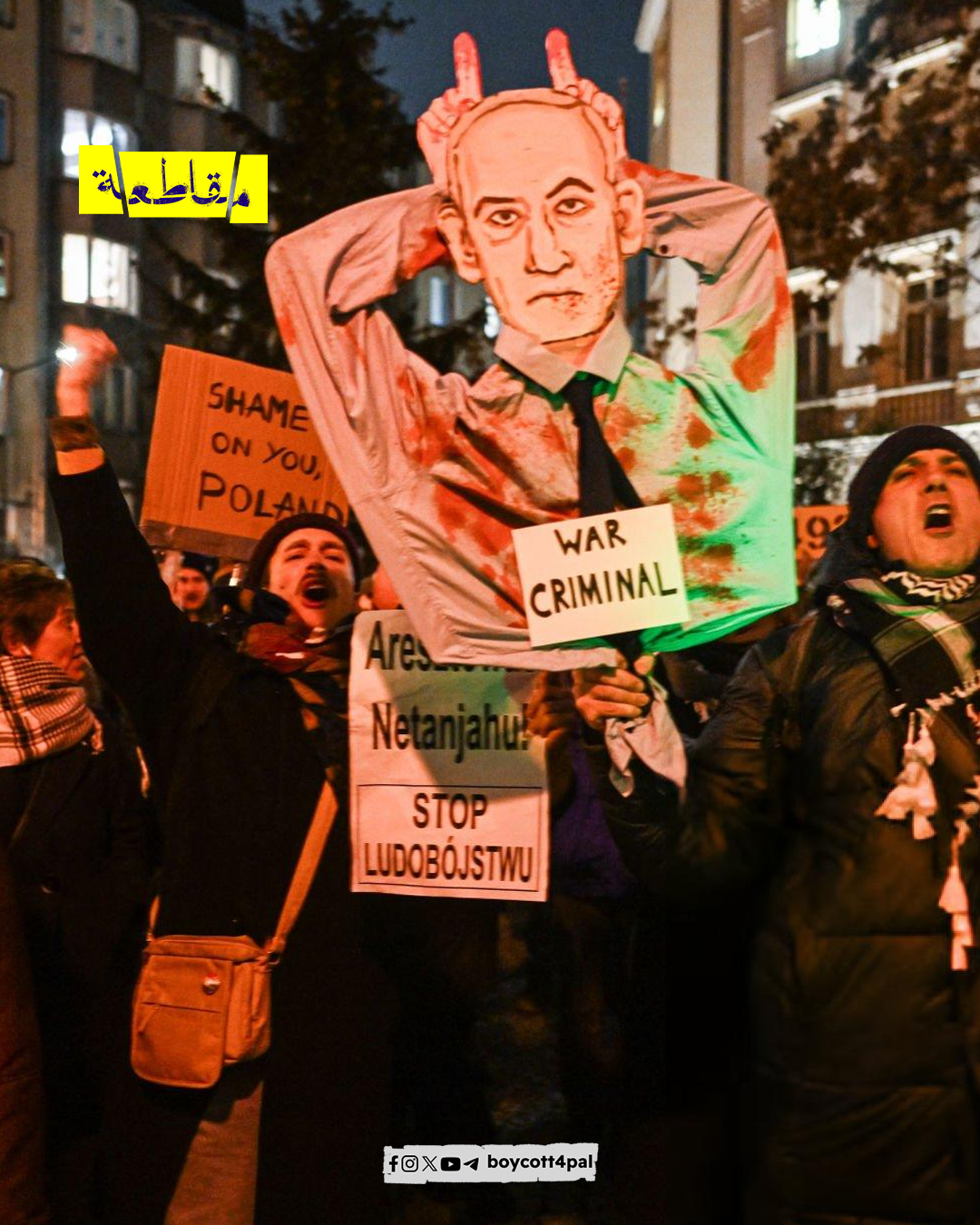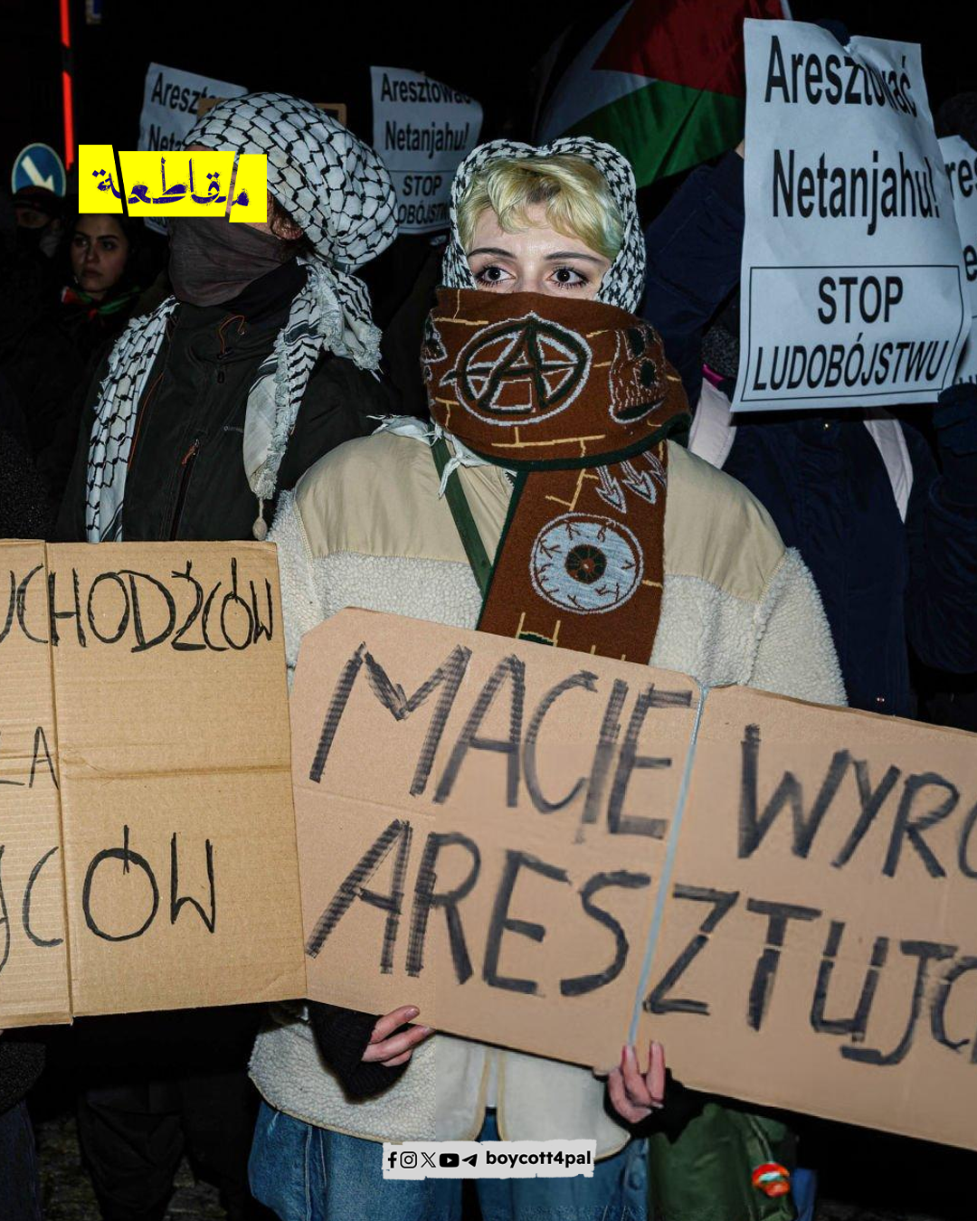احتشد مؤيدون لفلسطين في العاصمة البولندية وارسو للاحتجاج على قرار الحكومة منح بنيامين نتنياهو الحصانة من مذكرة اعتقال صادرة عن المحكمة الجنائية الدولية خلال زيارته لإحياء الذكرى الثمانين لتحرير أوشفيتز، وسار المتظاهرون إلى مكتب رئيس الوزراء، مطالبين بإلغاء الحصانة، ورفعوا الأعلام الفلسطينية ولافتات تندد بـ"مجرم الحرب" نتنياهو، ورددوا شعارات من قبيل "بيبي غير مرحب به".