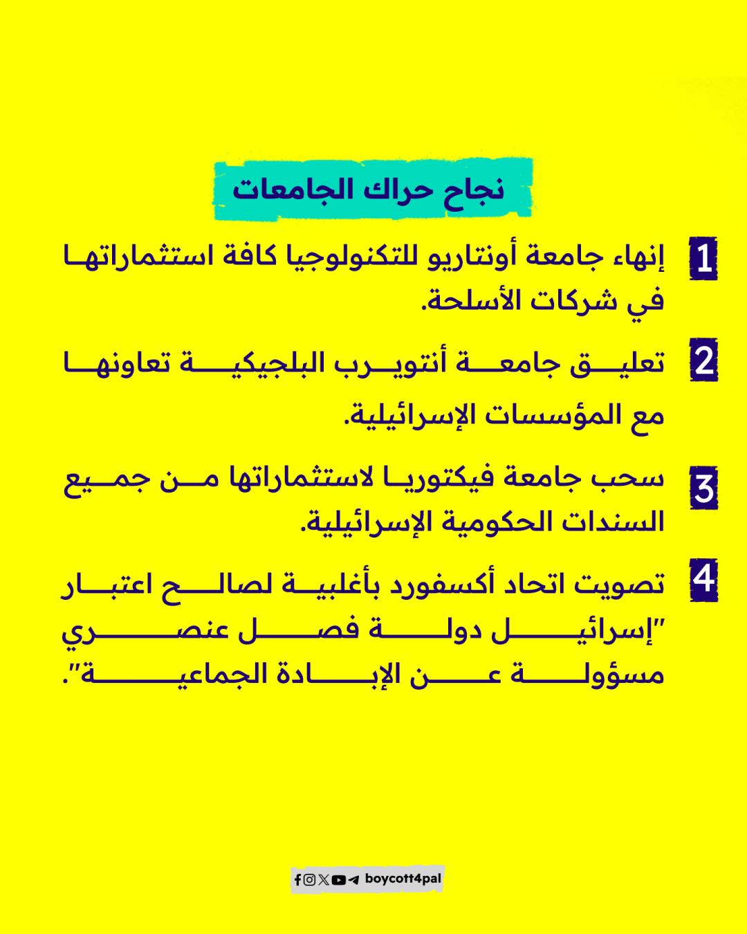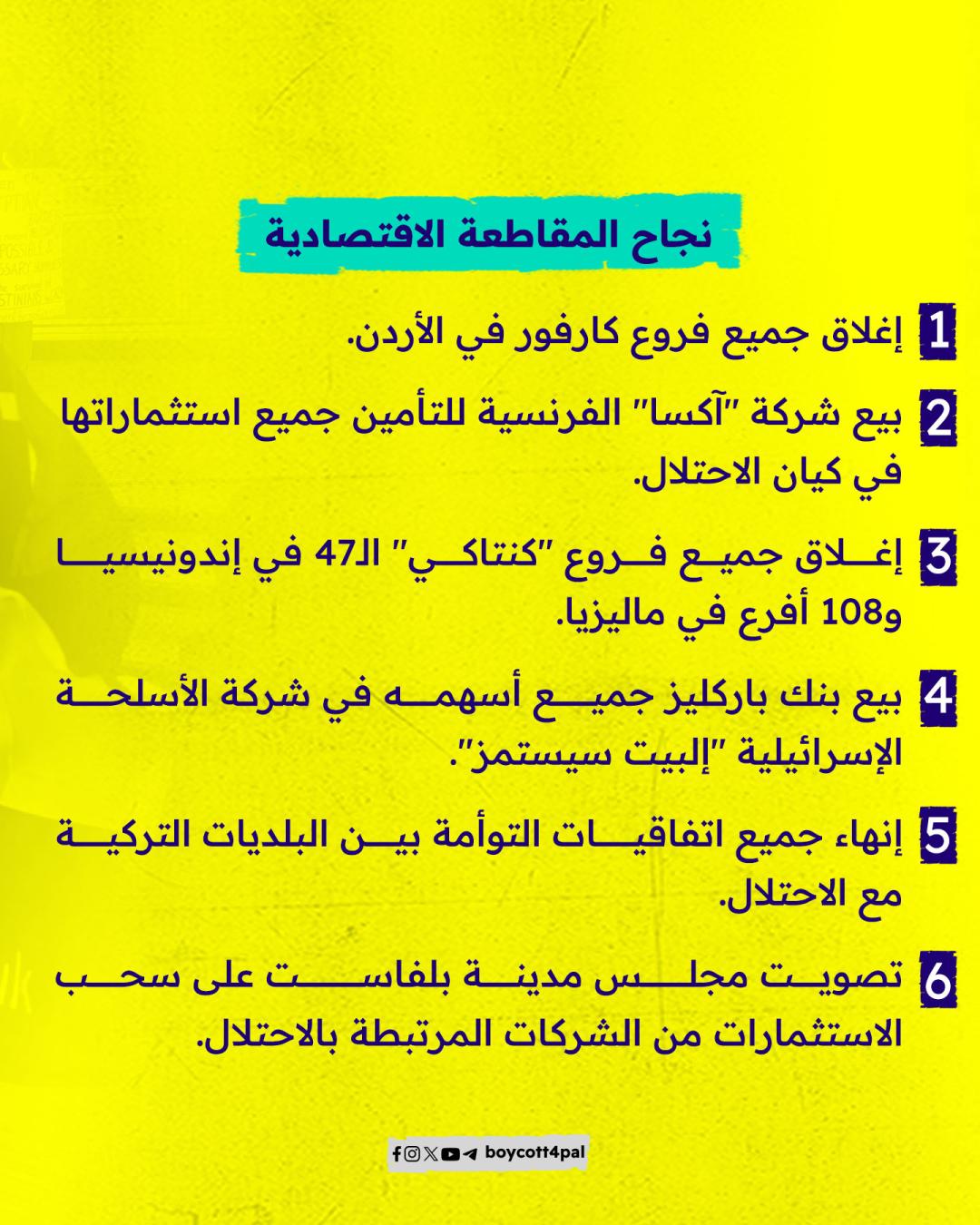 إن نجاحات مقاطعتنا للشركات الداعمة للاحتلال الإسرائيلي هي انتصار لنا جميعًا. لقد أثبتنا أن التضحية بشيء نحبه، مثل طعام أو قطعة ملابس، هي ثمن بسيط ندفعه لنعيق ولو جزئيًا في تمويل آلة القتل التي تستهدف أهلنا في غزة. إن مقاطعتنا هي رسالة واضحة بأننا لن نقبل أن نكون جزءًا من الإبادة الجماعية المستمرة. هذه النجاحات ليست فقط خطوات اقتصادية، بل هي تعبير عن كرامة الشعوب التي تضع قضية فلسطين في صدارة التزامها الأخلاقي والوطني.
