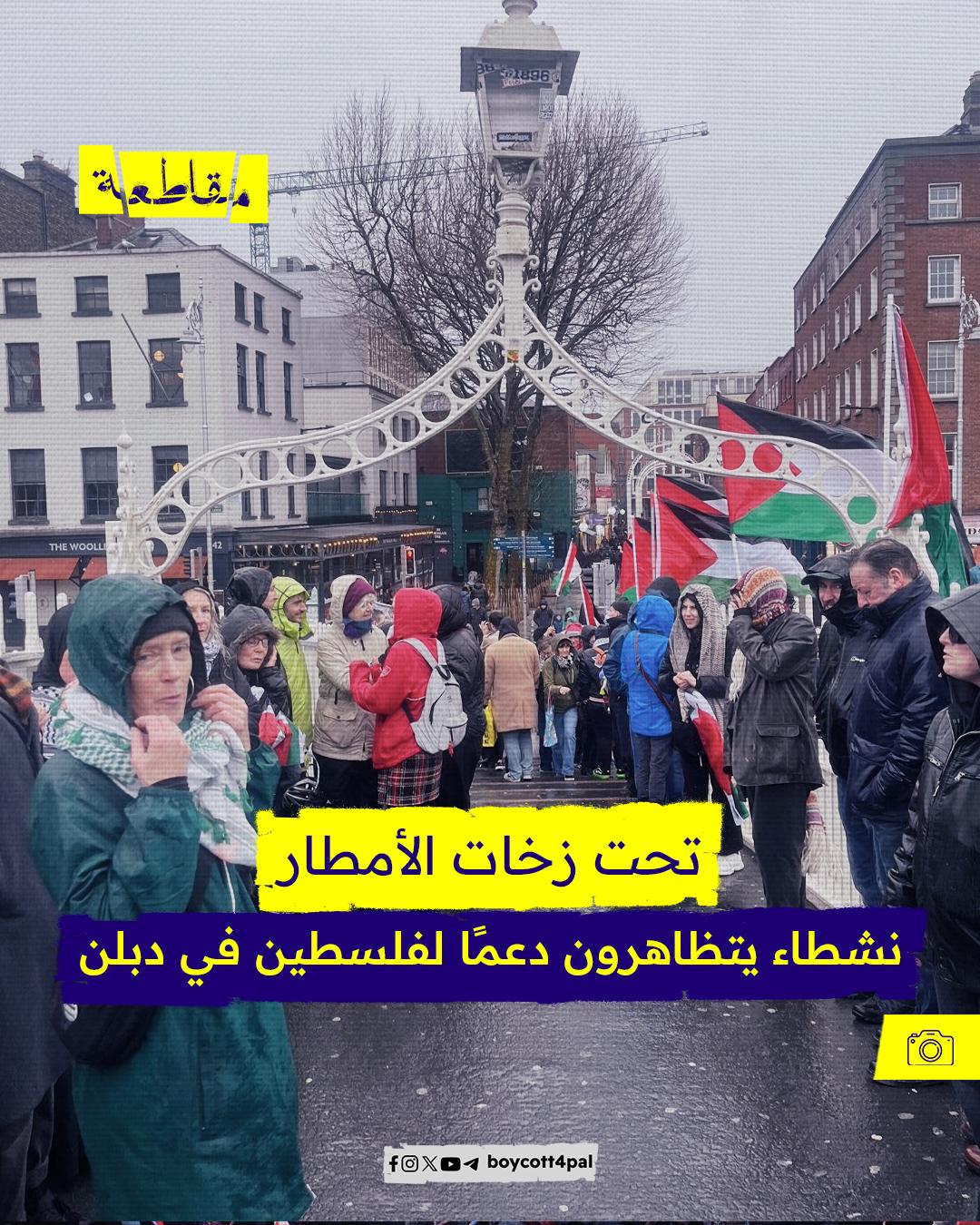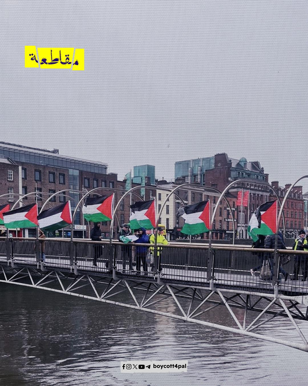 تظاهر أنصار فلسطين على جسر هابيني في مدينة دبلن الأيرلندية، استجابة لدعوة حملة التضامن مع فلسطين، لإظهار دعمهم للشعب الفلسطيني في نهاية العام رغم الأجواء الممطرة والبرد. ورفع المشاركون أعلام فلسطين ولافتة ضخمة كُتب عليها: "أيرلندا تقف مع فلسطين"، مرددين شعارات تطالب بفلسطين حرة ووقف الإبادة في غزة.
