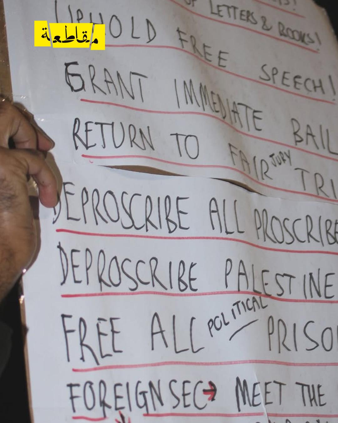 وطالب المتظاهرون الحكومة البريطانية بالاستجابة لمطالبهم بوضوح، بما في ذلك إنهاء جميع أشكال الرقابة على النشطاء المضربين عن الطعام وضمان الحق في محاكمة عادلة، وشطب تصنيف مجموعة “Palestine Action”، والإفراج الفوري بكفالة عن المعتقلين، إضافة إلى إغلاق شركة Elbit.