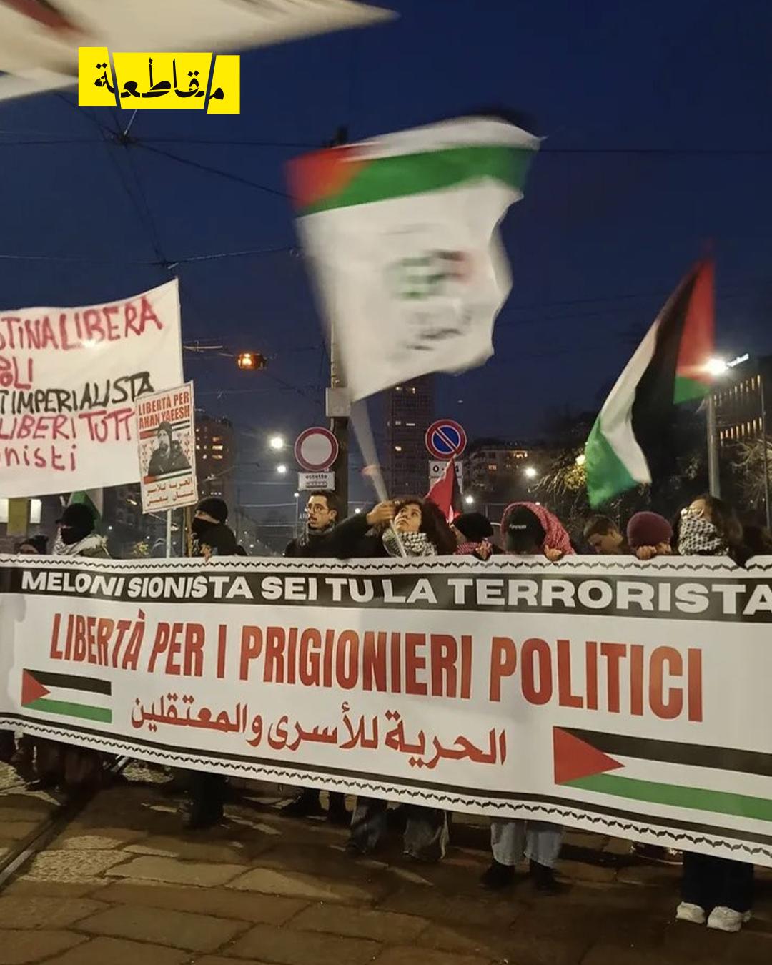 شهدت مدينة ميلانو الإيطالية اليوم مسيرة كبيرة للتضامن مع الأسرى السياسيين الفلسطينيين الذين اعتقلتهم السلطات الإيطالية في حملة وصفتها منظمات حقوقية بأنها جزء من ما يُعرف باسم “عملية الدومينو”