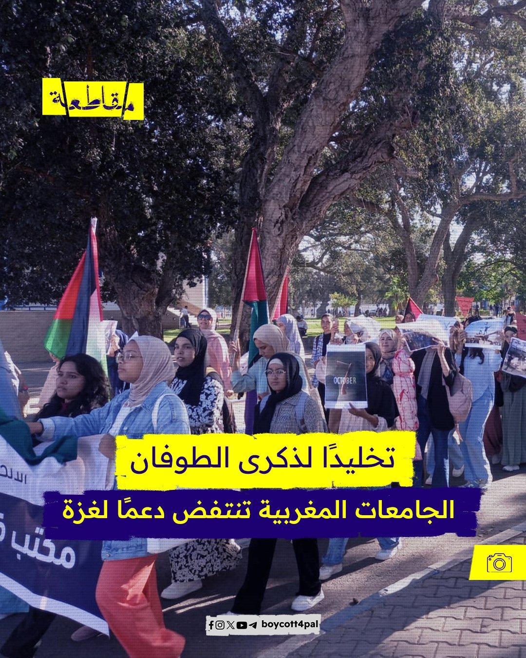 في خطوة تضامنية جديدة، وتلبية لدعوة الاتحاد الوطني لطلبة المغرب، شارك مئات الطلاب من مختلف الجامعات المغربية في مظاهرات داعمة لغزة، إحياءً لذكرى طوفان الأقصى. رُفعت الأعلام الفلسطينية ورددت الشعارات المؤيدة لفلسطين، مؤكدين من خلالها وقوفهم إلى جانب الشعب الفلسطيني في نضاله ضد الاحتلال.