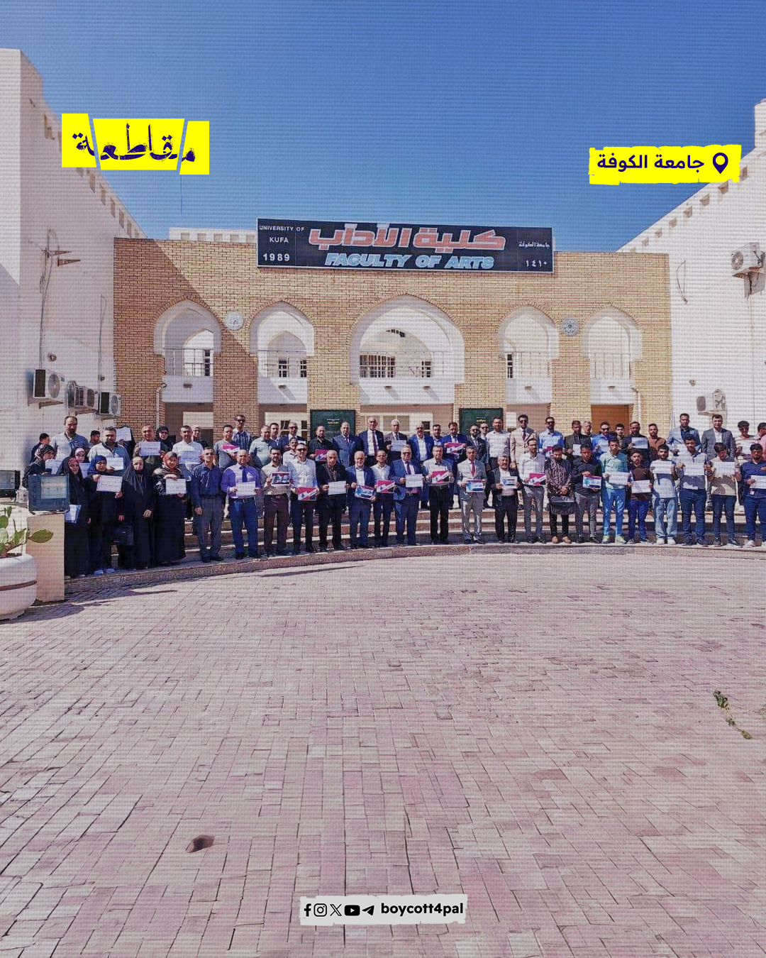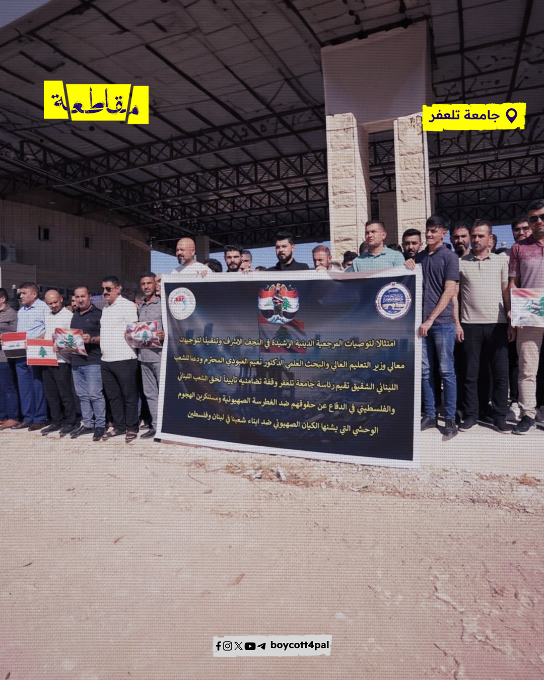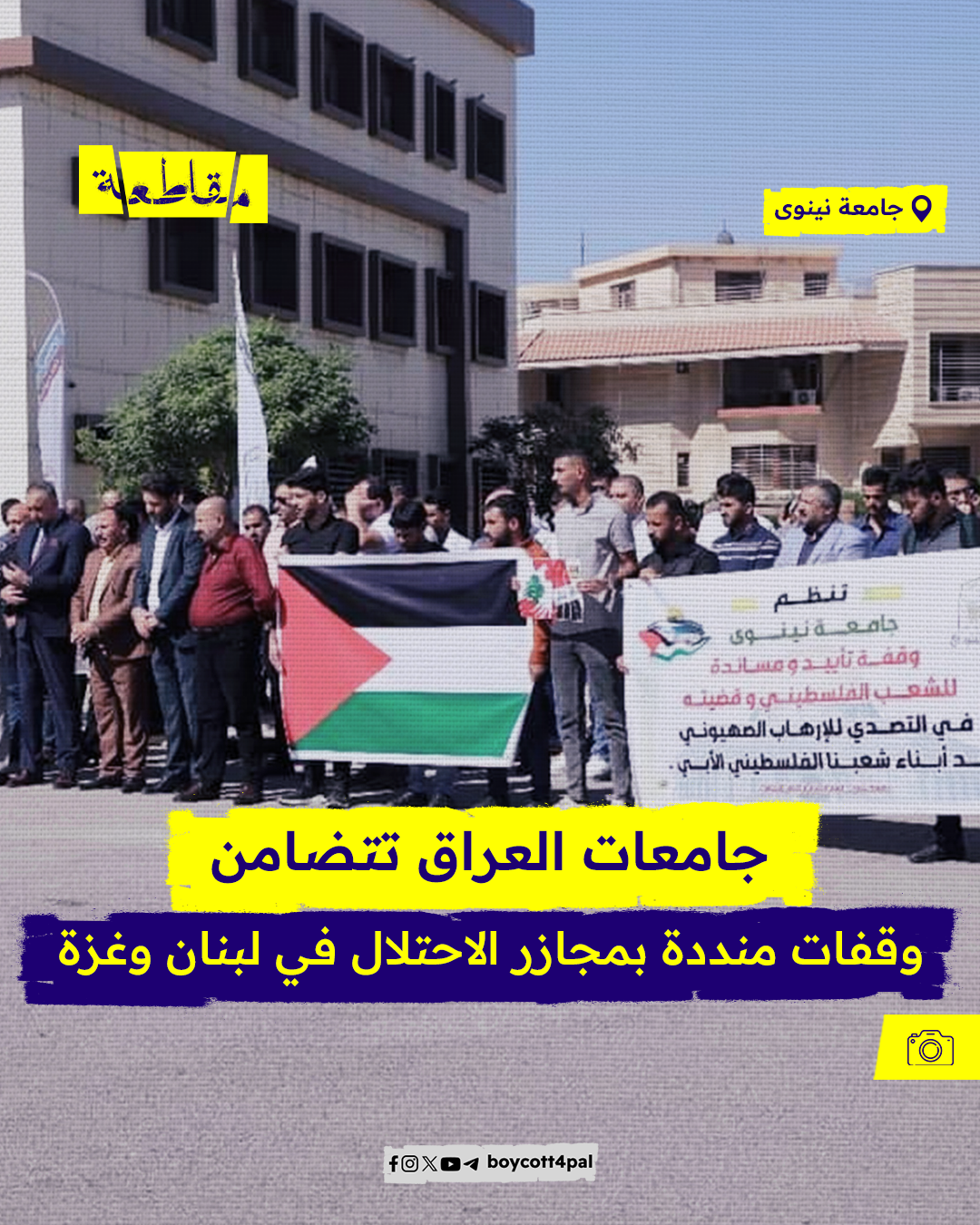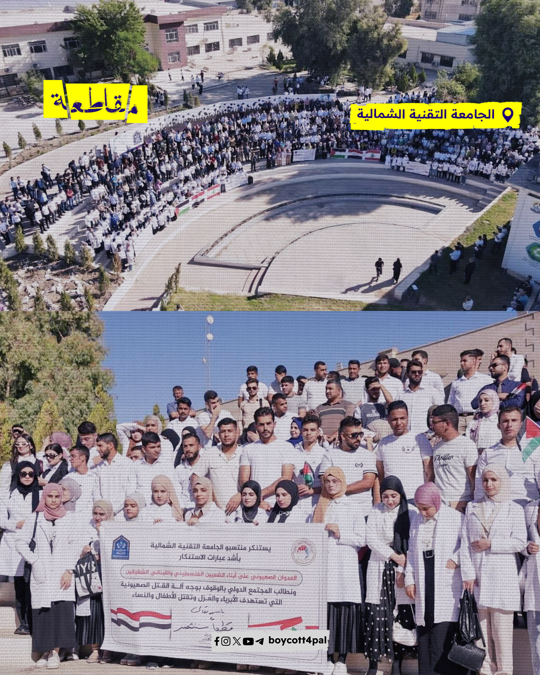 نظمت الجامعات العراقية وقفات تضامنية دعمًا للشعبين الفلسطيني واللبناني، ورفضًا للعدوان الصهيوني المستمر الذي يستهدف المدنيين ويهدد أمن المنطقة. وشارك في هذه الوقفات أساتذة وموظفون وطلبة، حيث رفعوا أعلام فلسطين ولبنان تعبيرًا عن الدعم والمساندة للشعوب التي تواجه الظلم والاحتلال.