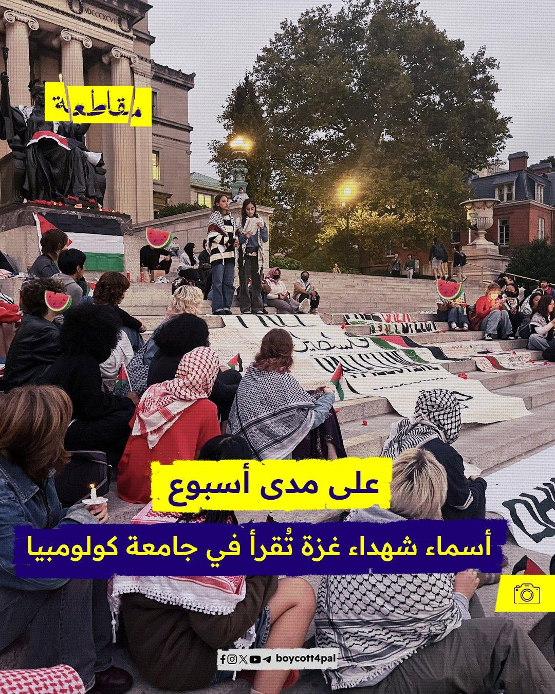 أعلنت جامعة كولومبيا عن تنظيم فعالية، انطلقت البارحة وستستمر طوال الأسبوع، يتم خلالها قراءة أسماء الشهداء الفلسطينيين في موقع داخل الحرم الجامعي low steps تهدف هذه المبادرة إلى تكريم الضحايا وتذكير المجتمع الجامعي بأن الفلسطينيين ليسوا مجرد أرقام، بل يحمل كل منهم قصة ومعاناة خاصة.