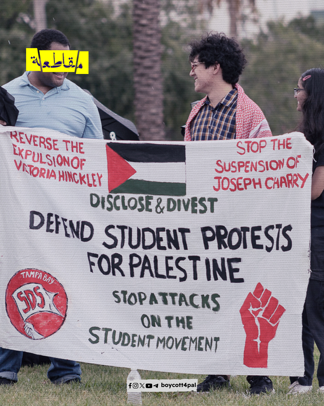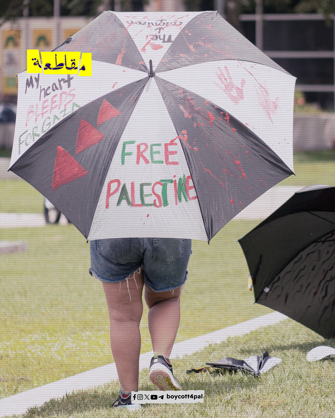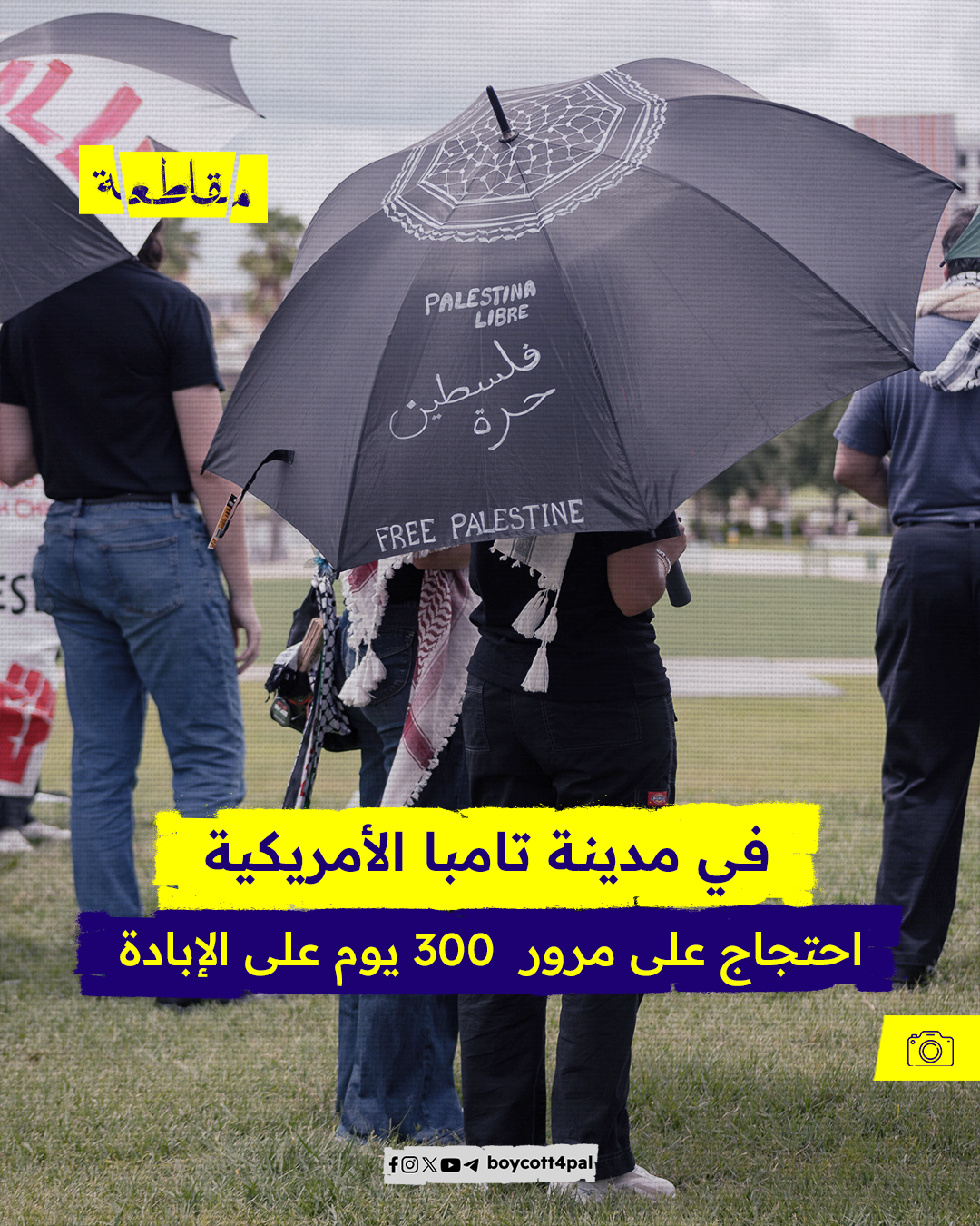 نظم أنصار فلسطين في مدينة تامبا بولاية فلوريدا احتجاج على مرور أكثر من 300 يوم على تصعيد الإبادة الجماعية التي ترتكبها "إسرائيل" في قطاع غزة، حيث قام المحتجين بتزيين المظلات بأعلام فلسطين للمطالبة بإنهاء الاحتلال والإبادة الجماعية المستمرة.