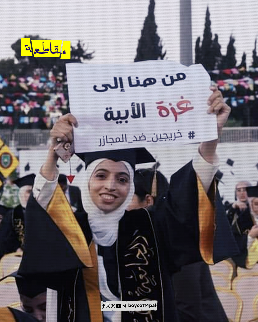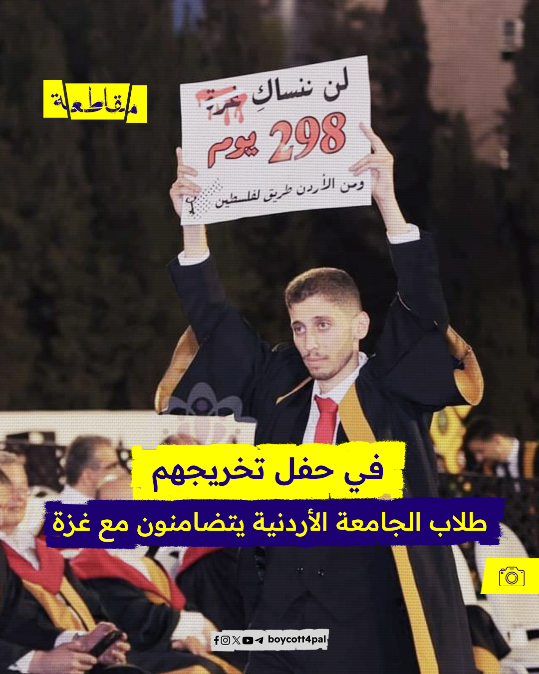 تضامن طلاب الجامعة الأردنية مع فلسطين وغزة من خلال رفع لافتات تضامنية مع الأهالي في غزة ومنددة بالإبادة الجماعية خلال حفل تخريجهم من أجل لفت الأنظار حول القطاع الذي يعاني الموت والفقد والقهر منذ 10 أشهر.