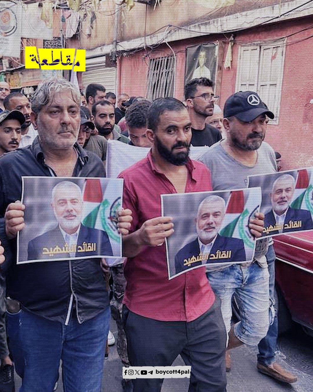 شهدت بعض المخيمات الفلسطينية في لبنان مسيرات غضب واستنكار، بعد اغتيال رئيس المكتب السياسي لحركة حماس إسماعيل هنية في طهران، وانطلقت تظاهرات في الرشيدية والبص والبرج الشمالي، وردد المتظاهرون هتافات معادية لأمريكا وكيان الاحتلال والدول المتخاذلة، ودعت للثأر.