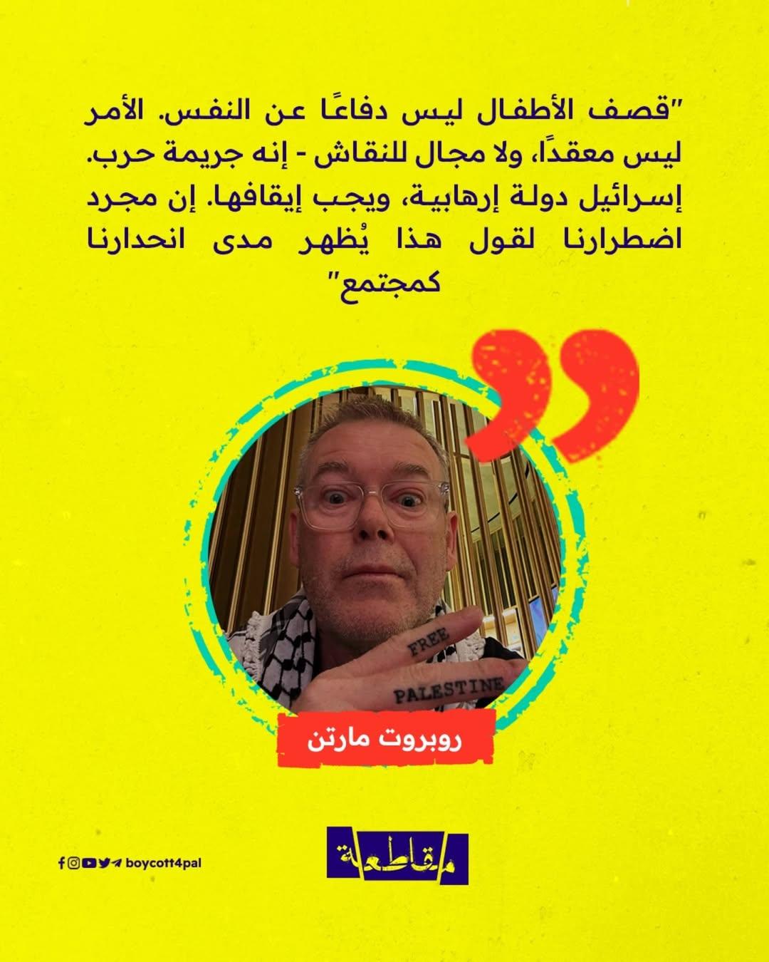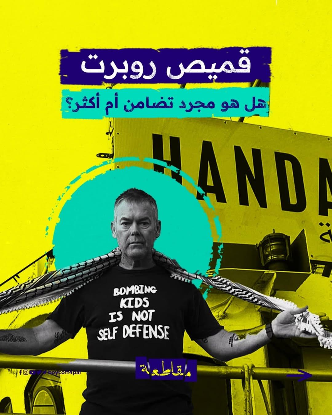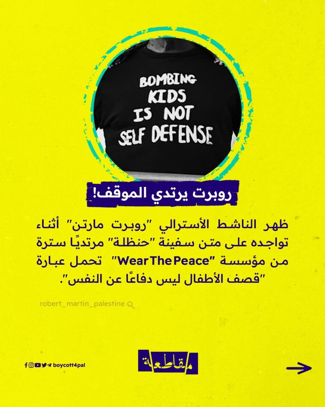 ارتدى روبرت مارتن قميصًا يقول ما يجب أن يُقال: "قصف الأطفال ليس دفاعًا عن النفس". لم يكن مجرد قميص بل بيان تضامن حيّ، ورسالة تؤكد أن التضامن له وجوه عديدة، وأن الثوب قد يصبح لافتة.