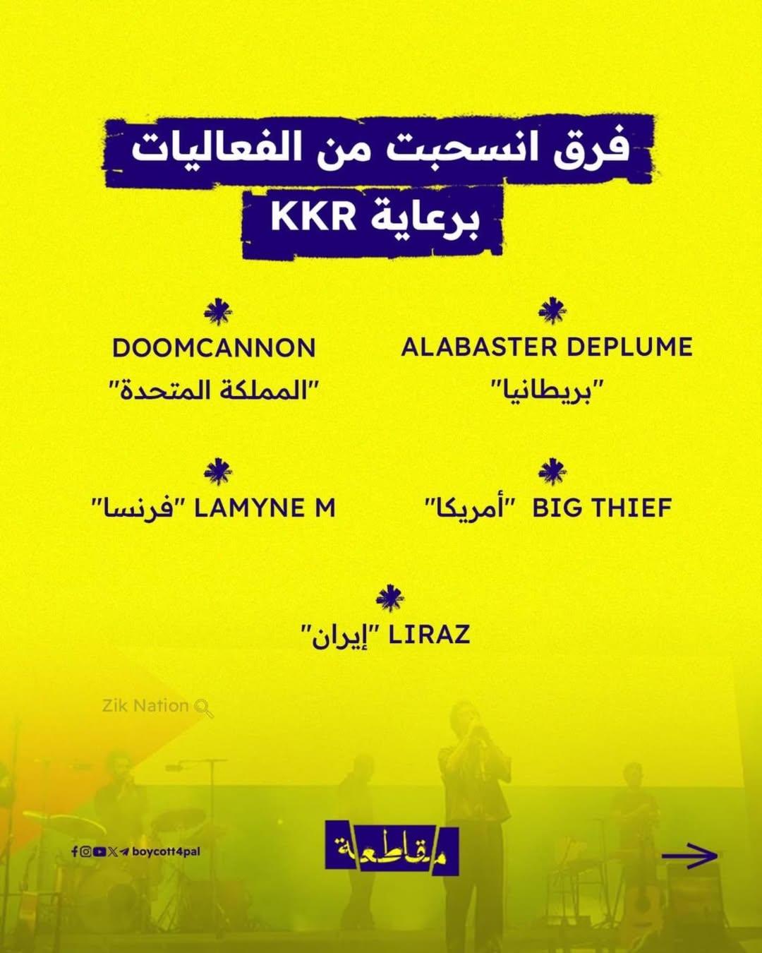 في وقت تتزايد فيه محاولات تلميع صورة الشركات المتورطة في دعم الاحتلال الإسرائيلي عبر تمويل الثقافة والفنون، اختارت فرق موسيقية مستقلة حول العالم أن ترفع صوتها عاليًا: “الفن لا يُباع”. انسحبت فرق من فعاليات ترعاها شركة الاستثمار الأمريكية KKR، التي لا تكتفي بتمويل المهرجانات بل تستثمر في شركات تسليح ومراقبة تساهم في قمع الشعب الفلسطيني ودعم المستوطنات غير الشرعية.