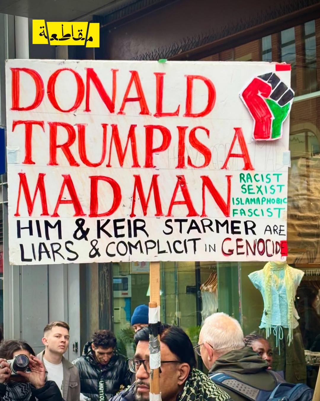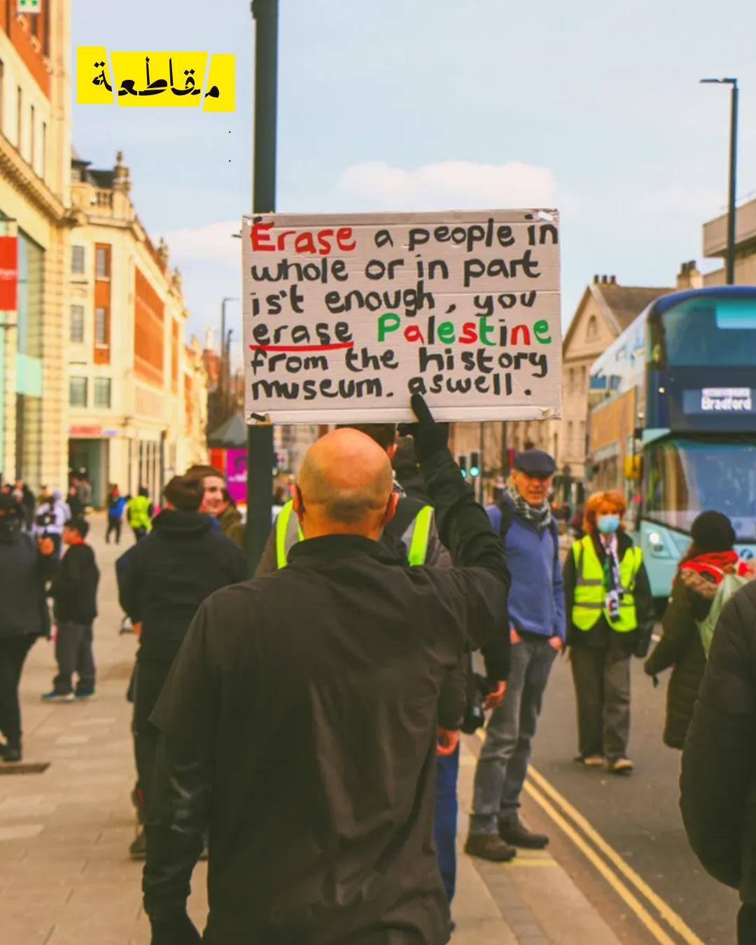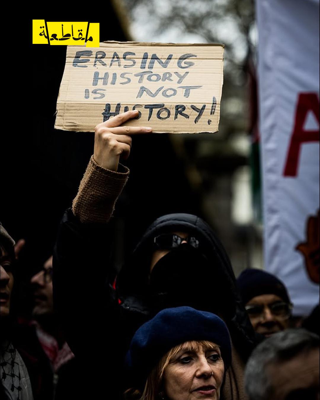كما حمل متظاهرون شعارًا آخر جاء فيه: "محو شعب كليًا أو جزئيًا لا يكفيكم، بل تمحون فلسطين من متحف التاريخ أيضًا"، في تعبير عن رفض محاولات طمس الهوية الفلسطينية أو تغييب الرواية التاريخية.