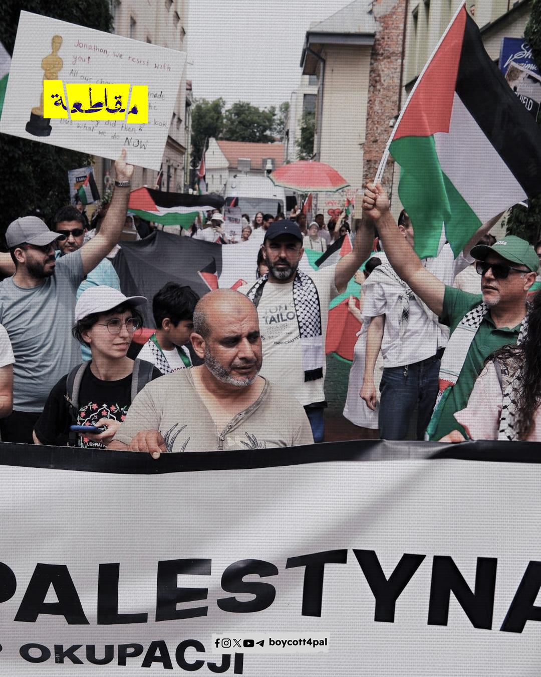 خرج متظاهرون مؤيدون للفلسطينيين إلى شوارع كازيميرز خلال مهرجان الثقافة اليهودية في كراكوف، بولندا، وعبر المشاركون عن رفضهم للحرب الإسرائيلية وسياسة التجويع وقطع إمدادات المياه والغذاء والكهرباء.