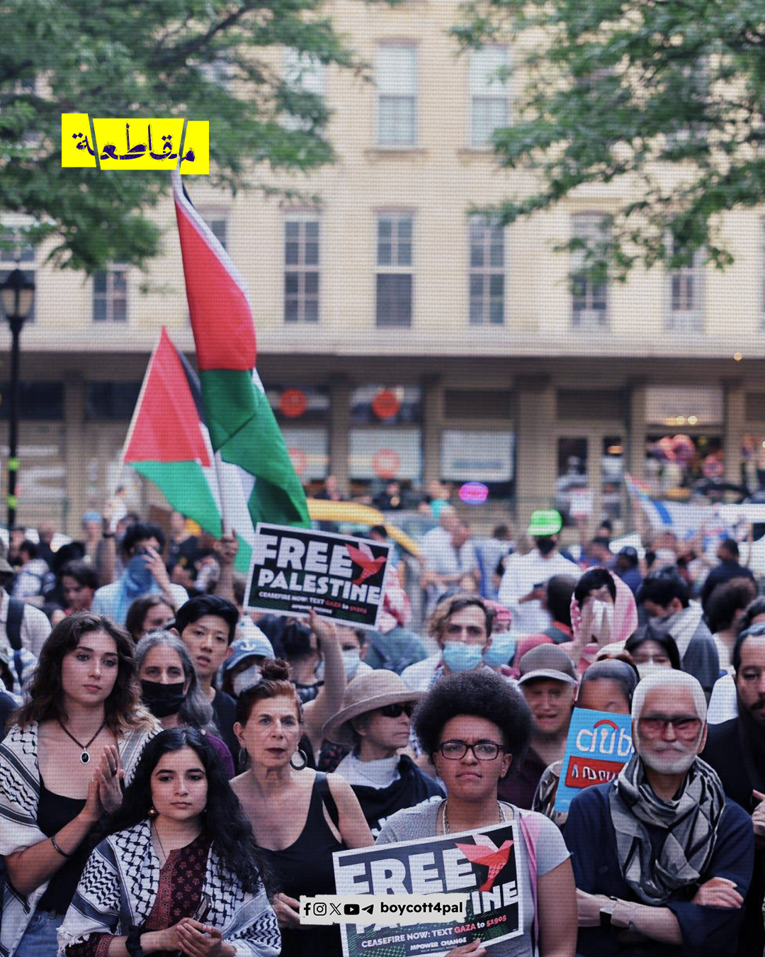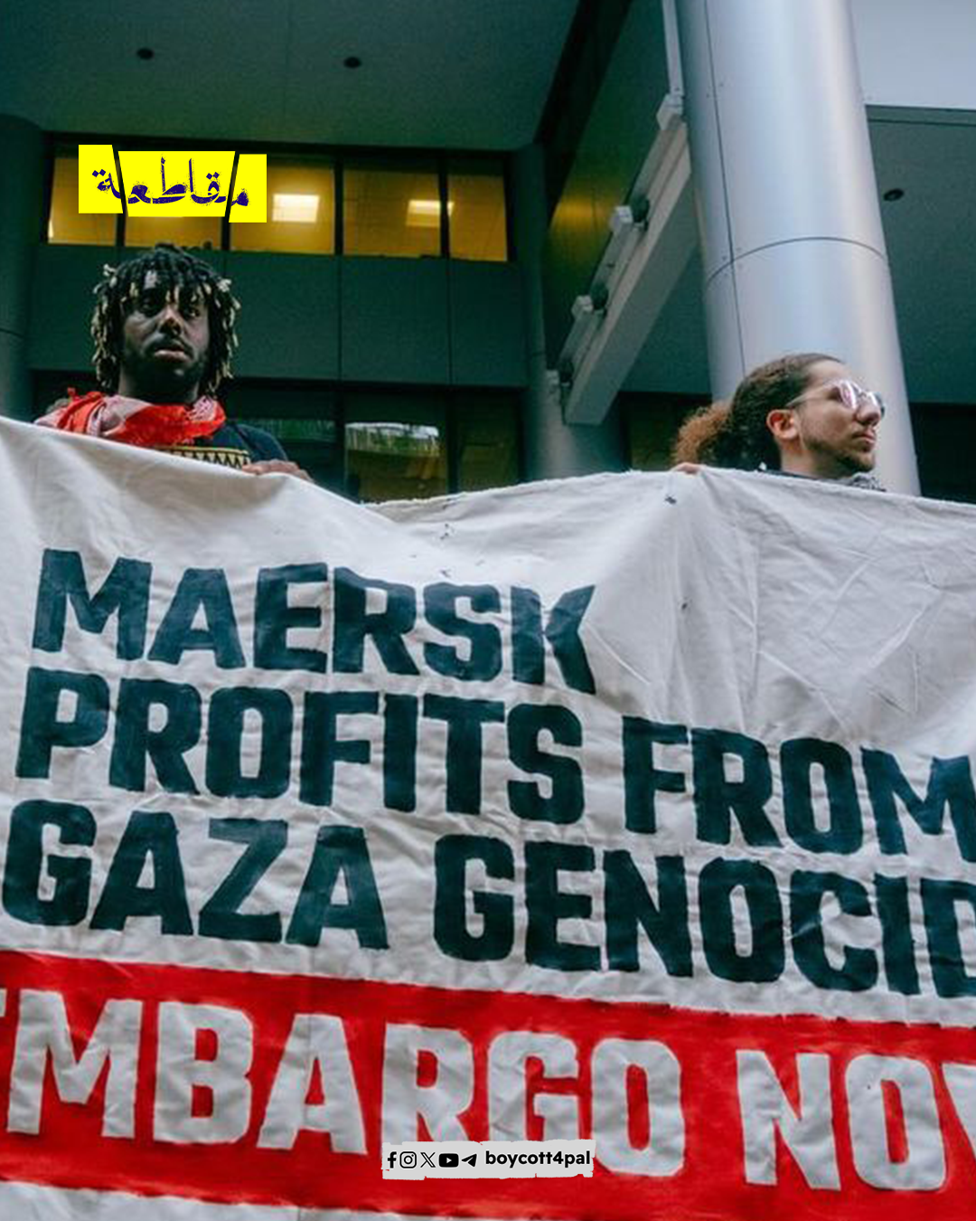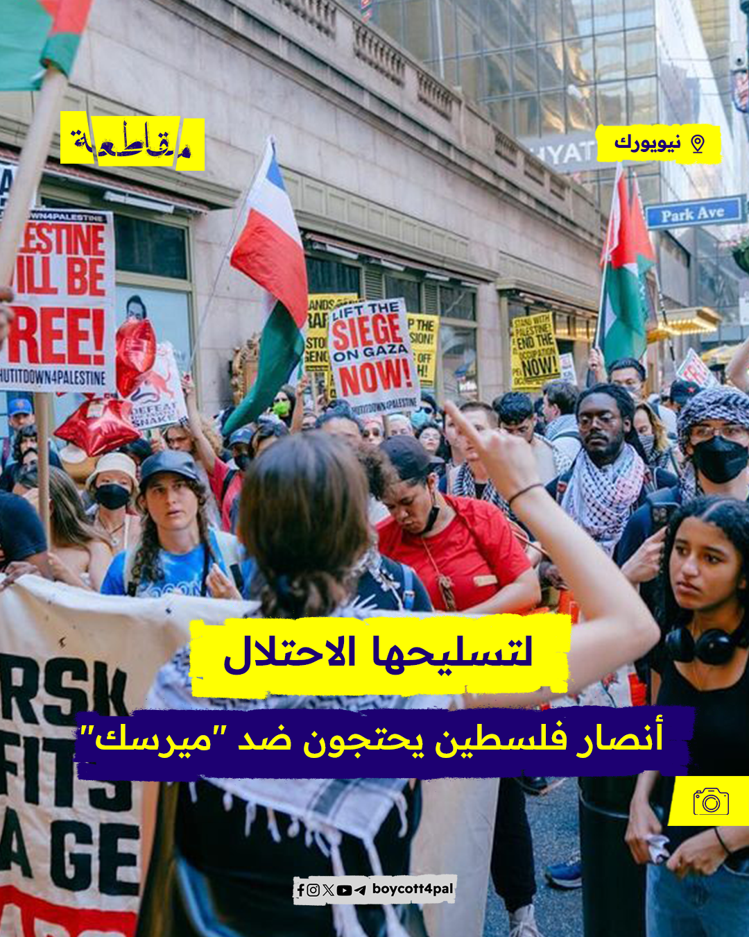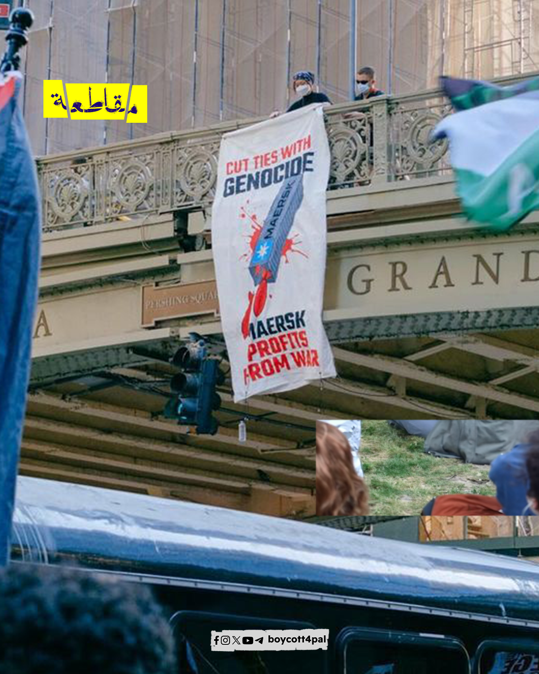 تجمع نُشطاء مؤيدون لفلسطين في شوارع وسط مانهاتن بمدينة نيويورك للاحتجاج ضد شركة "ميرسك"، وهي شركة شحن وخدمات لوجستية تنقل الملايين من الأسلحة ومكونات الأسلحة لتسهيل الإبادة الجماعية التي يرتكبها كيان الاحتلال ضد الفلسطينيين بغزة.