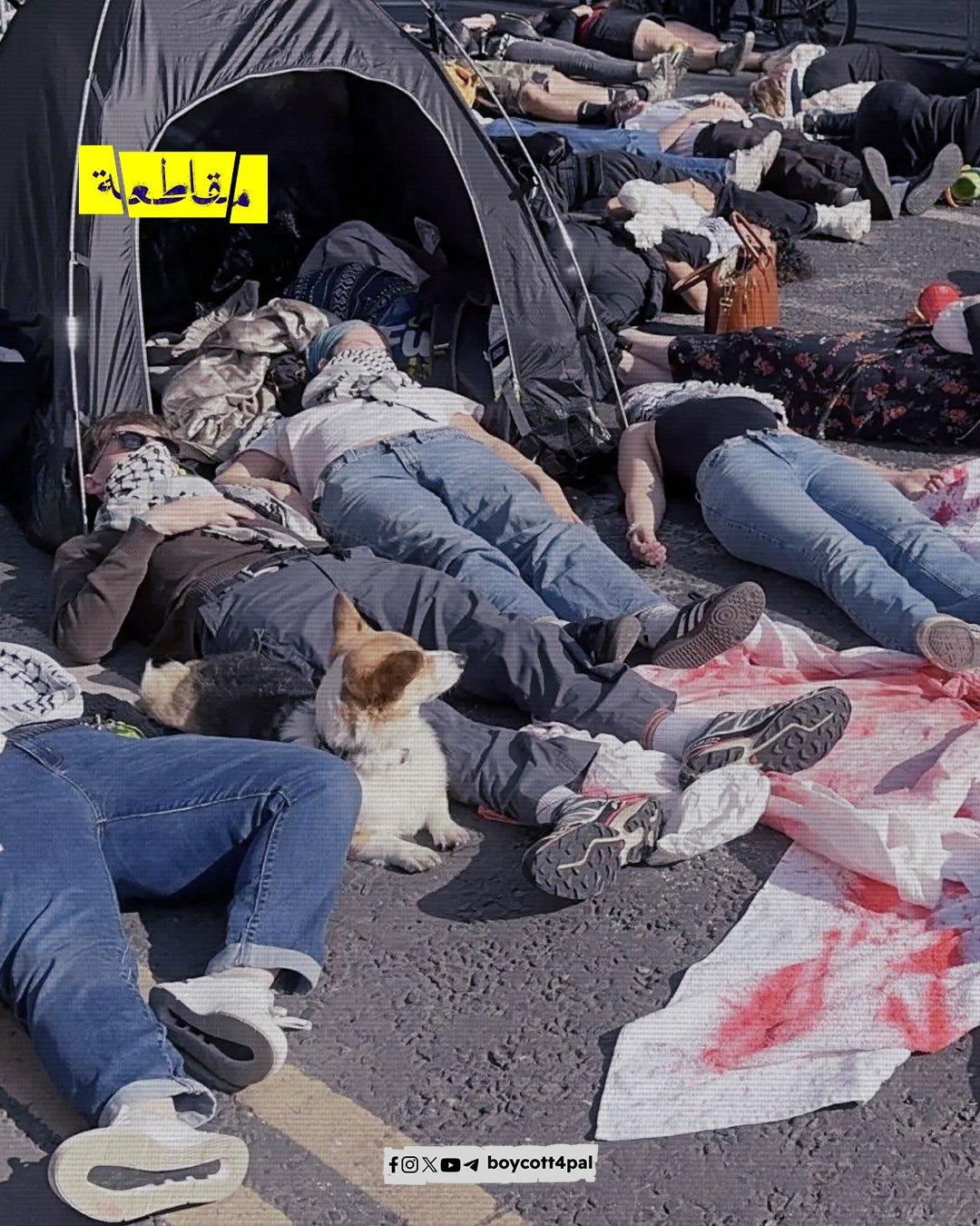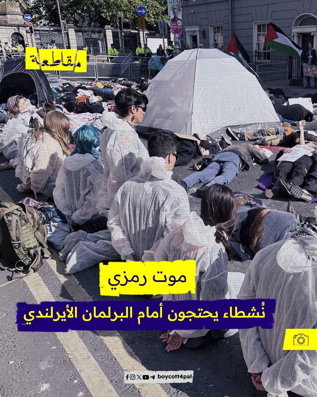 احتشد نُشطاء مؤيدون لفلسطين خارج البرلمان الأيرلندي حاملين لافتات وأعلام فلسطينية لإظهار التضامن مع الشعب الفلسطيني، وتنديدًا بالمجازر الصهيونية في قطاع غزة، وقاموا بتمثيل الموت للفت الأنظار حول الإبادة المستمرة منذ السابع من أكتوبر الماضي في القطاع.
