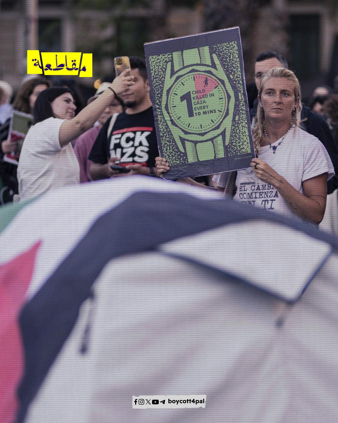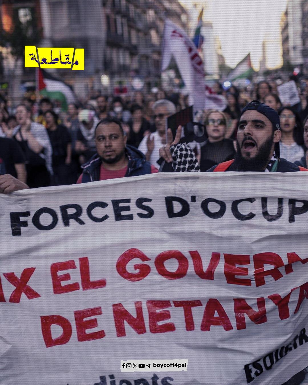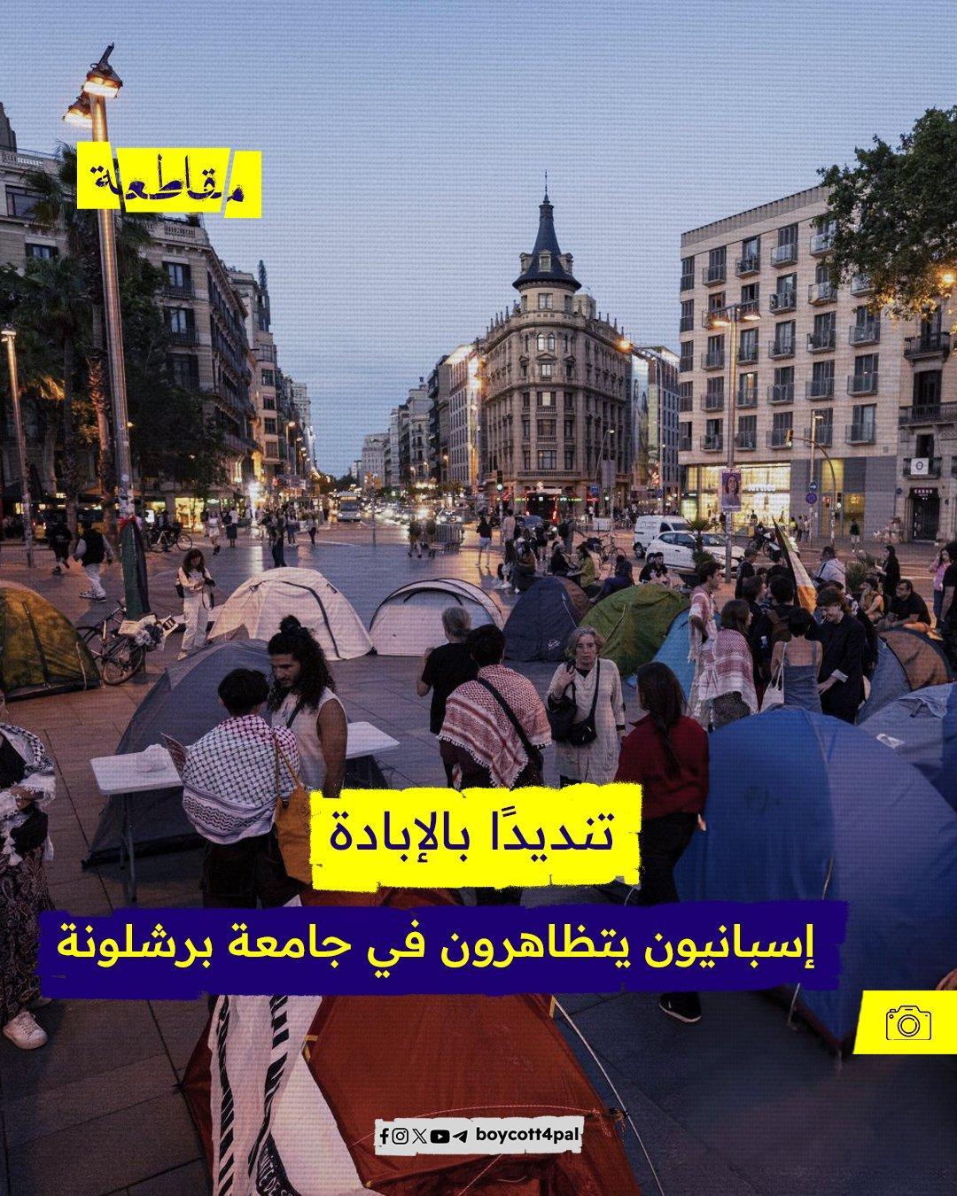 تجمع مؤيدون لفلسطين في ساحة جامعة برشلونة في إسبانيا وهم يحملون لافتات والعلم الفلسطيني لإظهار التضامن مع الفلسطينيين والاحتجاج على الهجمات الصهيونية على قطاع غزة، ودعا المتظاهرون إلى "التدخل الفوري" لوقف إطلاق النار وإعلان فلسطين حرة.