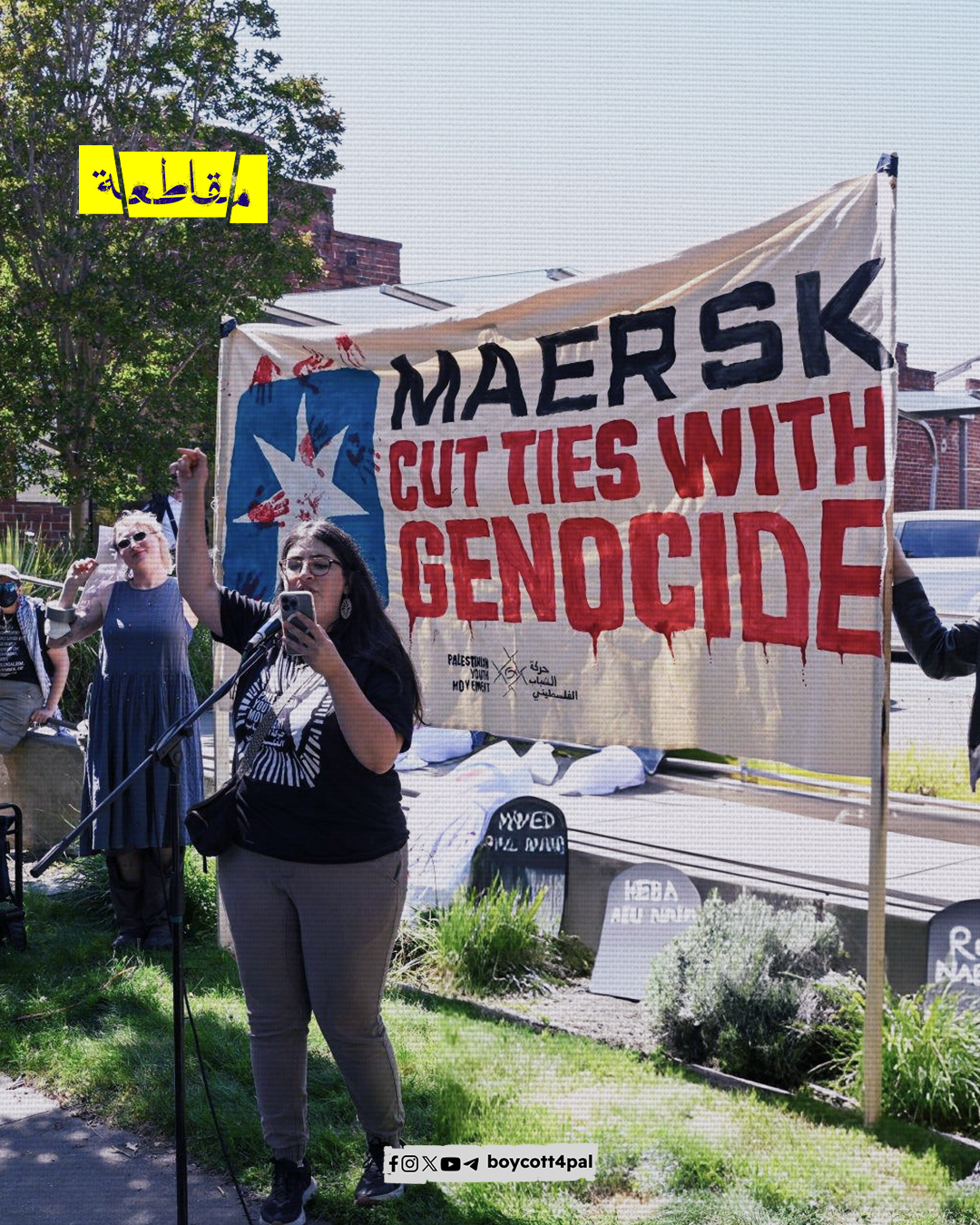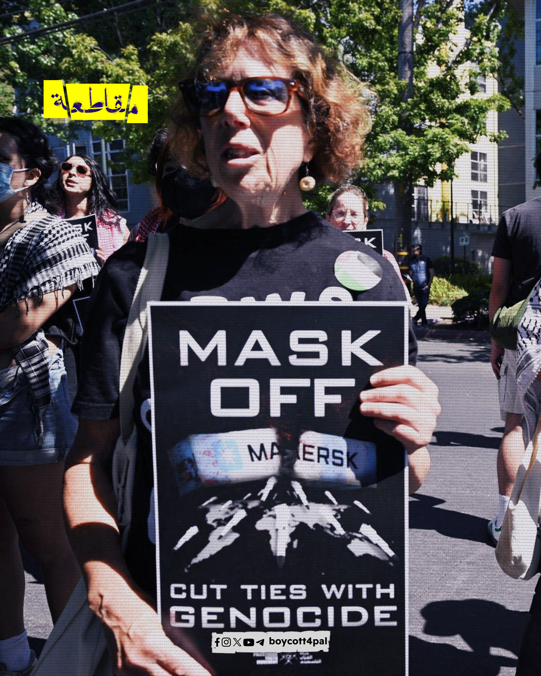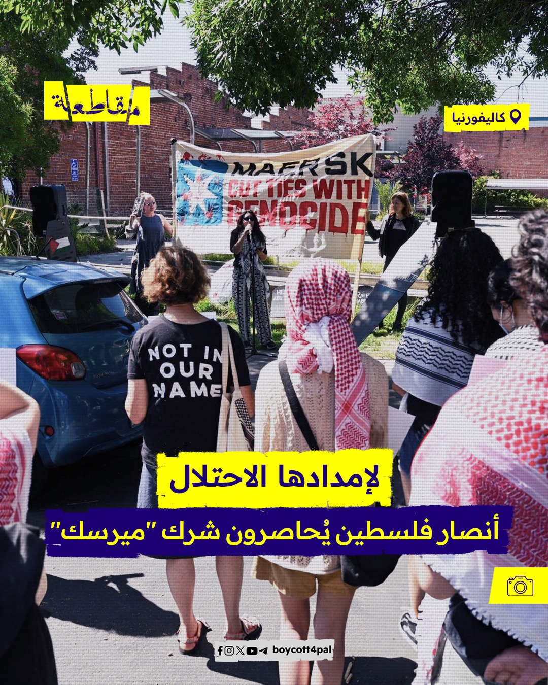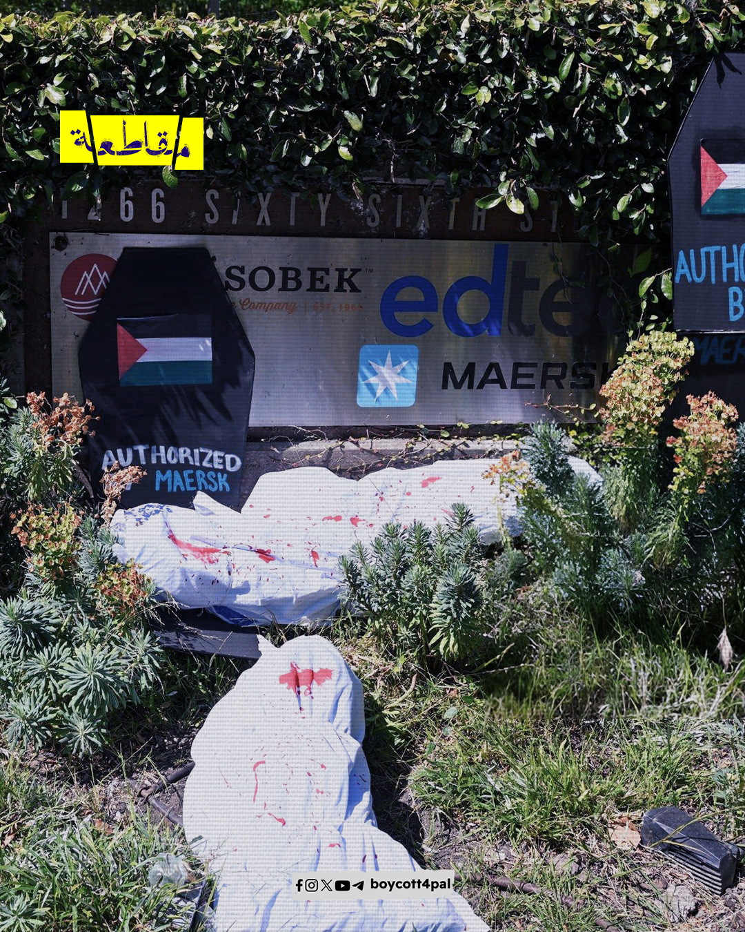 تجمع متظاهرون مؤيدون للفلسطينيين خارج شركة الشحن والخدمات اللوجستية "ميرسك" في إيمريفيل، كاليفورنيا الأمريكية لمطالبتها بإنهاء دورها في نقل وإمداد كيان الاحتلال الصهيوني بالأسلحة التي يستخدمها في الإبادة الجماعية ضد الشعب الفلسطيني في غزة، ورفع المتظاهرون خلالها الأعلام الفلسطينية ووضعوا جثث رمزية أمام مبنى الشركة للفت الأنظار حول المذبحة بعموم القطاع.