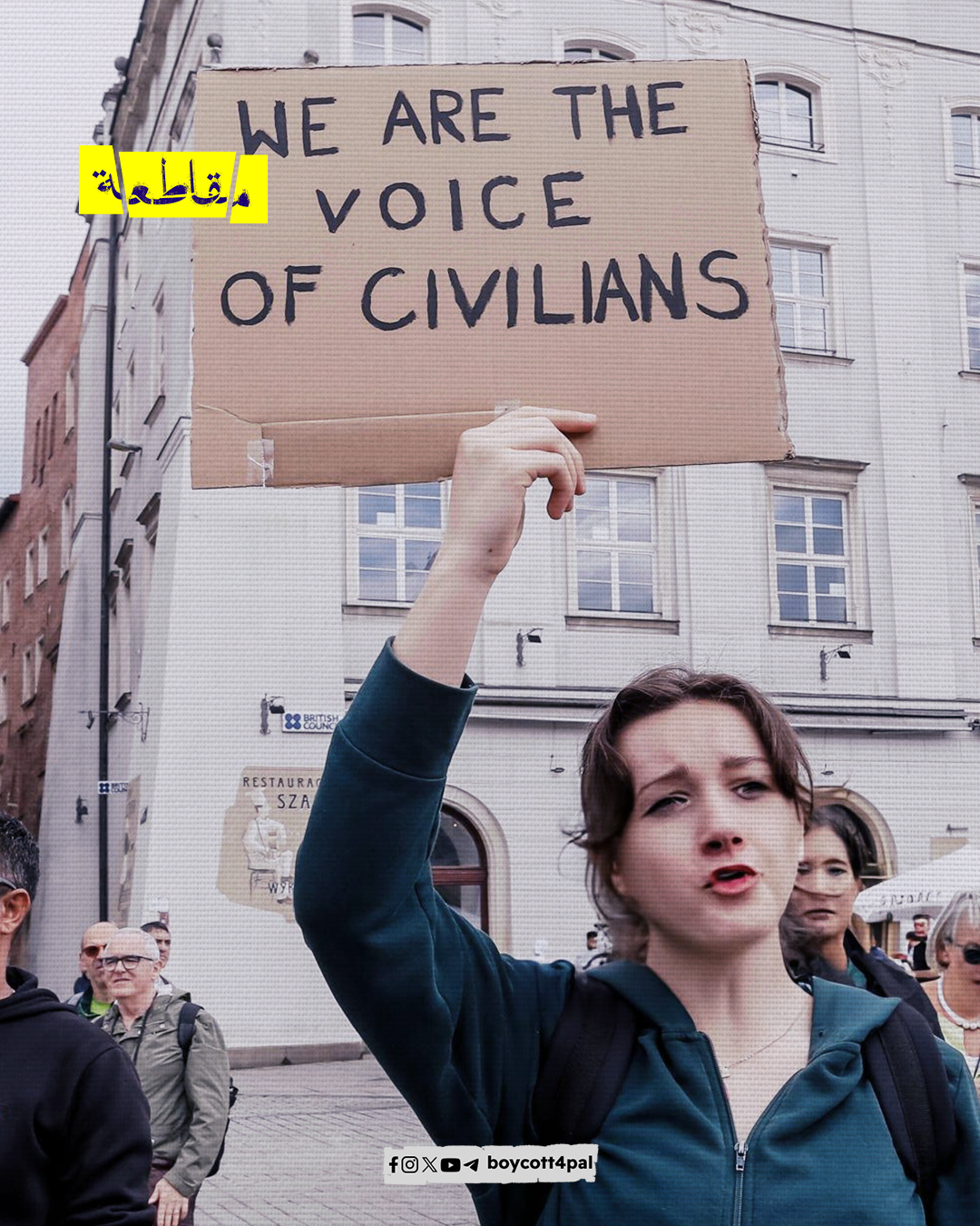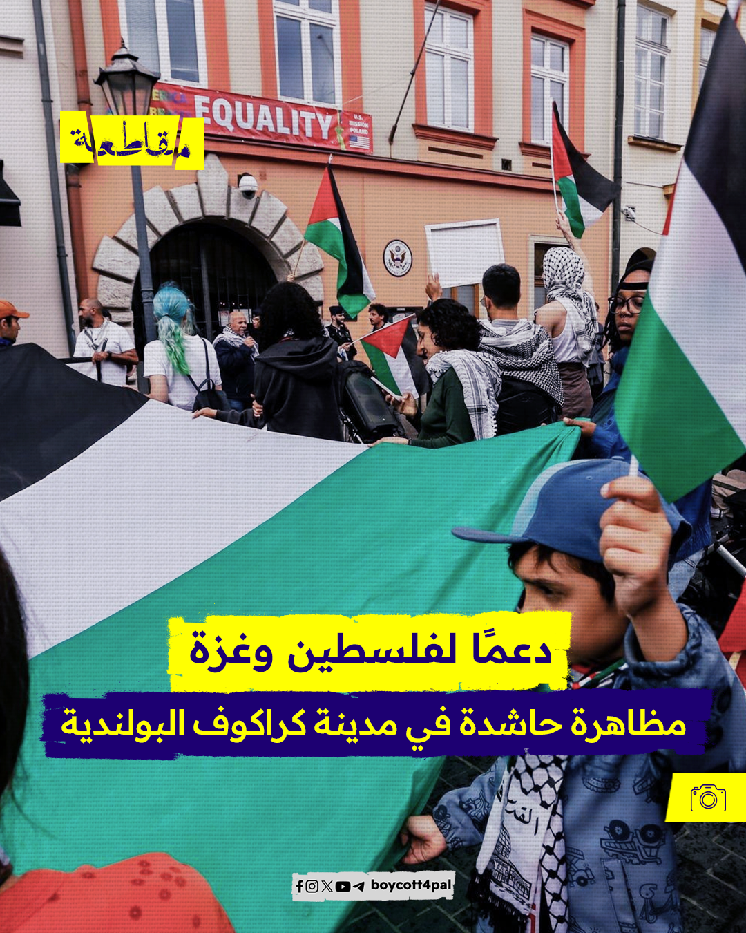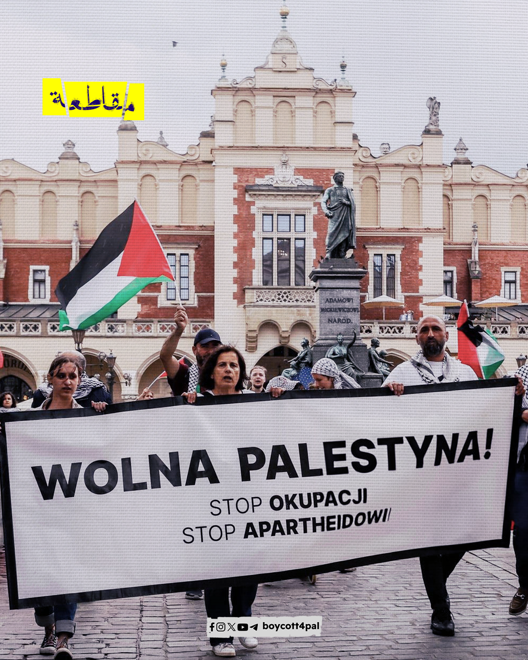 احتج أنصار فلسطين في السوق الرئيسي بمدينة كراكوف البولندية رفضًا للمجازر الإسرائيلية في قطاع غزة ودعمًا لفلسطين ، ورفعوا الأعلام الفلسطينية إلى جانب لافتات مناهضة للحرب ومطالبة لوقف إطلاق النار.