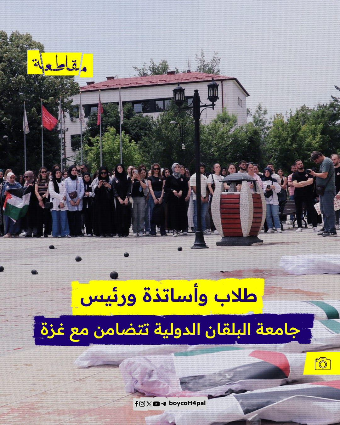 تظاهر طلاب وأعضاء هيئة تدريسية مع رئيس جامعة البلقان الدولية في جمهورية مقدونيا، دعمًا لفلسطين ورفضًا للإبادة الجماعية الجارية بحقهم من قبل الاحتلال الإسرائيلي، ووضع المحتجون جثثًا رمزية في ساحة الحرم كناية عن الضحايا المدنيين الذين تقتلهم “إسرائيل” بالقطاع، ويمر ذلك دون عقاب.