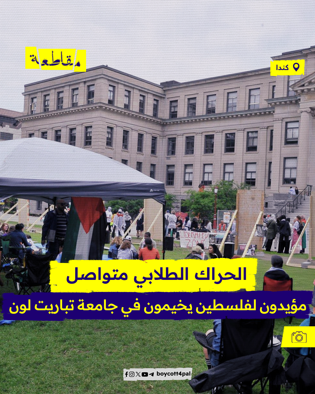 انضم طلاب مؤيدون لفلسطين في جامعة تباريت لون في مدينة أوتاوا الكندية إلى الحراك العالمي ودشنوا مخيمًا تضامنيًا مع غزة في حرم الجامعة لمطالبة الإدارة بقطع العلاقات مع الاحتلال الإسرائيلي ووقفٍ فوري لإطلاق النار بغزة.