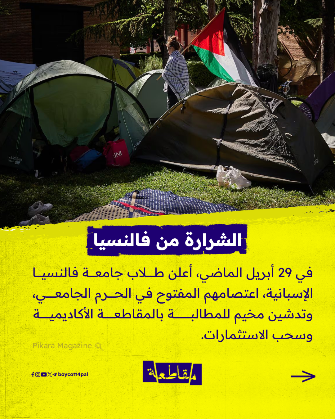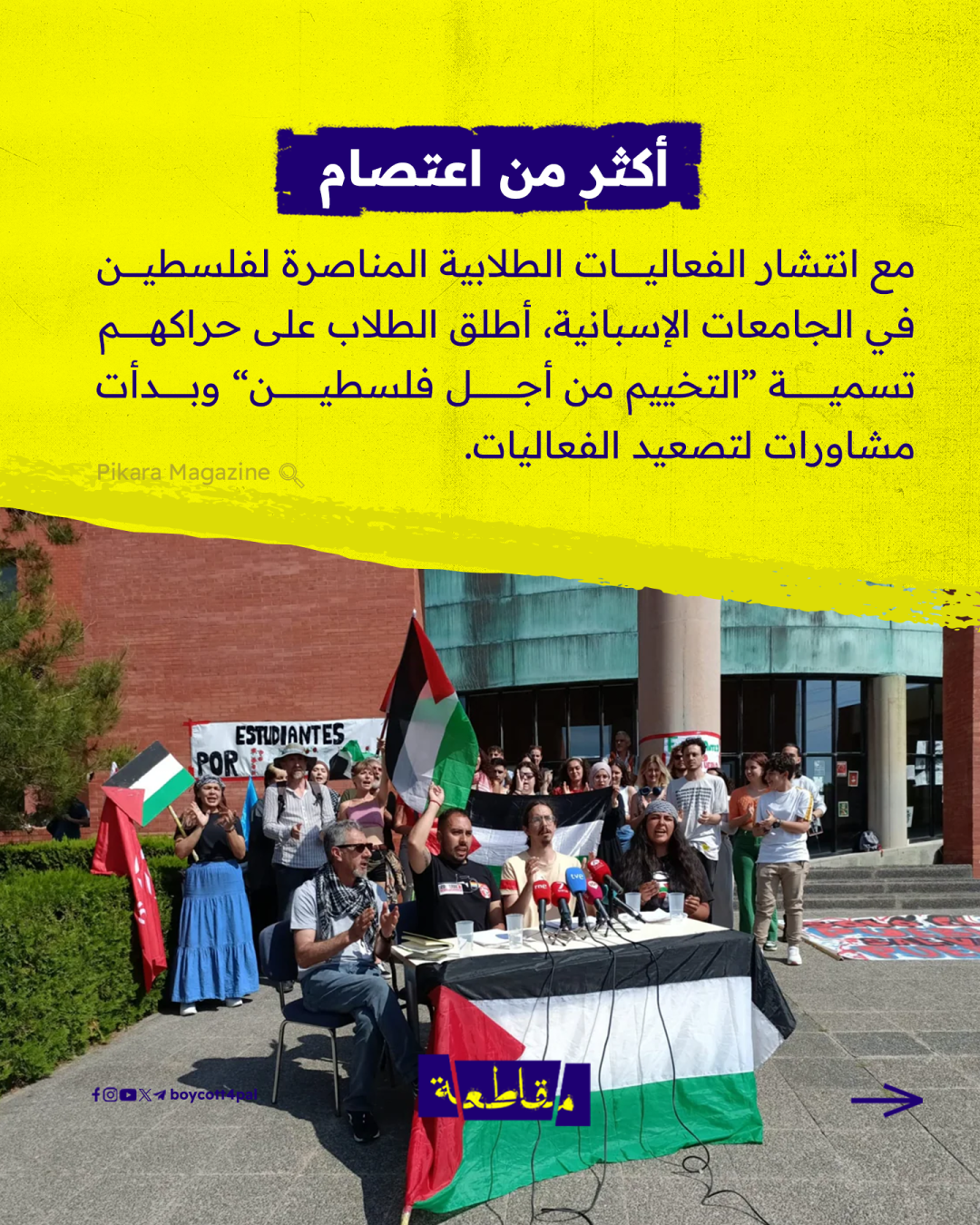 انطلق قبل أسابيع من جامعة فالنسيا كمظاهرة طلابية تطورت إلى اعتصام في الحرم الجامعي، وتمدد ليكتسح عشرات الجامعات الإسبانية، ويصبح مشهدًا غير مسبوق من التضامن مع فلسطين، ونقطة دعم وحشد لكل الفعاليات التضامنية مع الشعب الفلسطيني في إسبانيا.