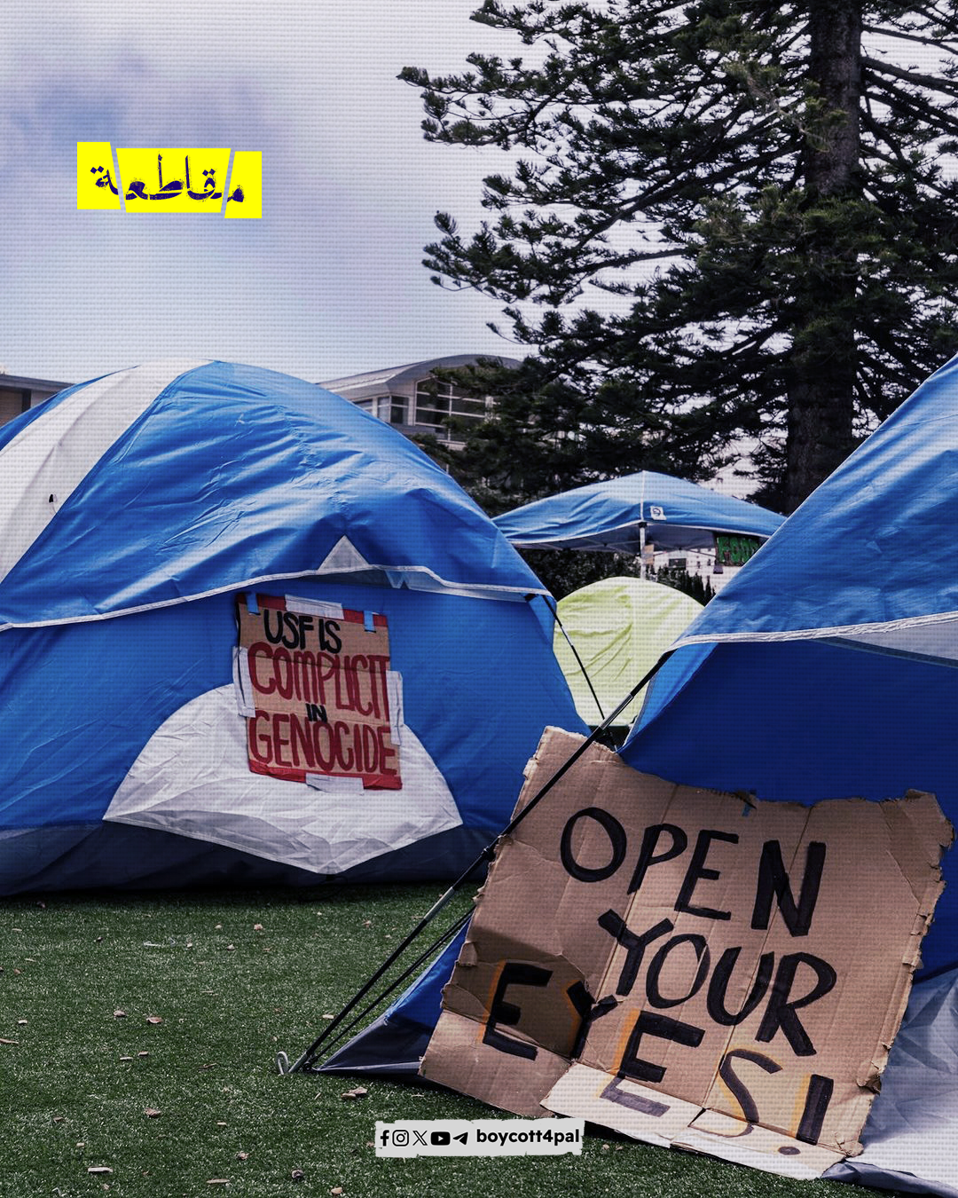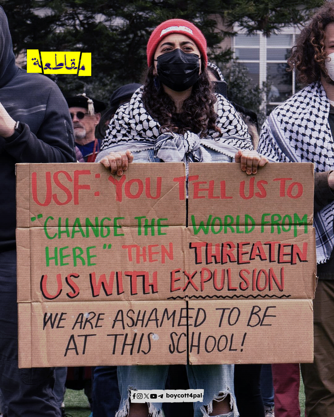 يواصل طلاب جامعة سان فرانسيسكو المتضامنين مع فلسطين والمطالبين بسحب الاستثمارات وقطع العلاقات مع الاحتلال الإسرائيلي اعتصامهم في مخيمهم، رغم تهديدات لمسؤولي الجامعة بعدم العفو والقمع الفوري في حال لم يتم إخلاء المخيم التضامني، وهو ما رفضه الطلاب.
