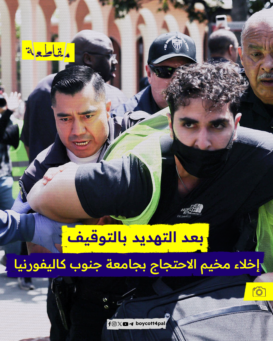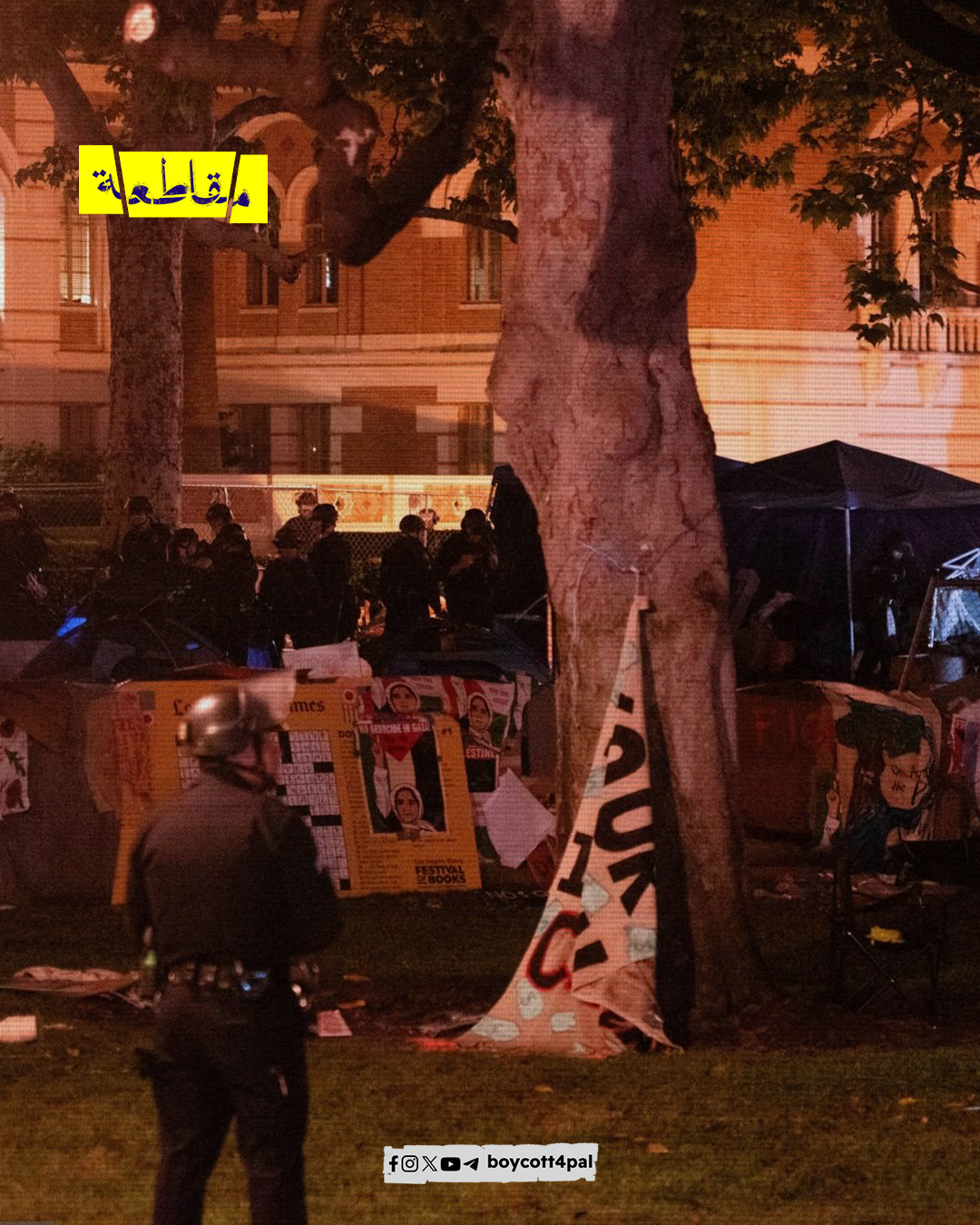 وحذرت الجامعة أن الطلاب الذين لا يغادرون الحرم الجامعي، معرضون للتوقيف من قبل الشرطة؛ وأغلق المسؤولون الحرم الجامعي، بينما أخلت شرطة لوس أنجلوس مخيم الاحتجاج.