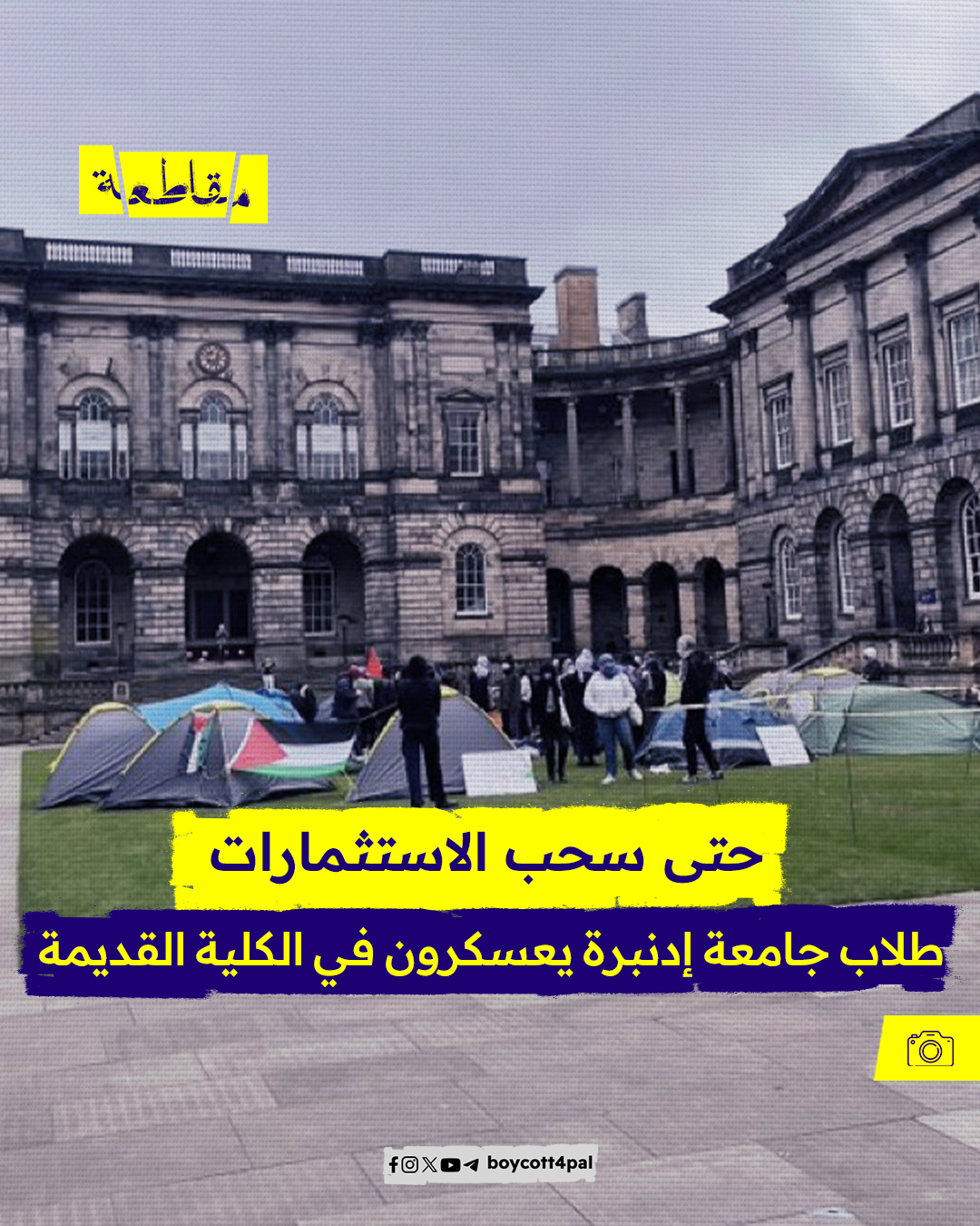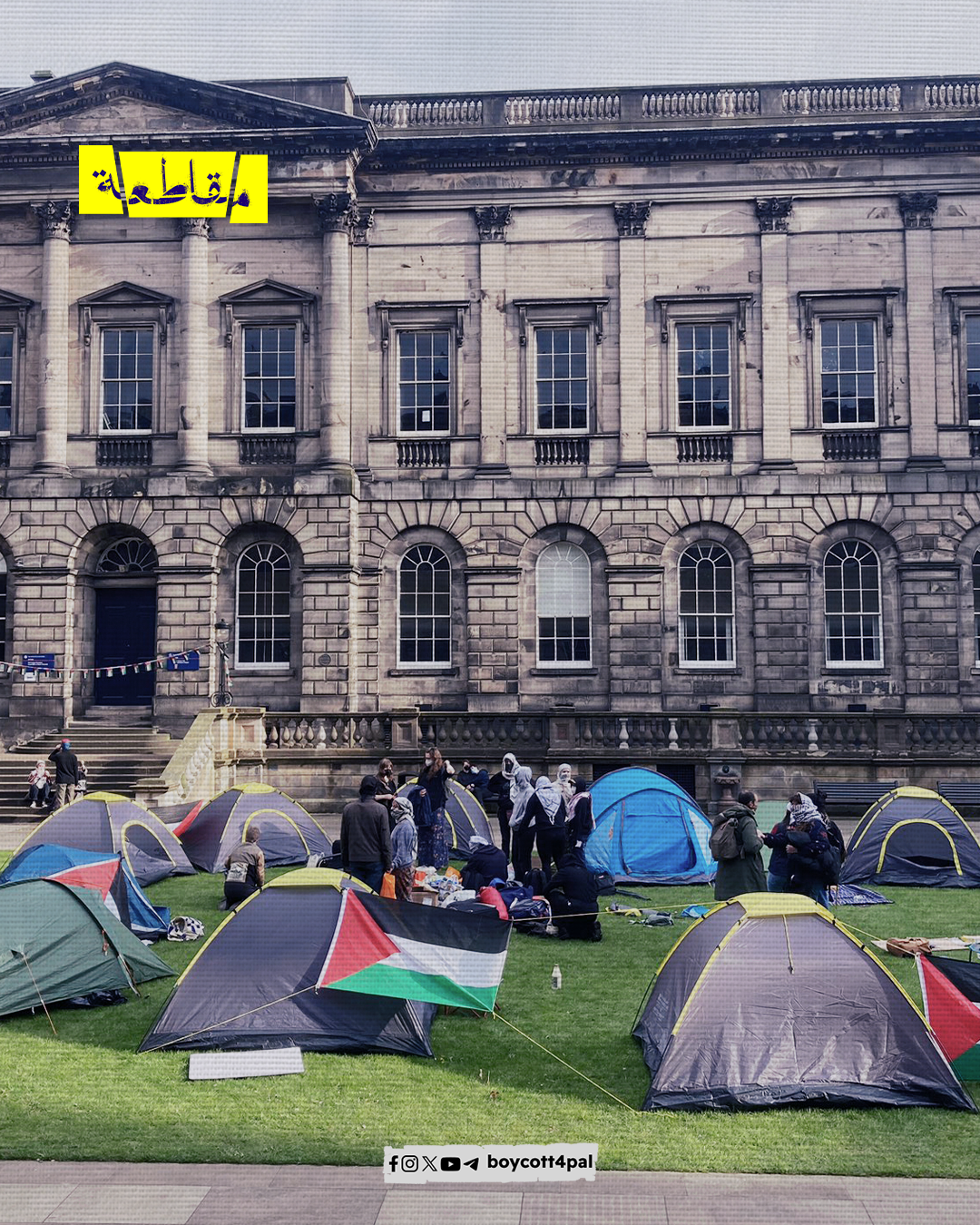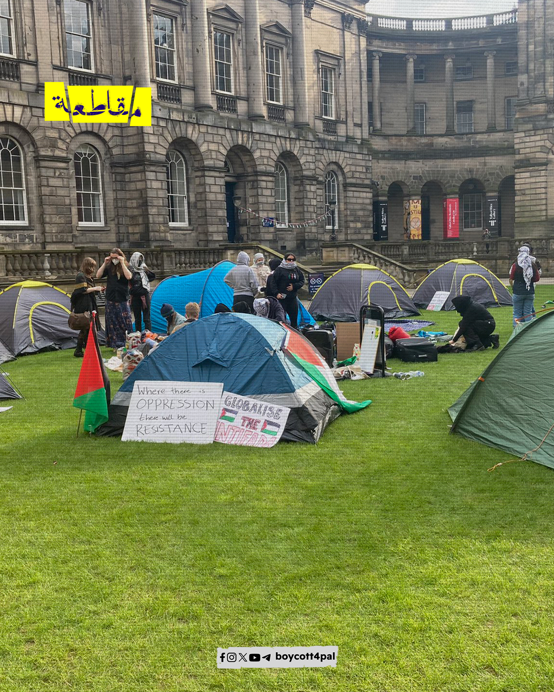 نظم طلاب في جامعة إدنبرة في أسكتلندا اعتصامًا في الحرم الجامعي مطالبين بقطع كامل للعلاقات بين الجامعة و”إسرائيل” كما طالب المعتصمون بوقف التعاون في المجالات البحثية مع الشركات التي تمد الاحتلال الإسرائيلي بالسلاح.