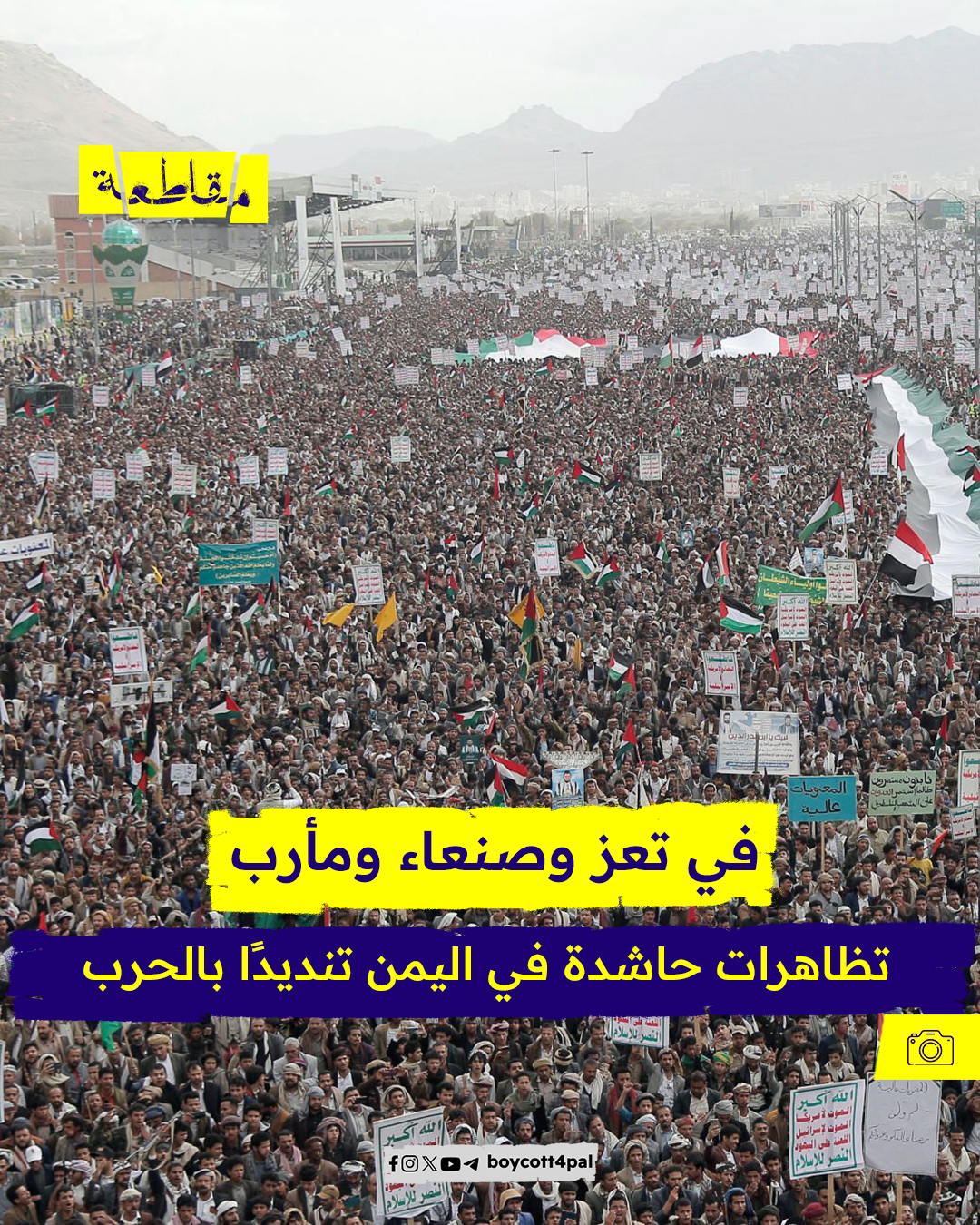 تتواصل منذ نحو سبعة أشهر المظاهرات الشعبية في العديد من المحافظات اليمنية، للتضامن مع الشعب الفلسطيني والتنديد بالعدوان الإسرائيلي الوحشي المتواصل على قطاع غزة المحاصر، وتصدرت محافظات: تعز، صنعاء، مأرب، أبرز مناطق هذه التظاهرات حيث خرج عشرات الآلاف الى الساحات والميادين.
