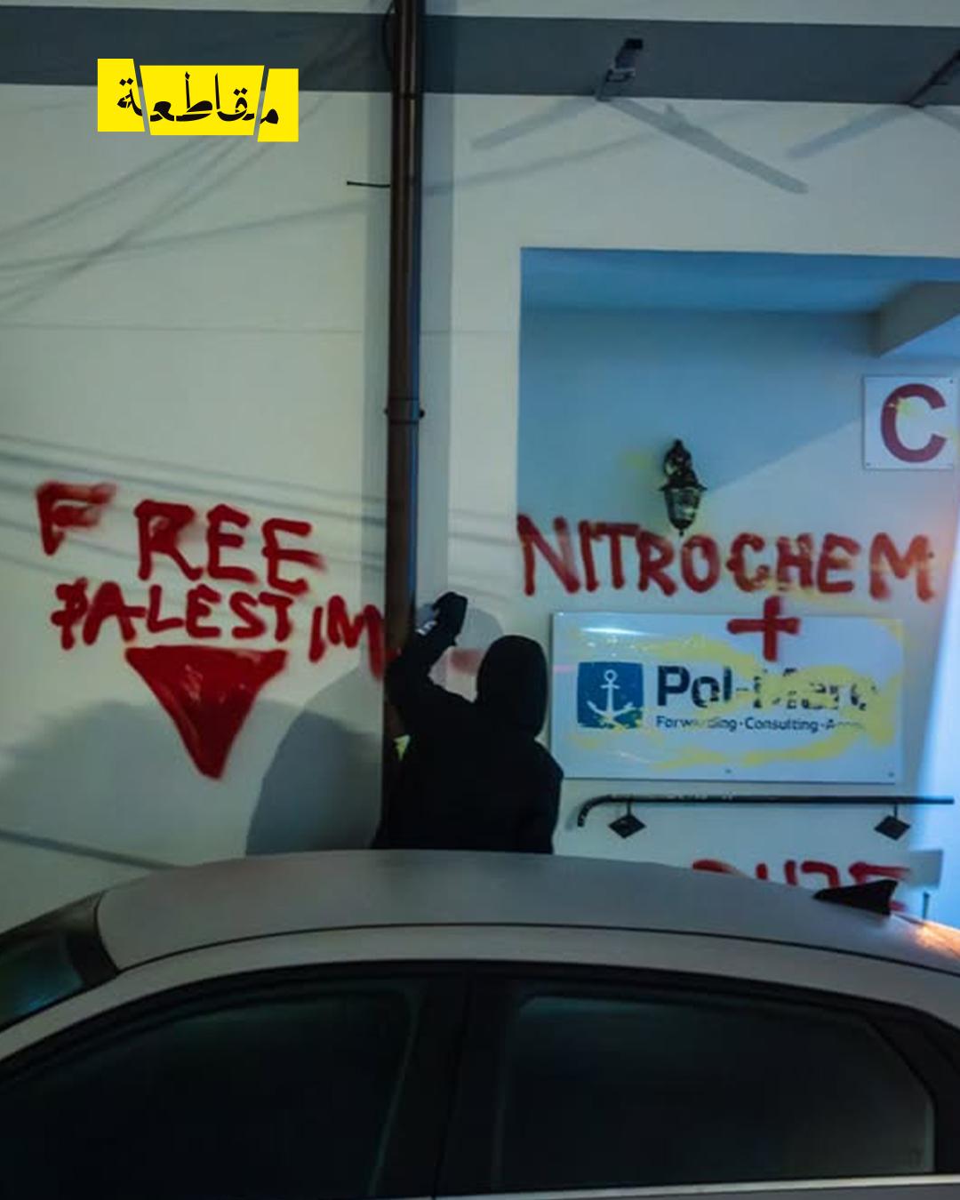 سكب ناشطان طلاءً بلون مادة "تي إن تي" على واجهة مبنى شركة "بول-ماري"، في بولندا، في خطوة احتجاجية ترمز إلى الدور الذي تلعبه الشركة ضمن سلاسل الإمداد العسكرية. ووفقًا لتقرير، تُعدّ "بول-ماري" مسؤولة عن الخدمات اللوجستية ونقل المواد التي تنتجها شركة "نيترو كيم"، أكبر مُصنّع لمادة "تي إن تي" في حلف شمال الأطلسي والاتحاد الأوروبي.
