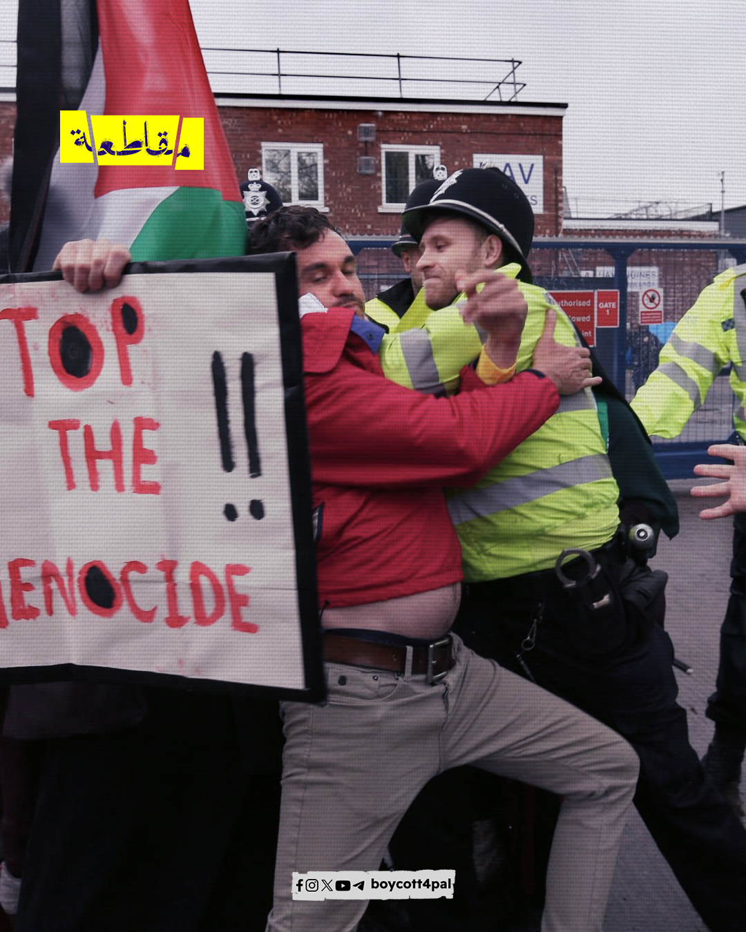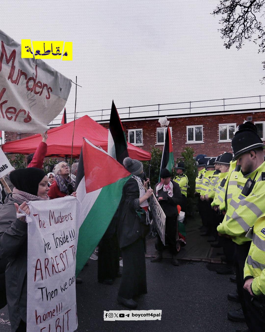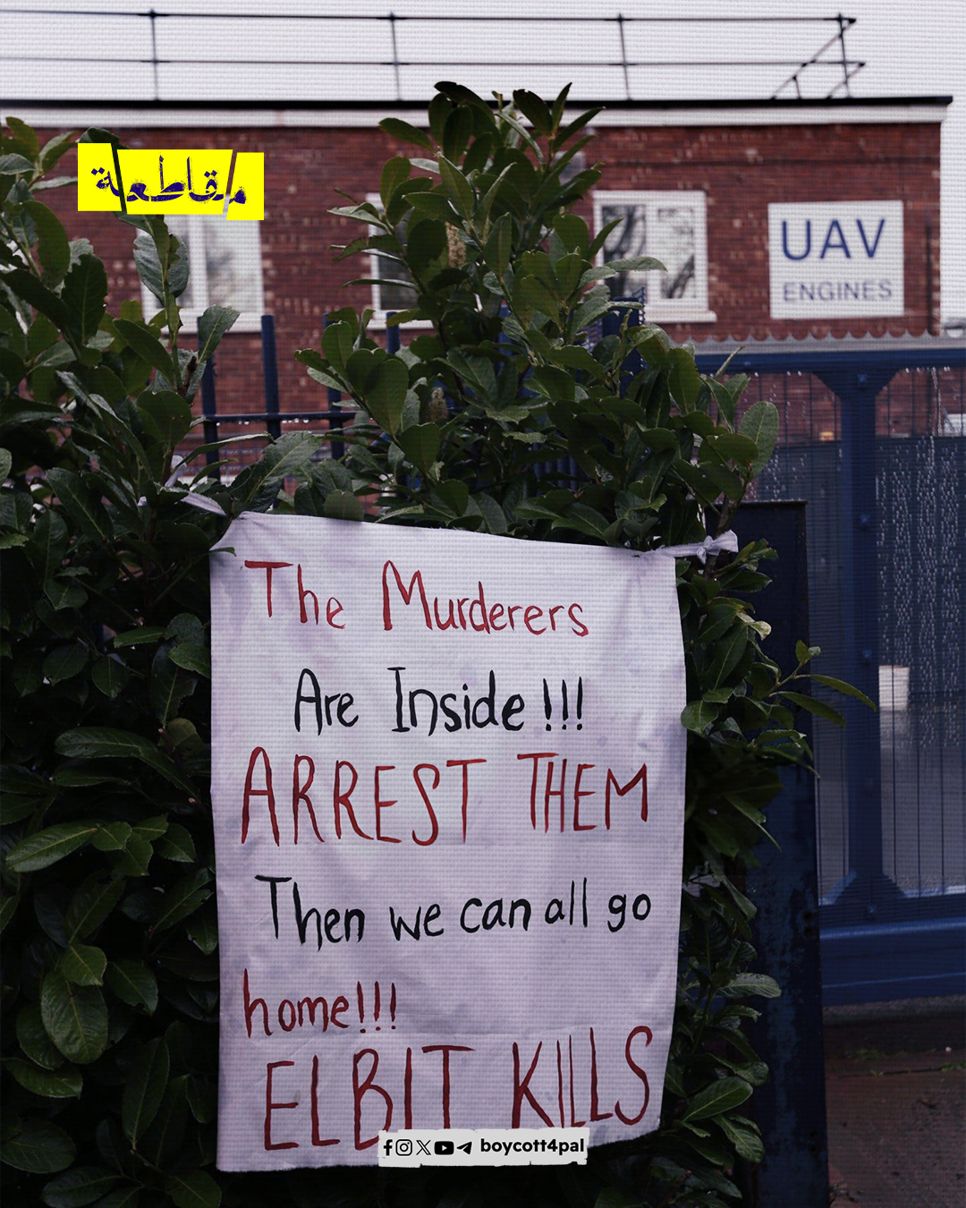 تظاهر محتجون في شينستون بالمملكة المتحدة حاملين لوحات للضحايا المدنيين في حرب غزة خلال مظاهرة خارج مصنع الطائرات بدون طيار UAV Engines التابع لشركة Elbit، مطالبين بقطع خط إنتاج محركات الطائرات المستخدمة لارتكاب الإبادة الجماعية في غزة.