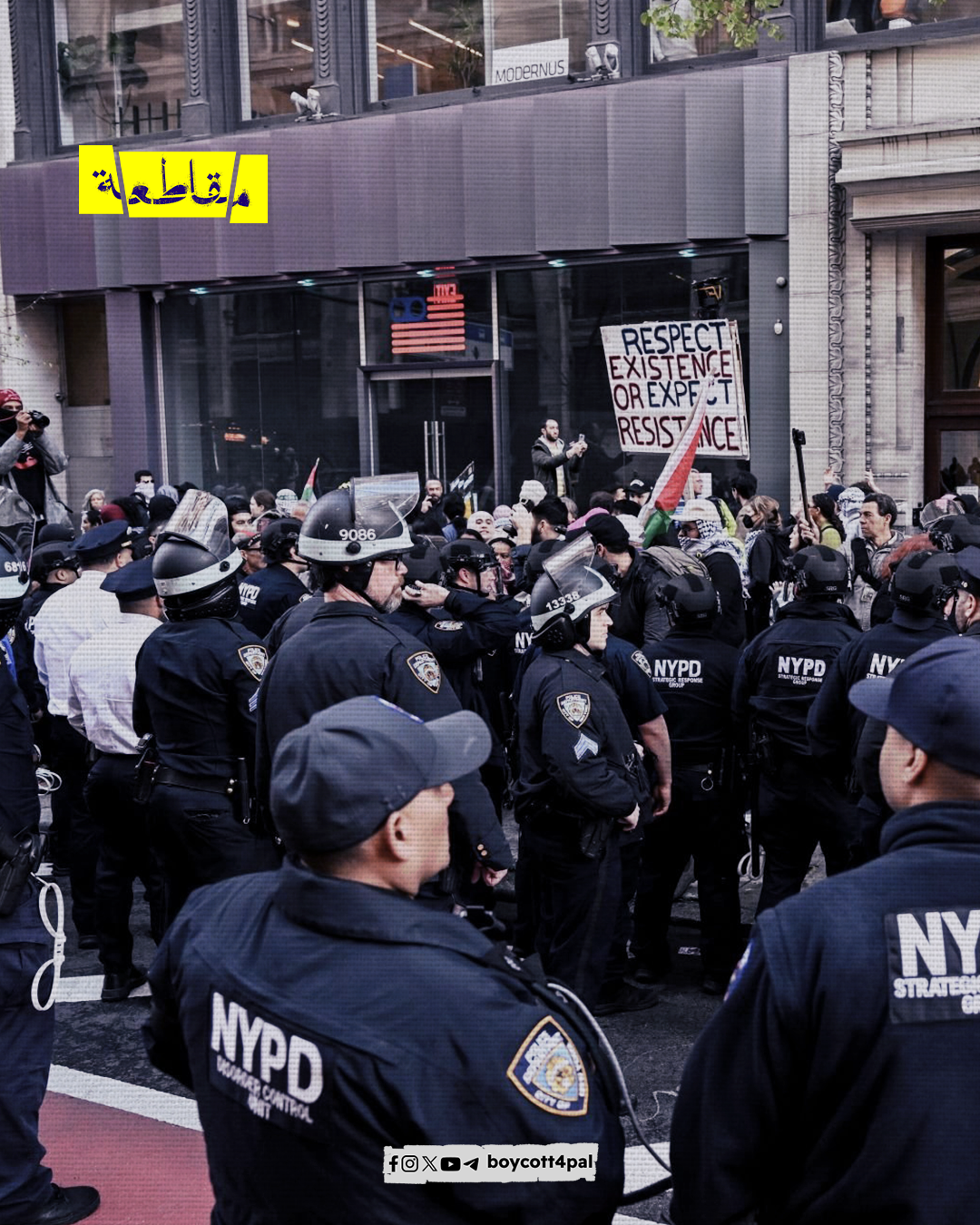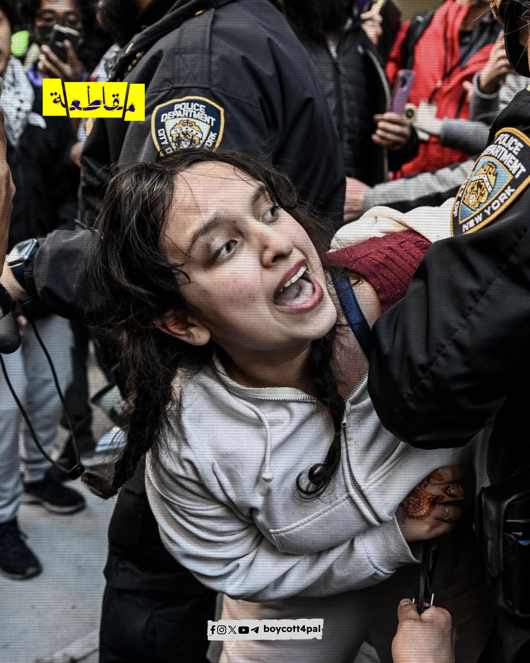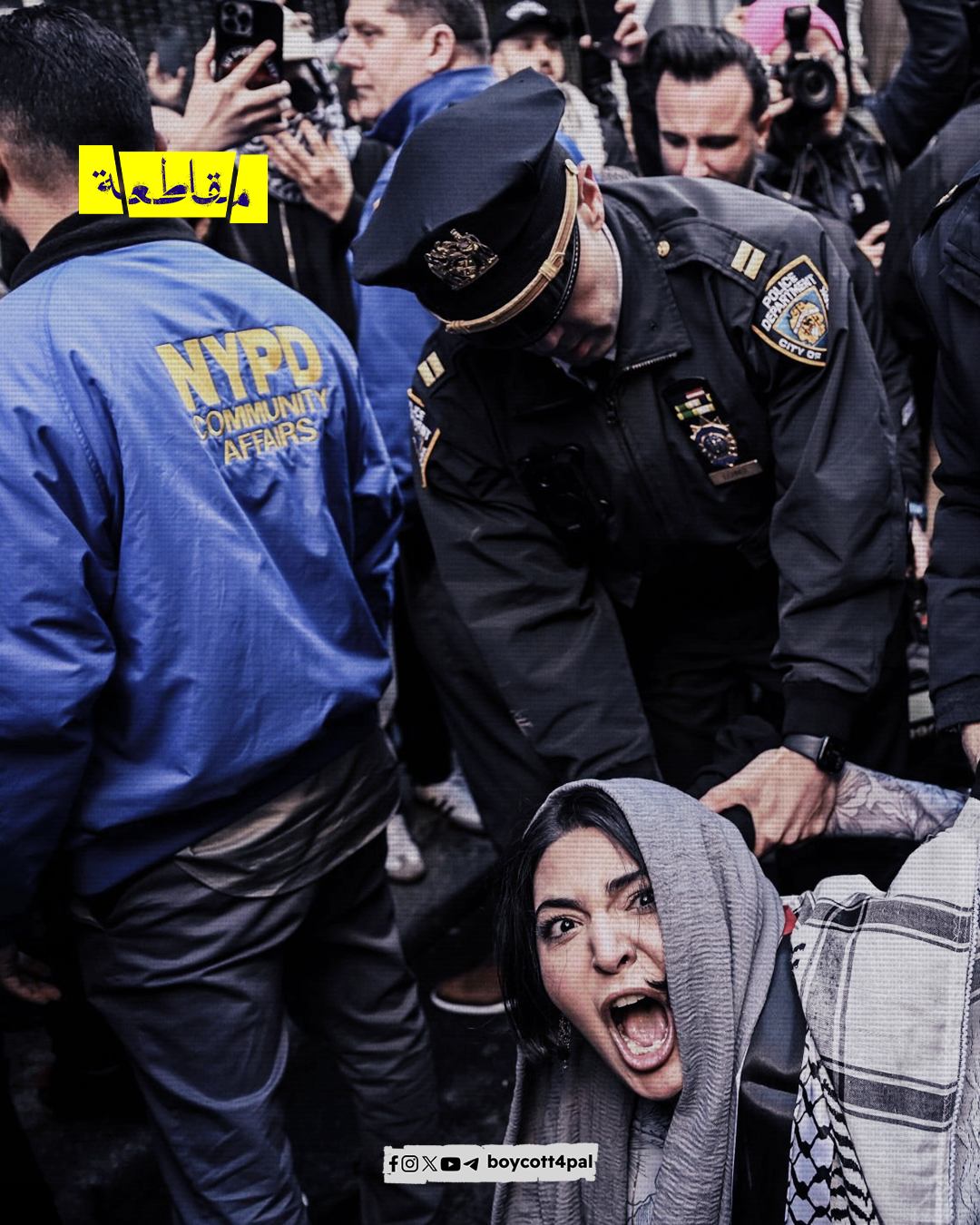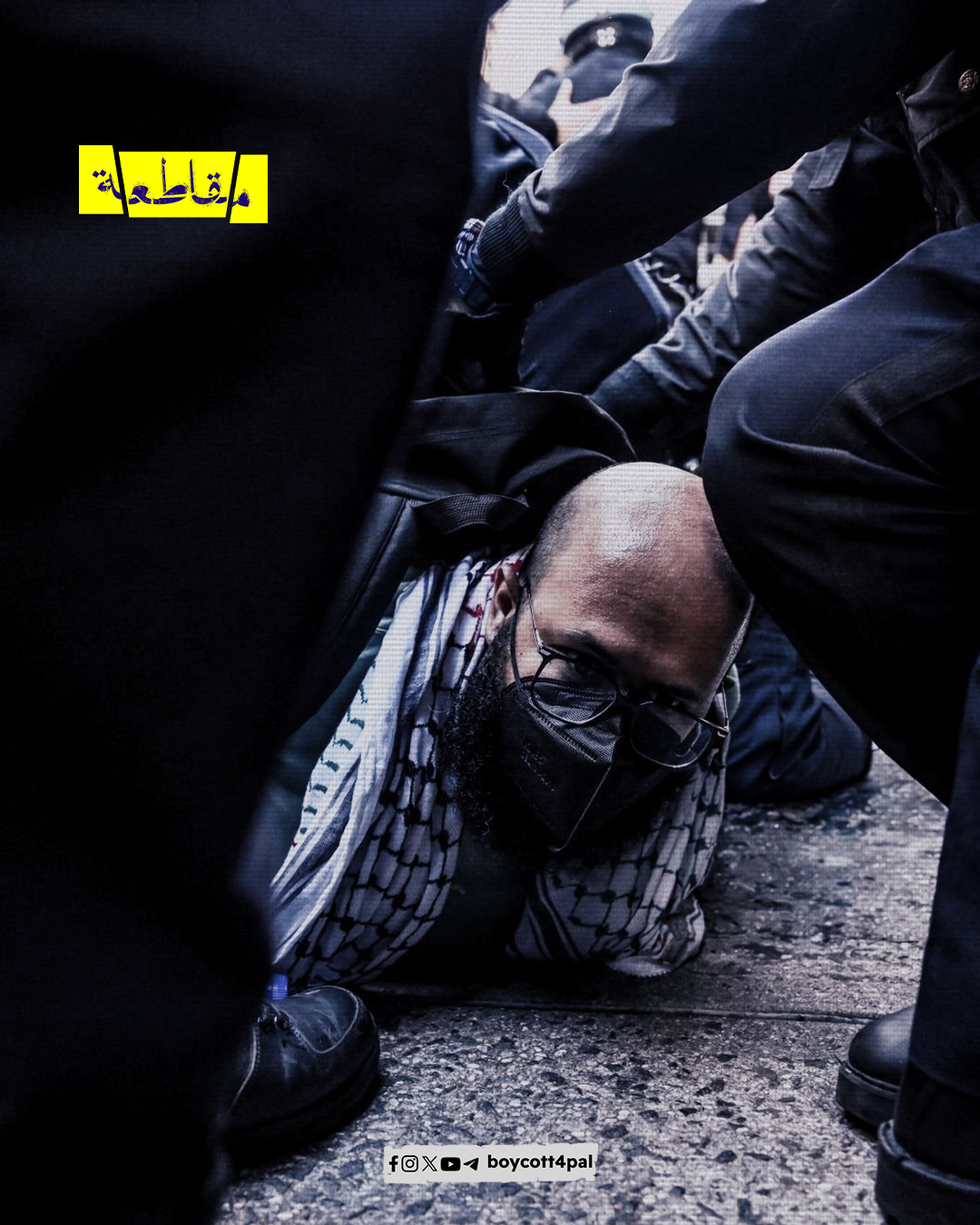 احتجز ضباط الشرطة بعض المتظاهرين الذين يحملون الأعلام واللافتات الفلسطينية أثناء تدخلهم في المظاهرة المؤيدة للفلسطينيين التي أقيمت في ساحة هيرالد في نيويورك.