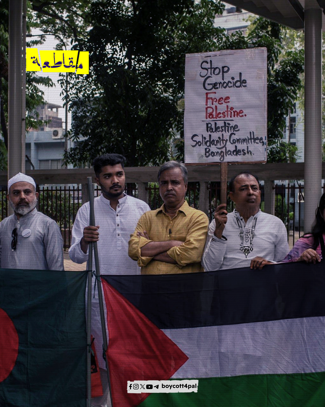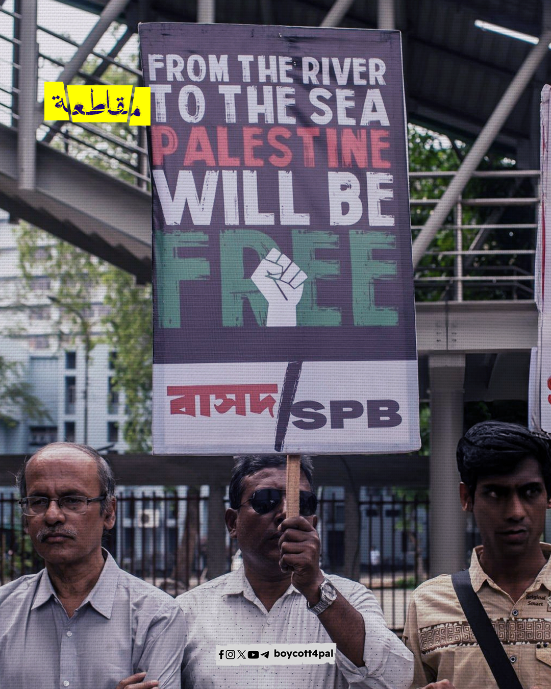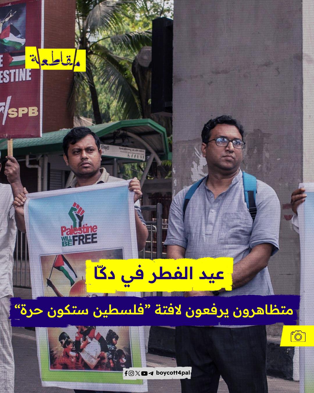 حمل المتظاهرون في العاصمة البنغلاديشية لافتة كتب عليها "من النهر إلى البحر ستكون فلسطين حرة"، وذلك خلال احتفال مجتمعي بالعيد حمل طابعًا تضامنيًا مع غزة أعرب عن رفضه للحرب وقتل المدنيين.