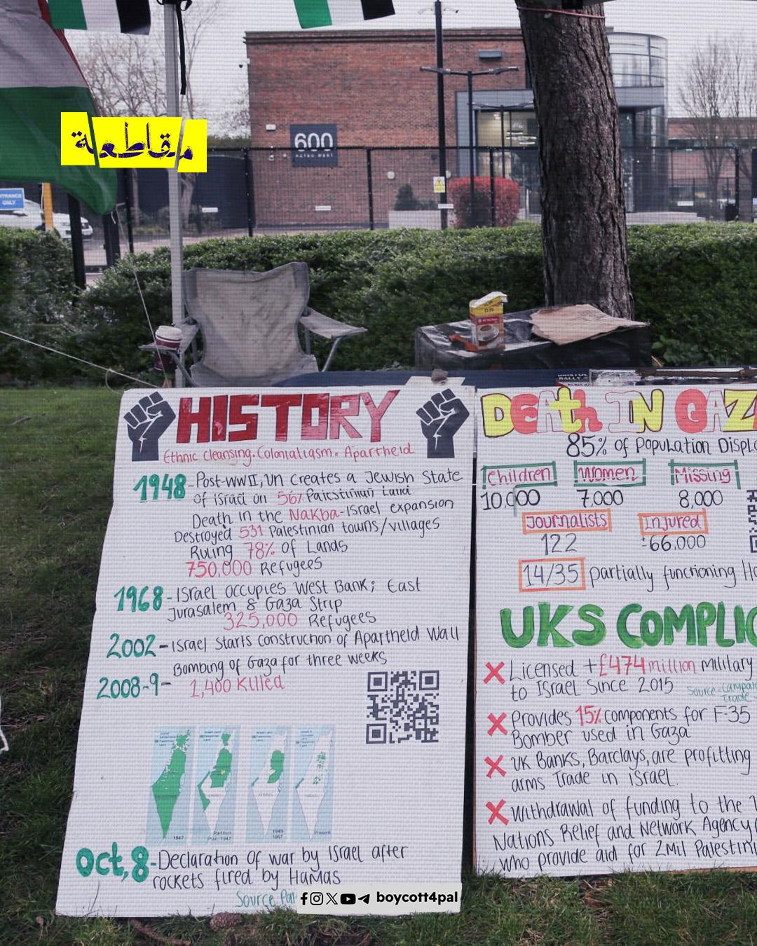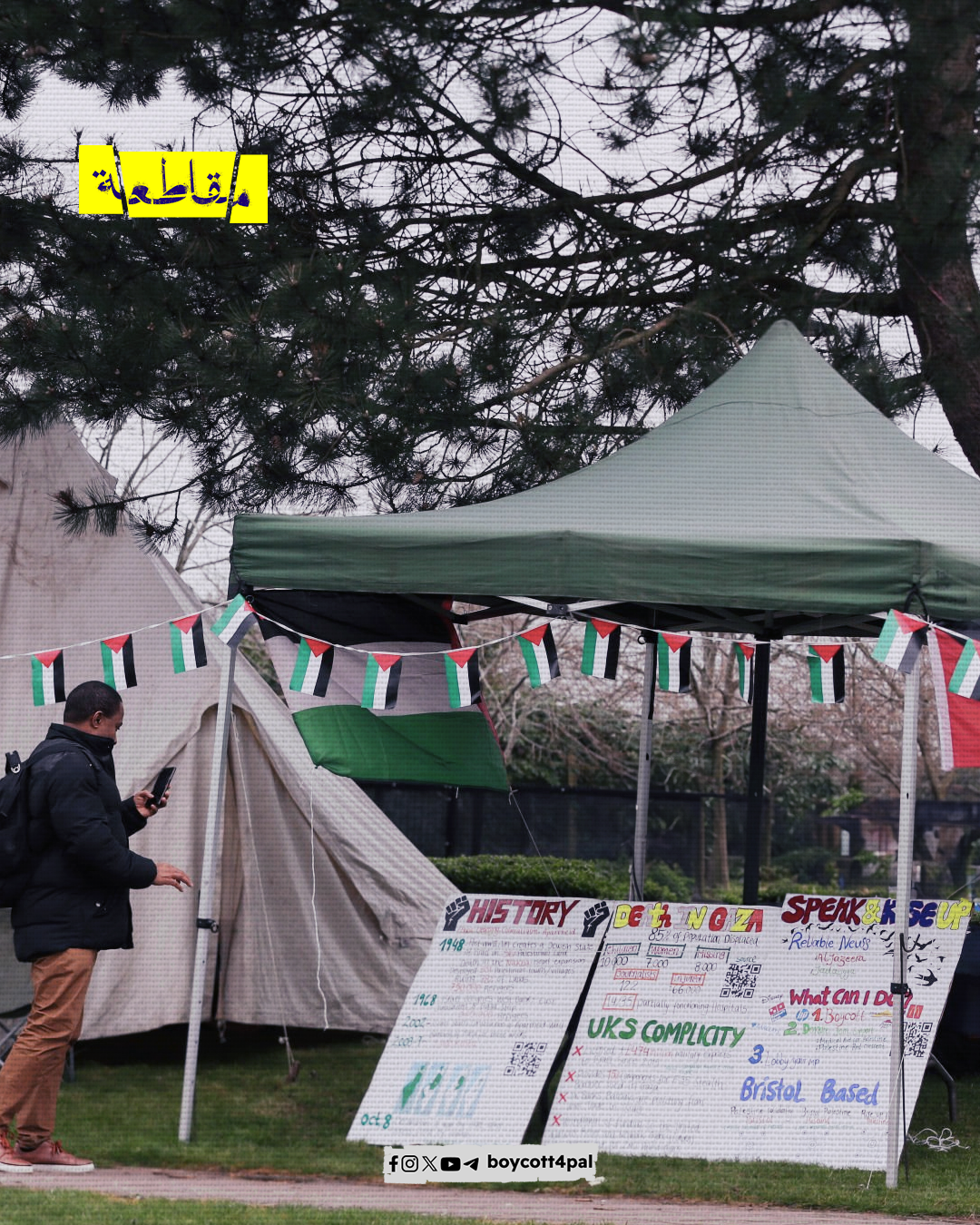 أقام أنصار العمل الفلسطيني مخيم احتجاج خارج شركة الأسلحة الإسرائيلية، إلبيت سيستمز في بريستول، ويقول المتظاهرون إن 85% من الطائرات بدون طيار التي تحلق في صفوف قوات الدفاع الإسرائيلية مقدمة من الشركة.