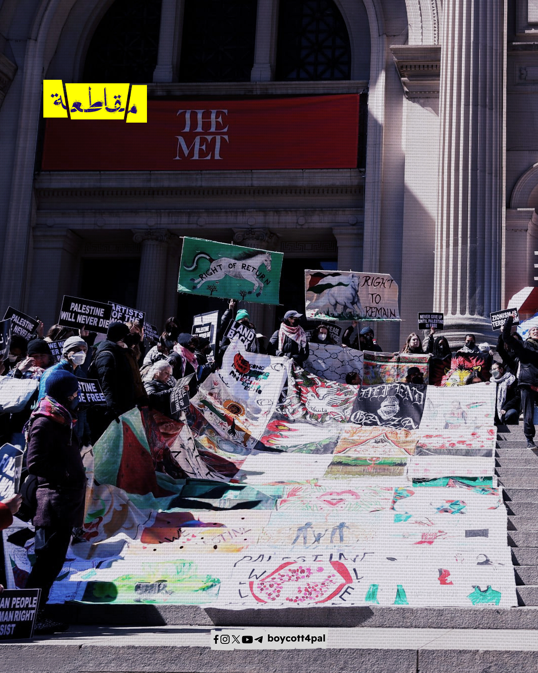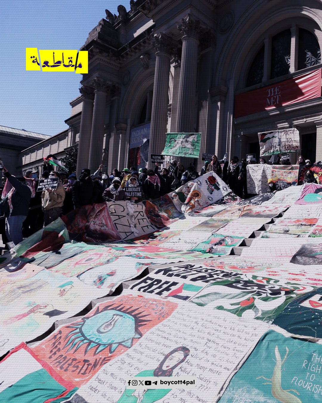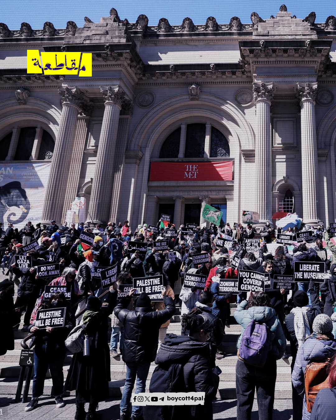 بدلاً من أن تكون ساحات المتاحف صامتة كعادتها، تجمع المئات من المؤيدين للفلسطينيين، حاملين لافتات وأعلام، على درجات متحف متروبوليتان، ورفع المحتجون عشرات الشعارات المؤيدة لغزة والرافضة لحرب الاحتلال الإسرائيلي وجرائمه.
