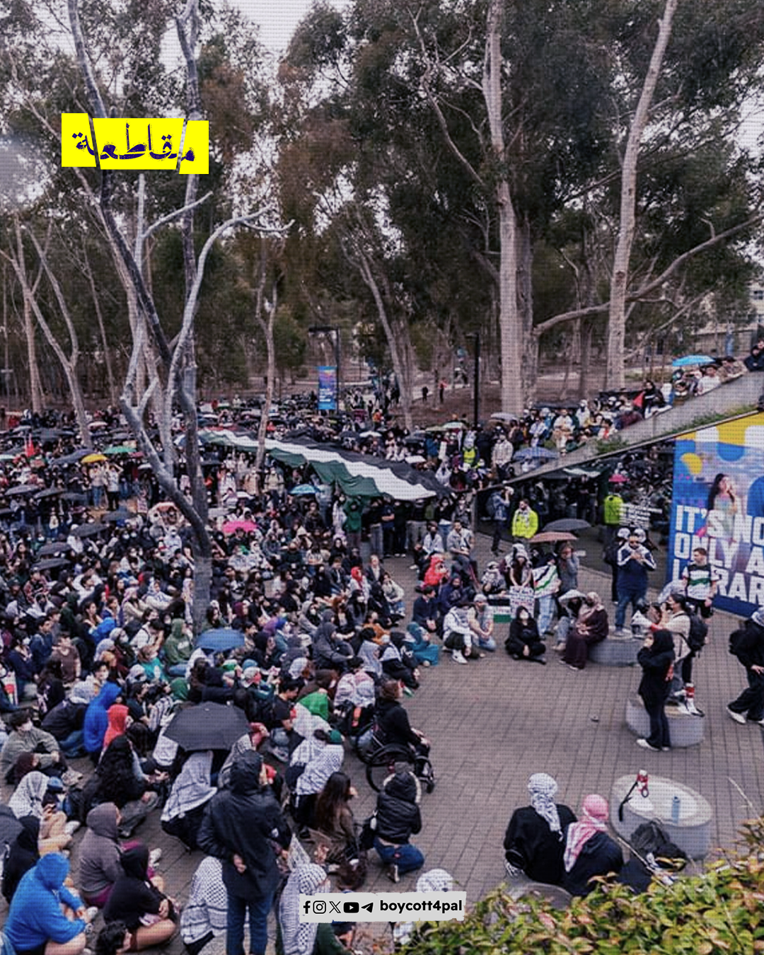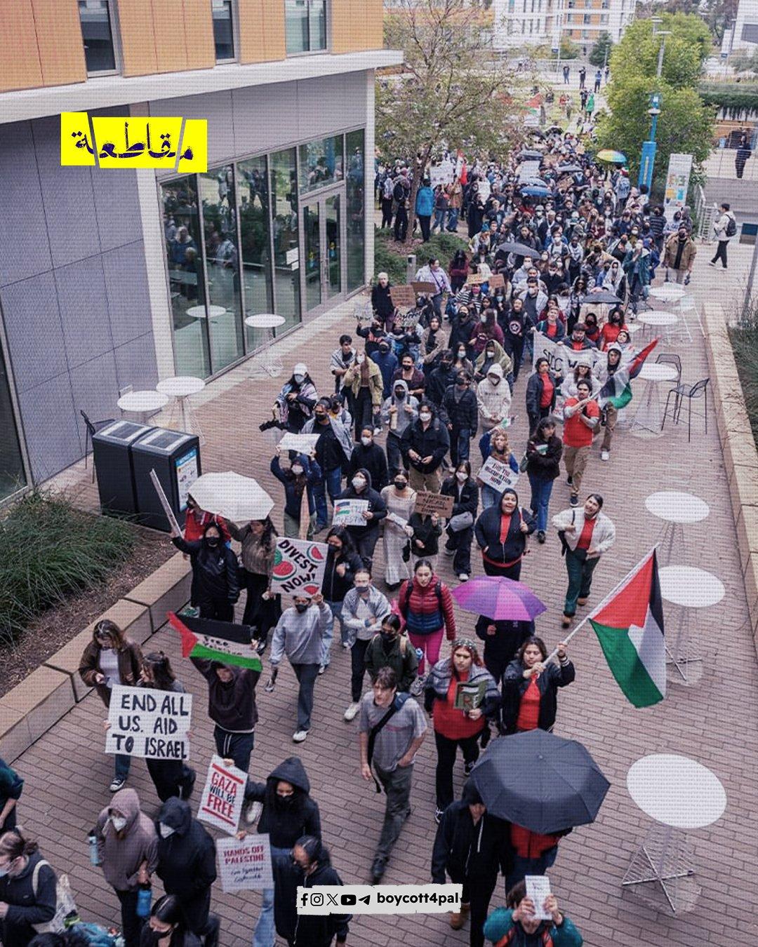 شهد حرم الجامعة في سان دييغو تظاهرة كبيرة نظمتها جماعة طلاب من أجل العدالة في فلسطين، وقبيل الاحتجاج، أرسلت الجامعة إخطارًا يفيد بتعزيز الإجراءات الأمنية في الحرم الجامعي، كما حاول بعض الأساتذة التواصل مع قيادة الجامعة وسيناتور الولاية توني أتكينز لإلغاء الاحتجاج في وقت مبكر.