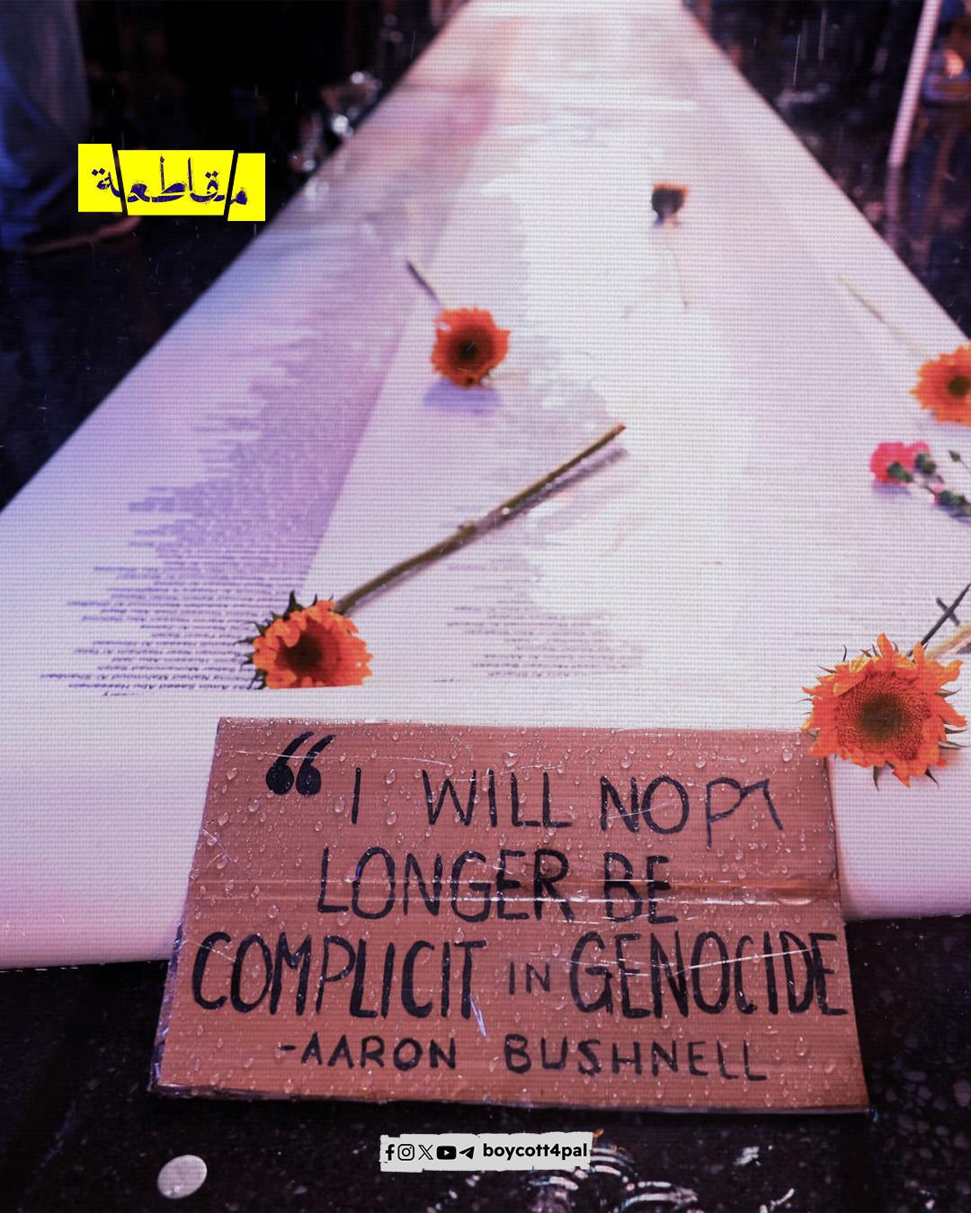 وفي 25 فبراير 2024، قام آرون بوشنل، وهو عضو نشط في الجيش الأمريكي يبلغ من العمر 25 عامًا، بالتضحية بنفسه خارج السفارة الصهيونية في واشنطن العاصمة وأشعل النار في نفسه احتجاجًا على تواطؤ الولايات المتحدة المستمر في الإبادة.