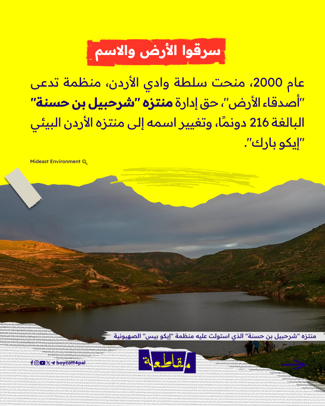 كان يسمى منتزه “شرحبيل بن حسنة”، فانتزعوه ومُنح لمنظمة صهيونية، وتحوّل اسمه إلى “منتزه الأردن البيئي - إيكو بارك”، وصار قاعدة للأنشطة التطبيعية، ومحفلًا لشرعنة وجود الاحتلال وفرضه علينا.