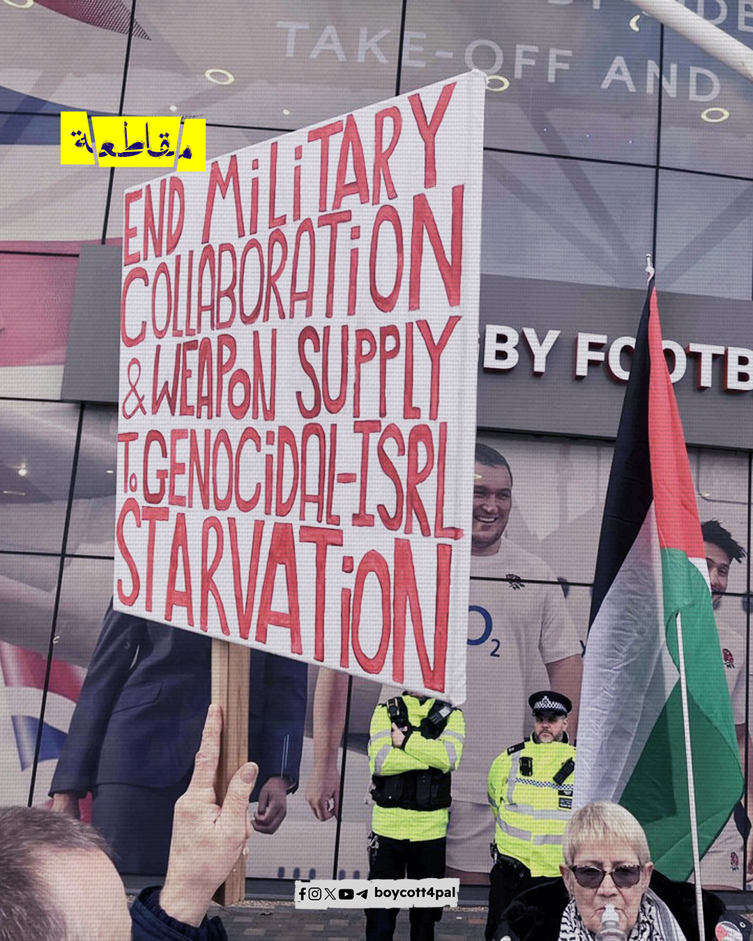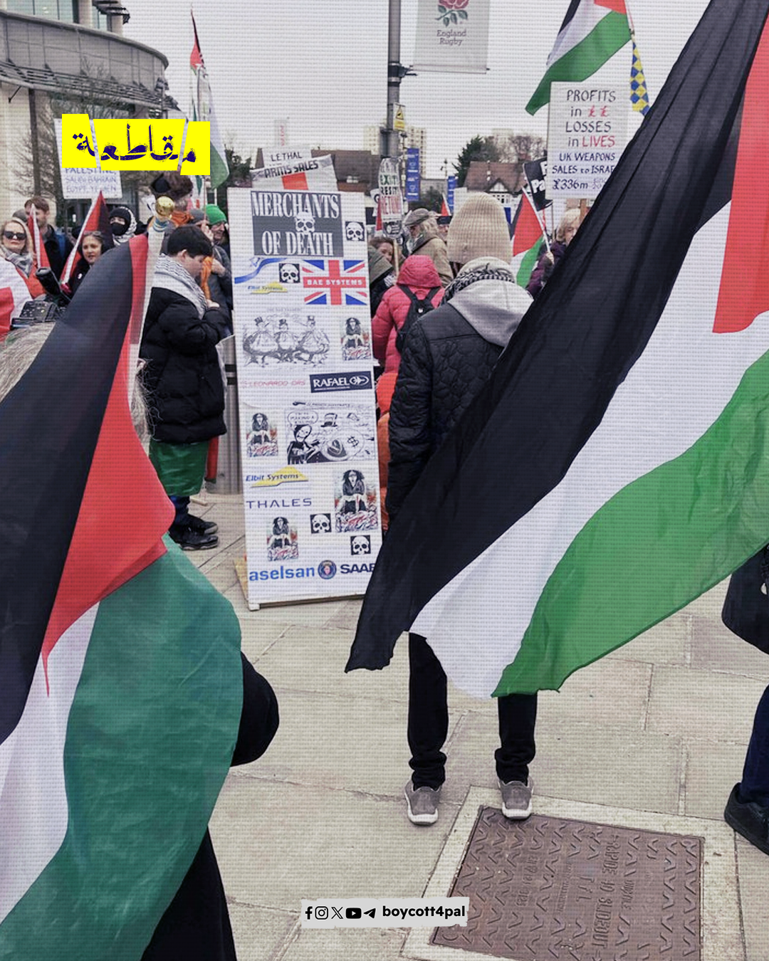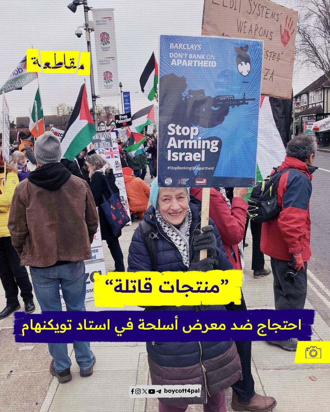 احتج ناشطون ضد معرض أسلحة المروحيات العسكرية في تويكنهام في إنجلترا حيث يشارك في المعرض شركات متعددة متورطة في الإبادة الجماعية الإسرائيلية للفلسطينيين في غزة، بما في ذلك شركة لوكهيد مارتن وبوينغ.