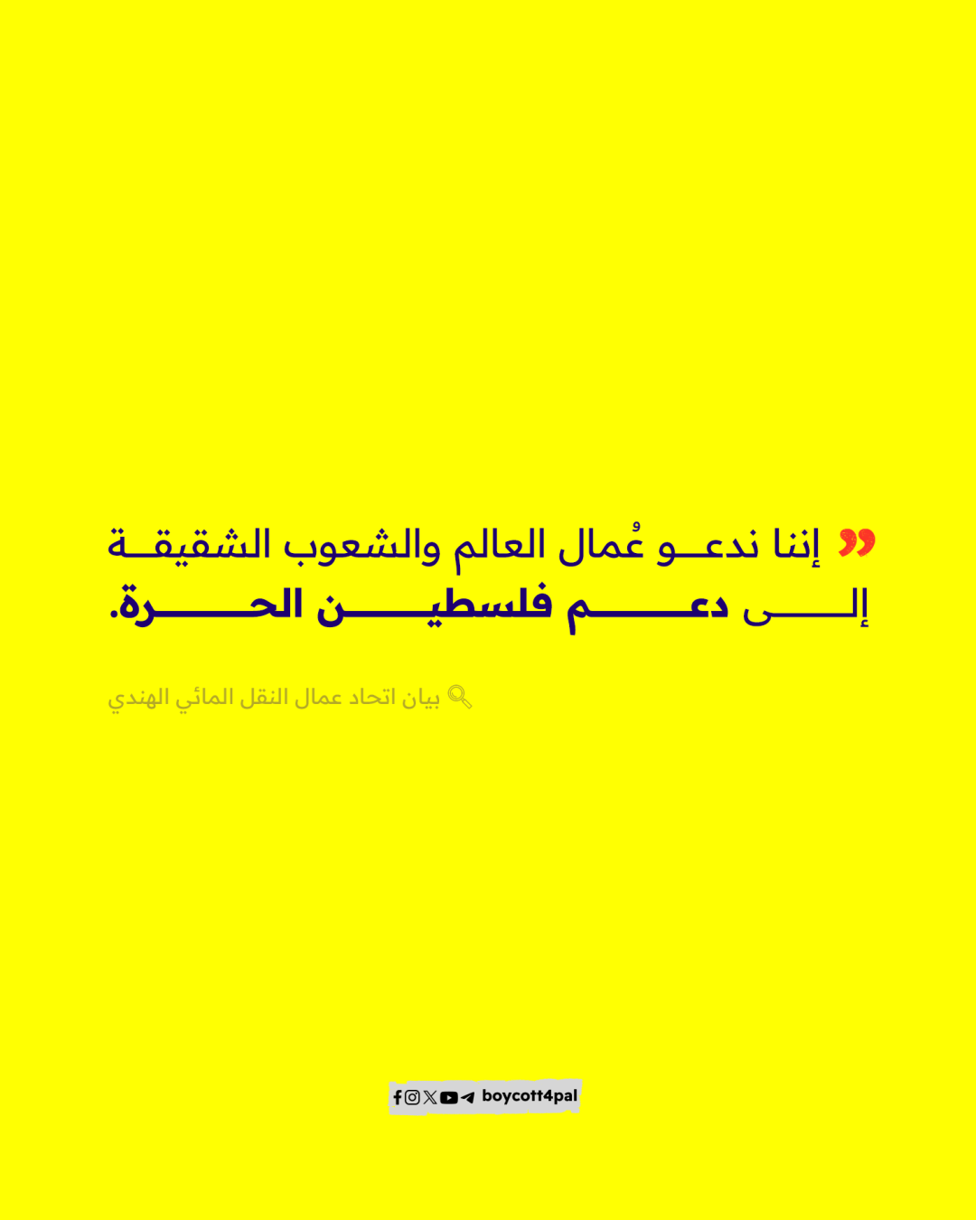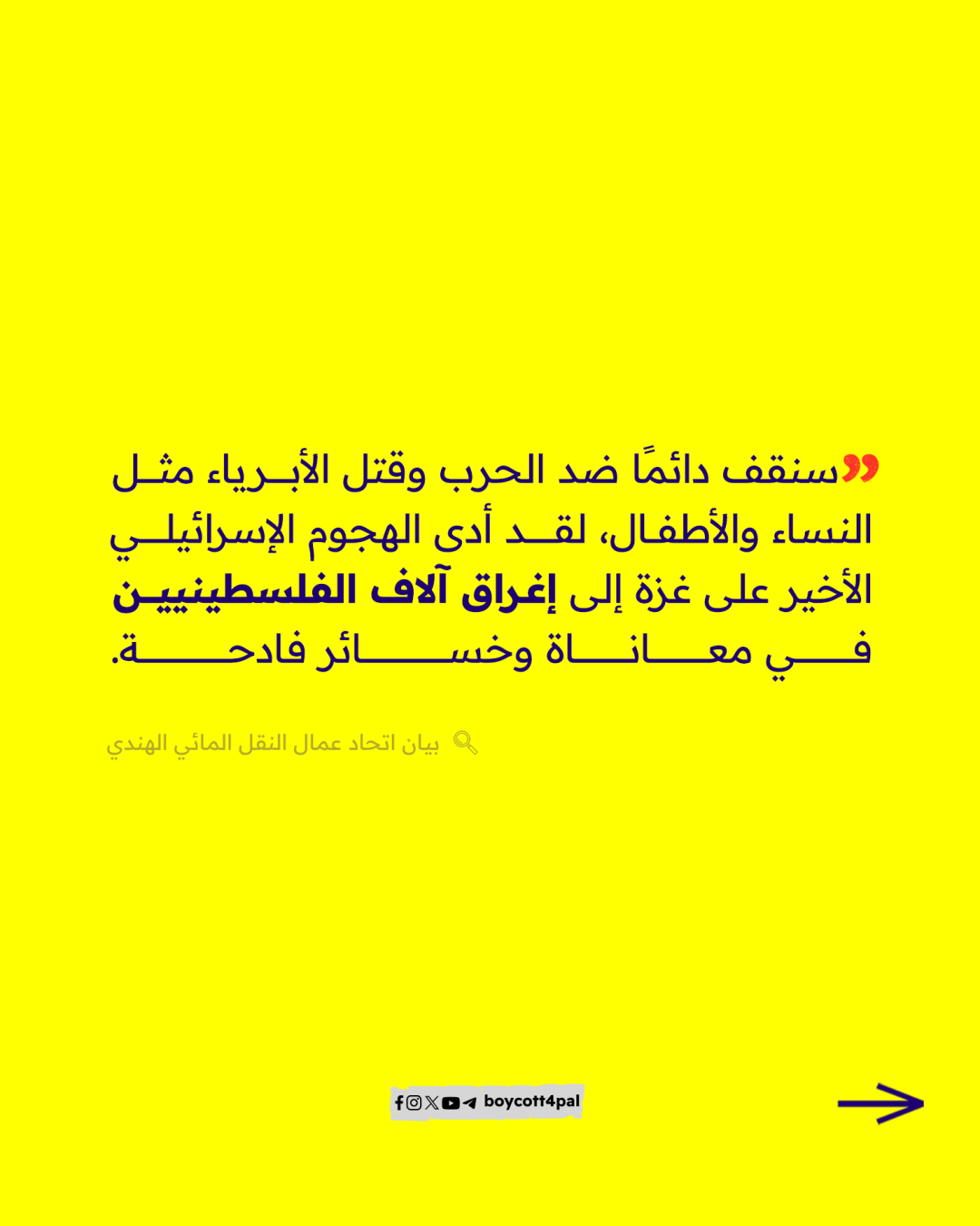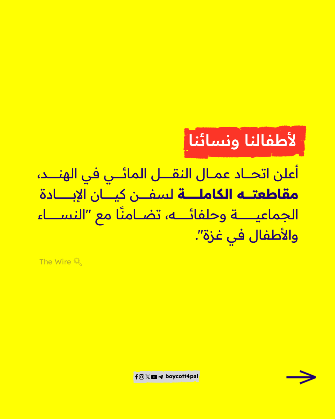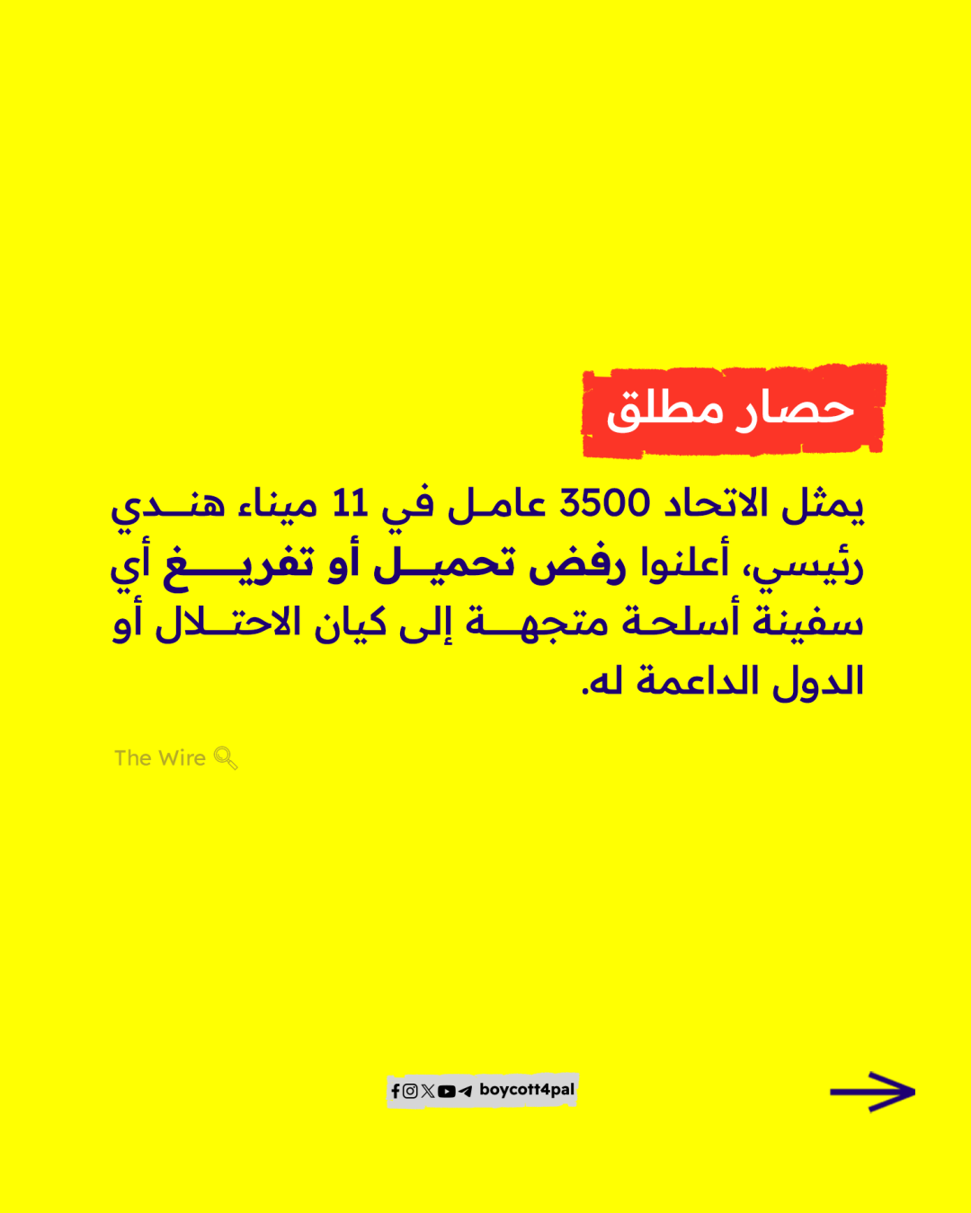 عُمال موانئ الهند، يصعّدون المواجهة، ويقدمون درسًا لأنظمة العار العربية، ولكل المتواطئين في تدشين الجسر البري المخصص لإنقاذ العدو من حصار الأحرار، ويفتحون الباب أمام النقابات والمنظمات العربية والعالمية لتخطو إلى الأمام في تصعيد المواجهة مع الاحتلال.