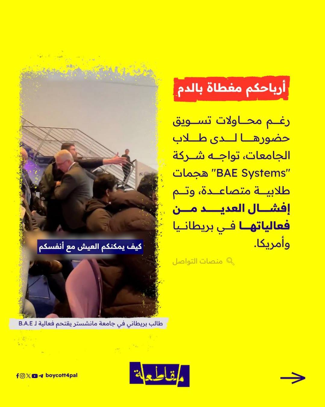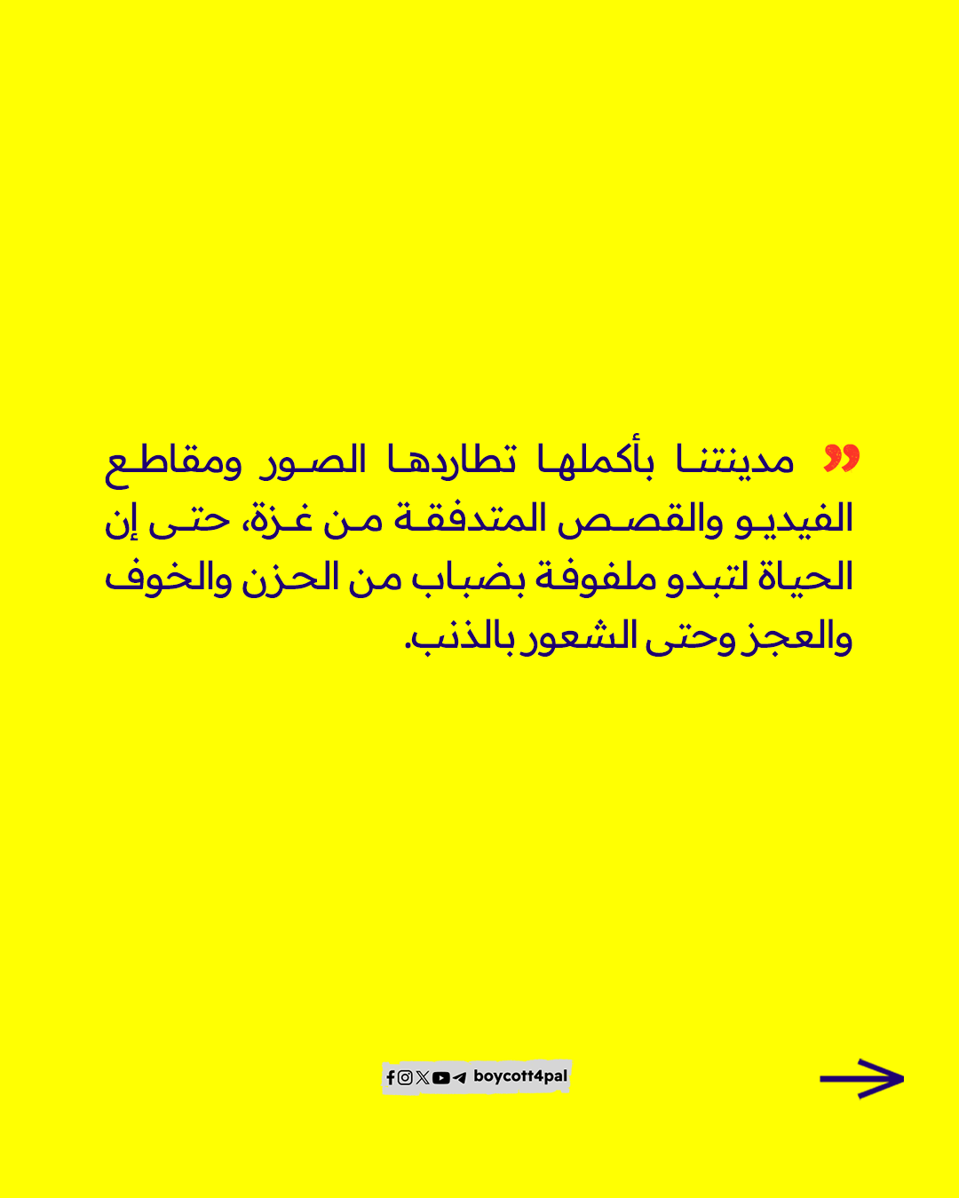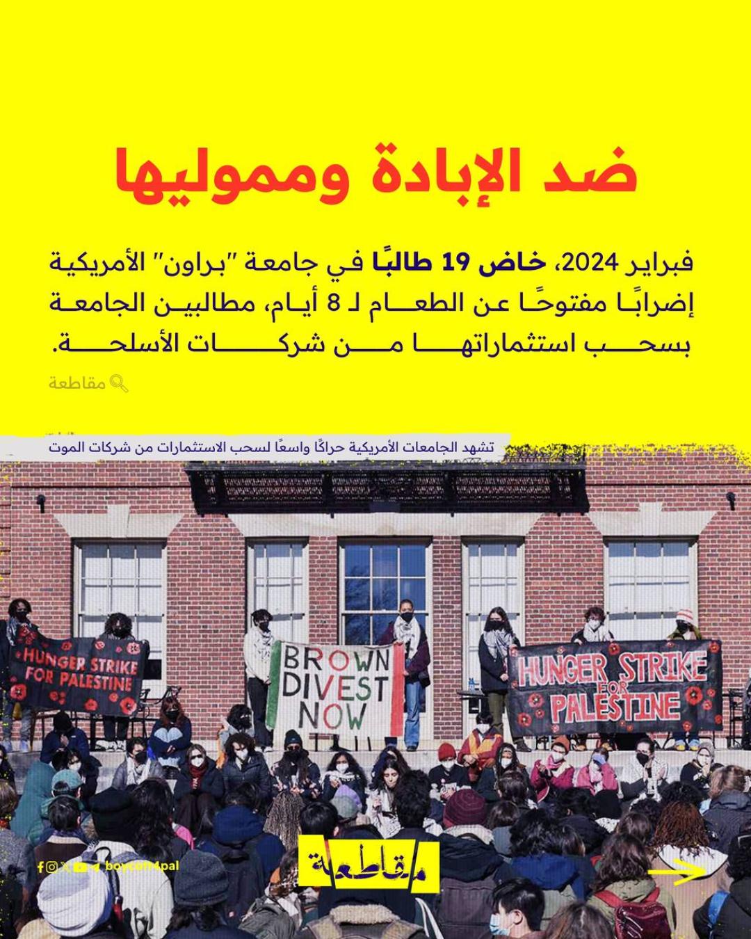الشعار الذي يعلو في كل حراك على الأرض أو في الجامعات ضد شركات الإبادة، وشرايين إمداد الاحتلال بالعتاد والذخائر الحربية المستخدمة في إفناء غزة وقتل عشرات آلاف الفلسطينيين.