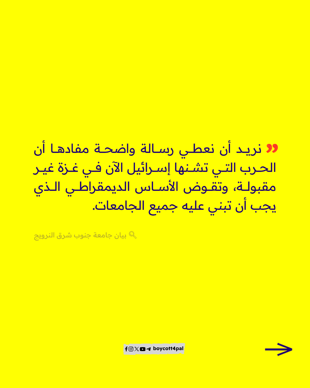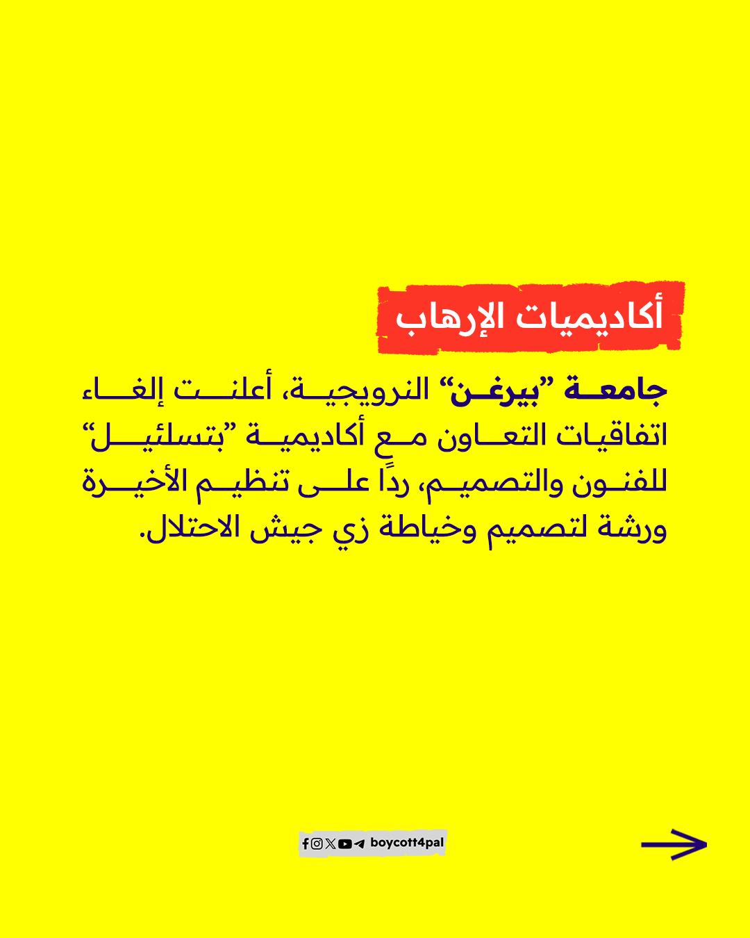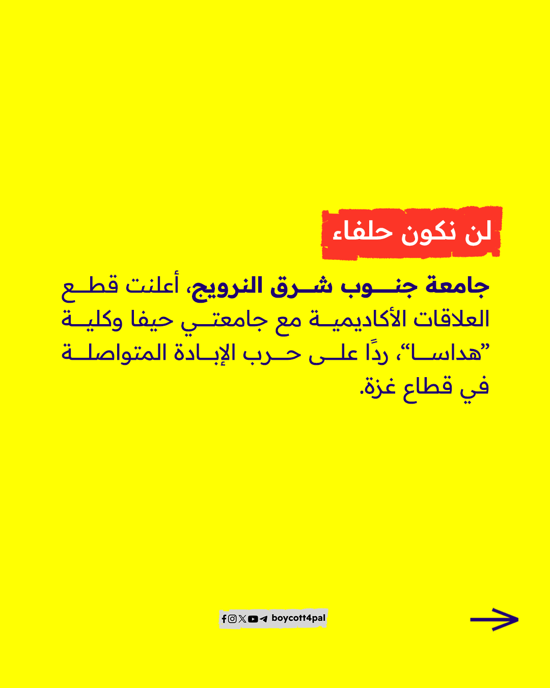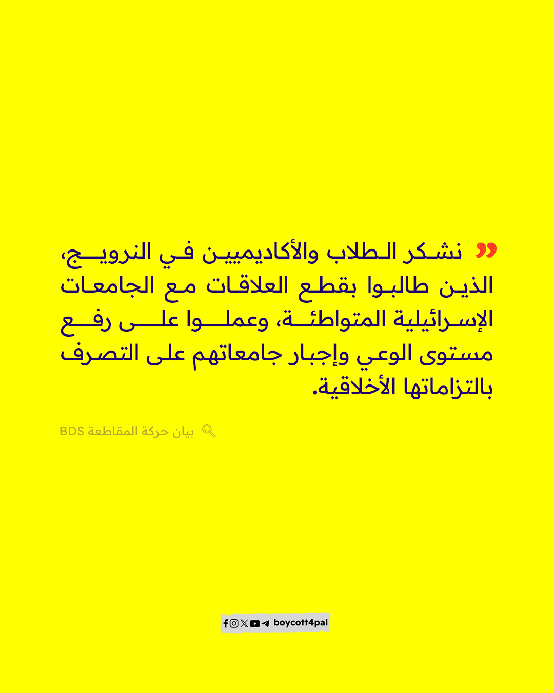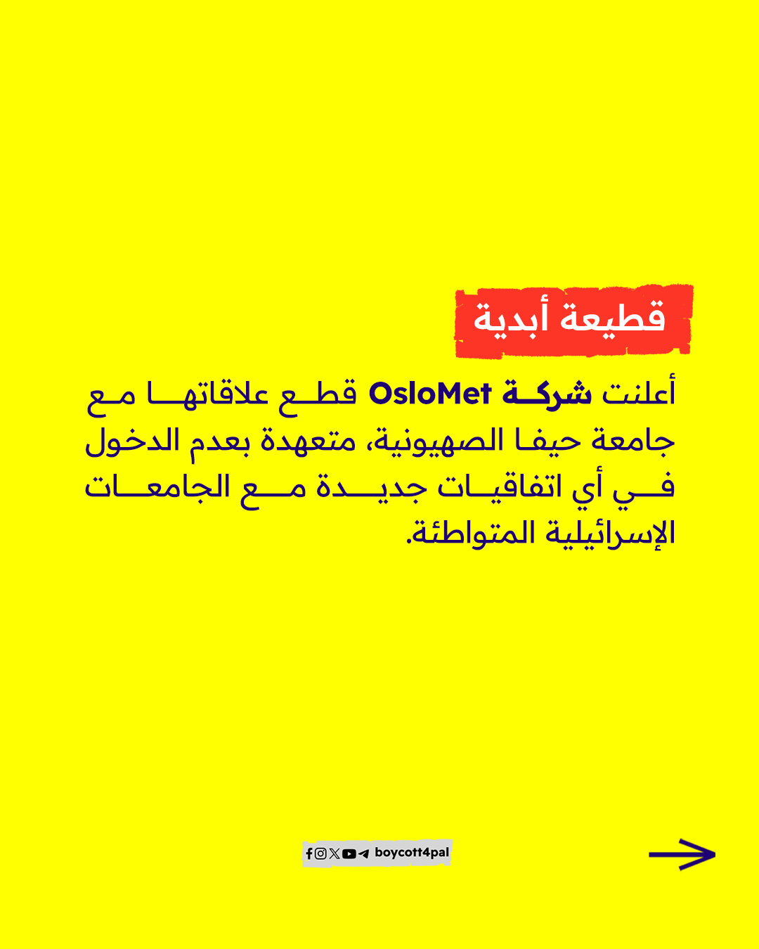 معركة المقاطعة الأكاديمية تشتد، والضغط الطلابي يثمر انتصارات متتالية، هذه المرة من النرويج التي قطعت 4 مؤسسات أكاديمية فيها إلى غير رجعة، علاقاتها وعقودها مع كيان الإبادة الجماعية، ومؤسساته الأكاديمية التي تخرج قتلة وإرهابيين.