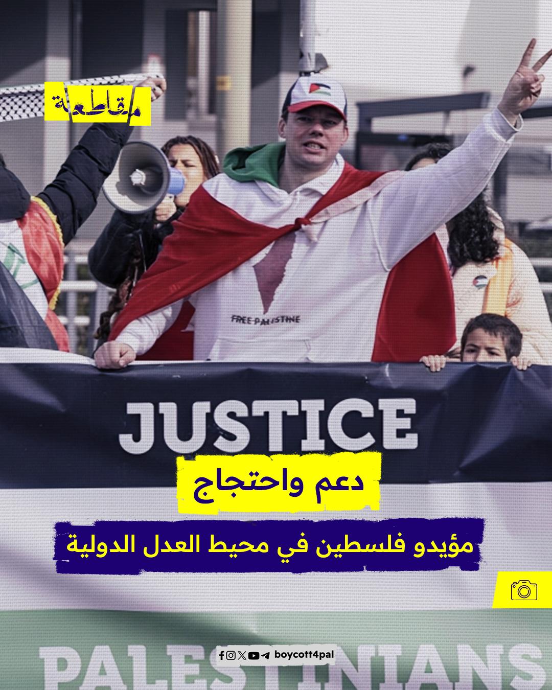 ينتظر المتضامنون حاملون أعلام فلسطين خارج قصر السلام التابع لمحكمة العدل حيث تستمر جلسات الاستماع بشأن الإجراءات الاستشارية للعواقب القانونية لممارسات “إسرائيل” في الأراضي الفلسطينية بمداخلات الوفود في لاهاي.